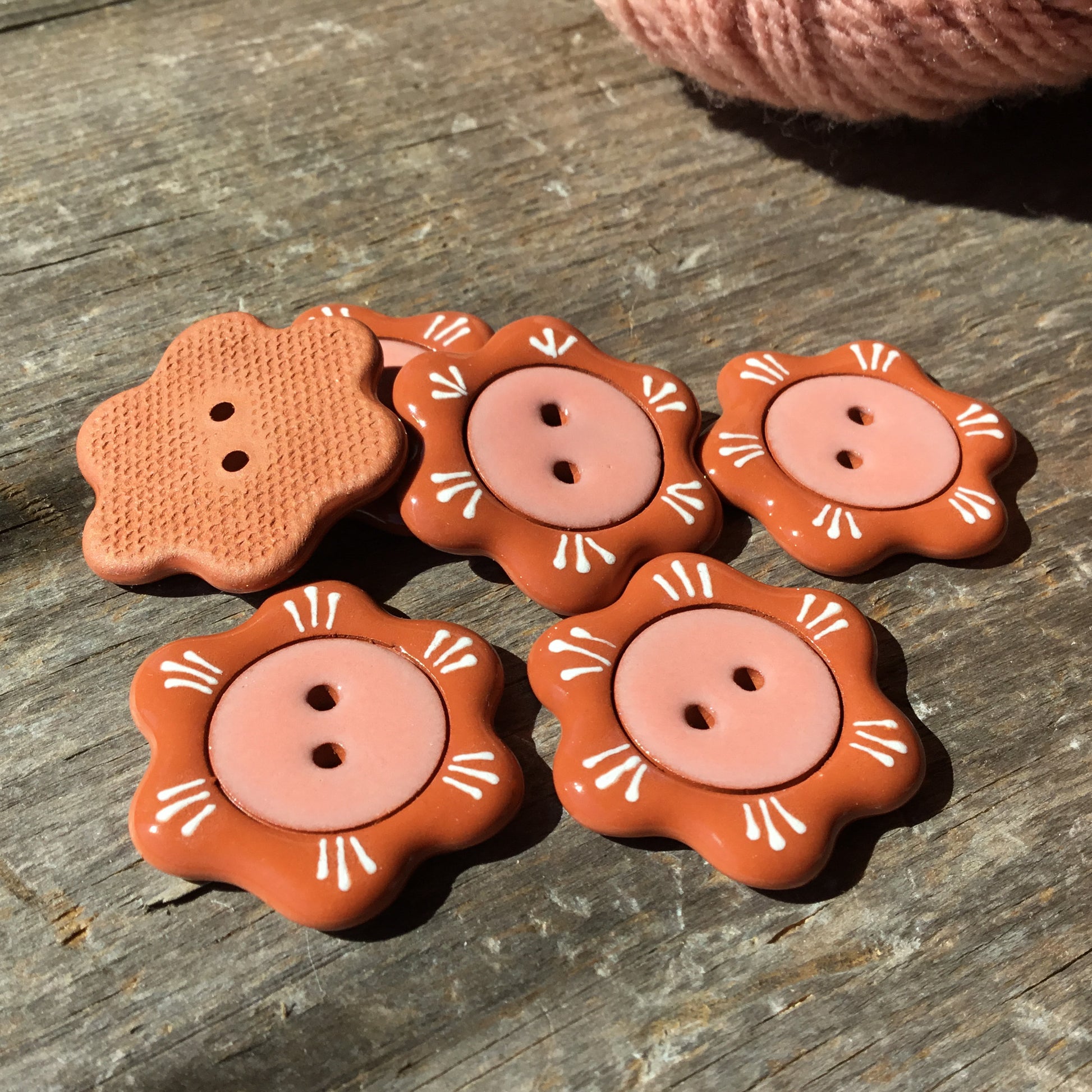 Each button and/or set is individually painted and one-of-a-kind. We sand all non-glazed edges for a smooth, snag-free surface.