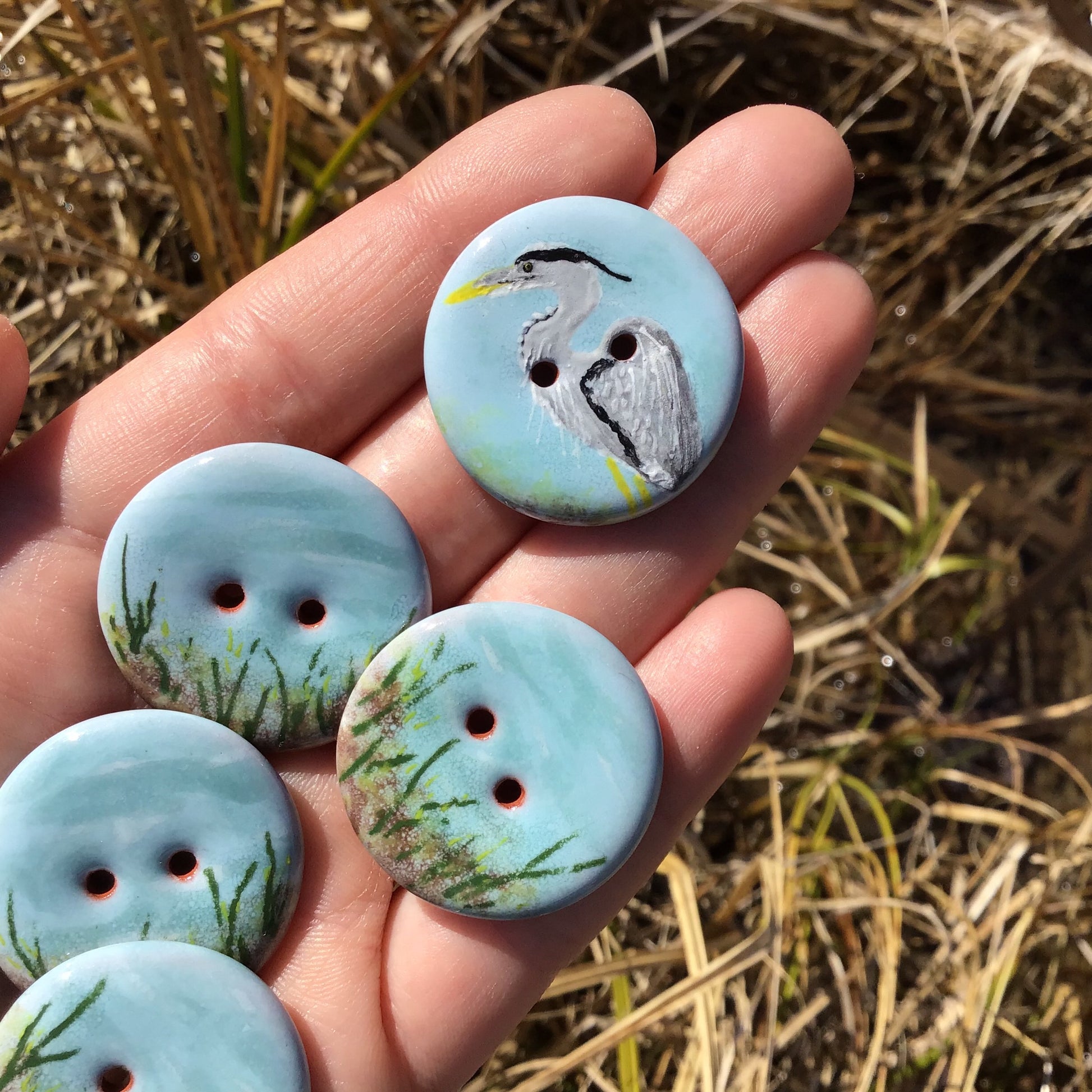 These buttons are one-of-a-kind and hand-painted on earthenware clay. They display a beautiful scene of a Blue Heron sitting by the waterside. This button pack is sure to add to the uniqueness of your handmade goods!