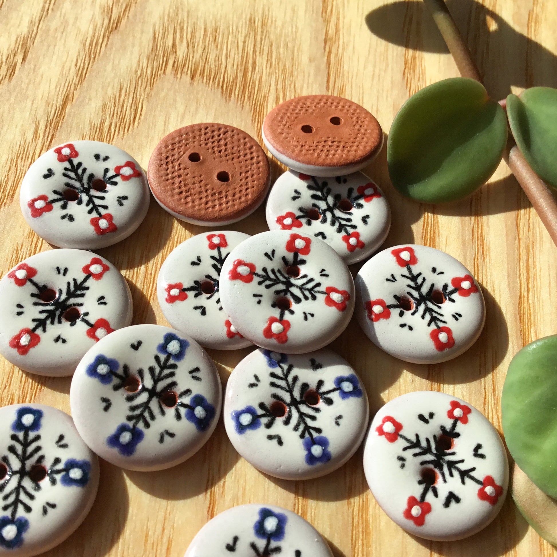 These hand-painted buttons display a small floral design with a Scandinavian flair.. They'd add a unique and sweet touch to your handwork!