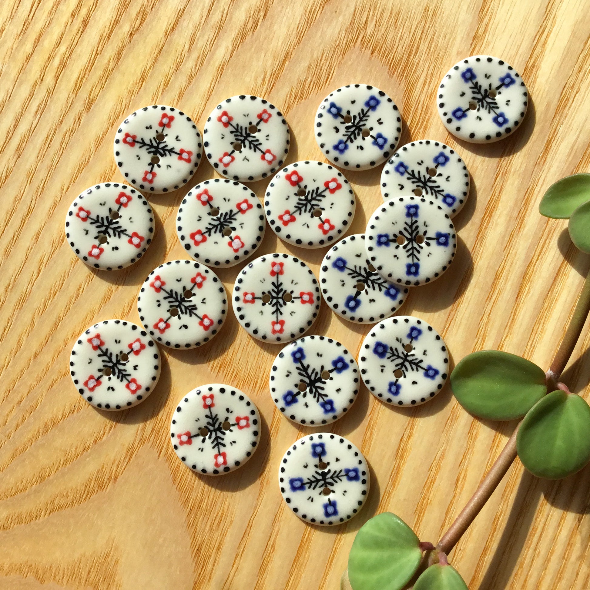These hand-painted buttons display a small floral design with a Scandinavian flair.. They'd add a unique and sweet touch to your handwork!