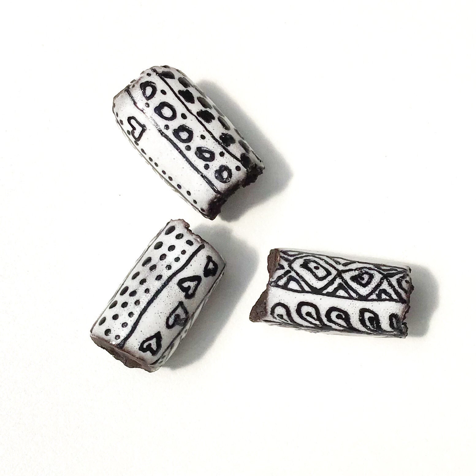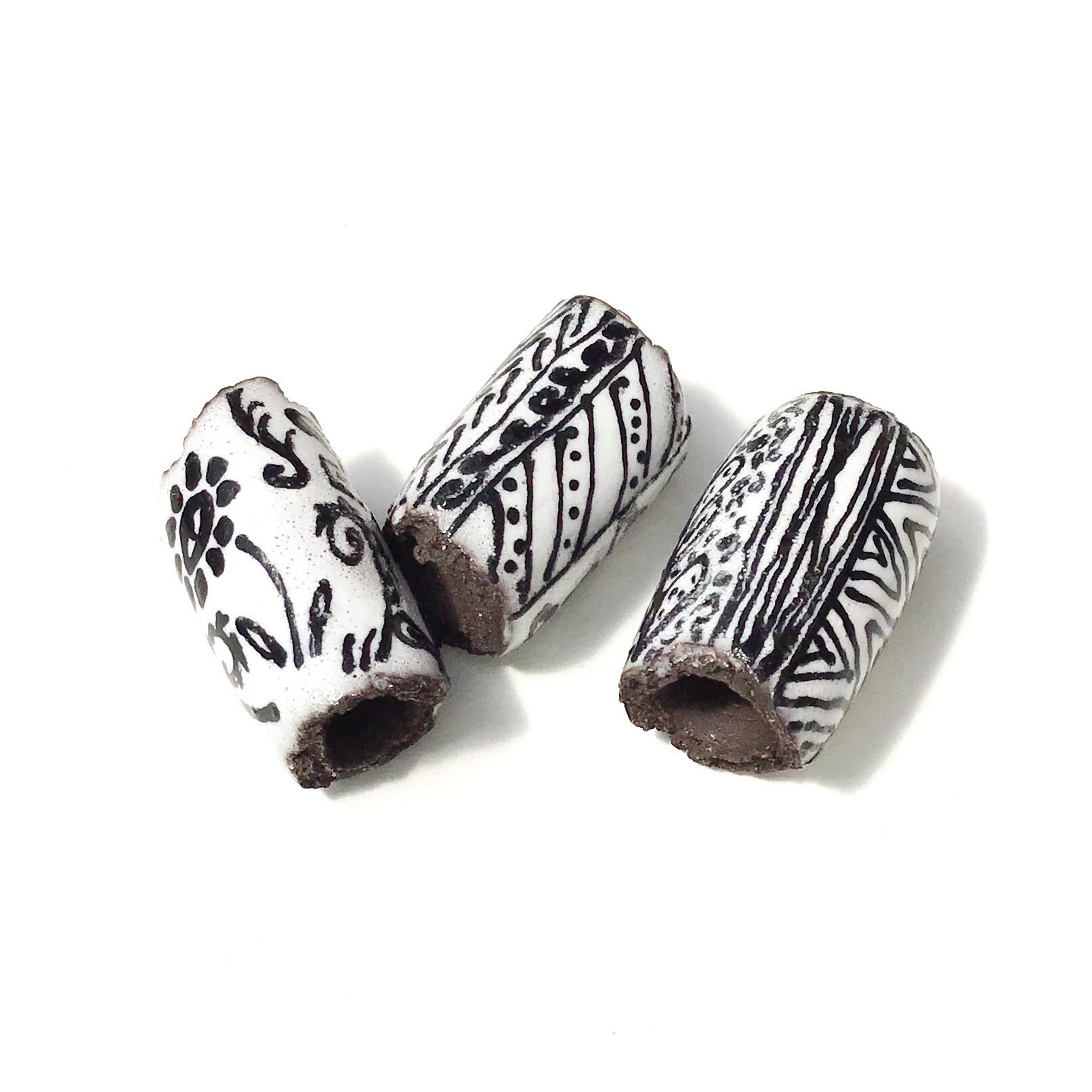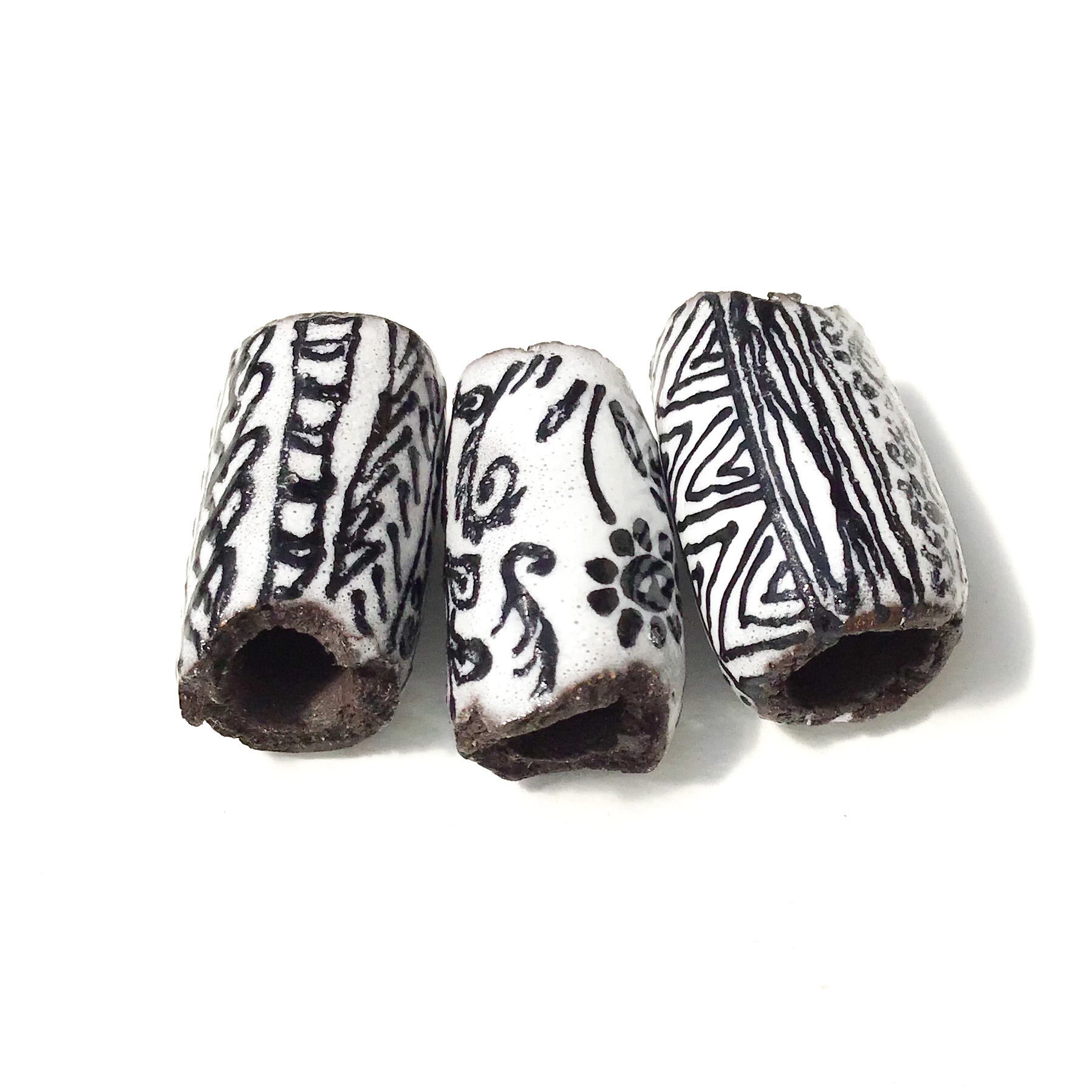 These black clay beads each have a unique handpainted design over white glaze. They are all one-of-a-kind. Each bead is rolled, hollowed out, and the clay is torn at the ends giving them a tattered-like appearance and rustic feel.