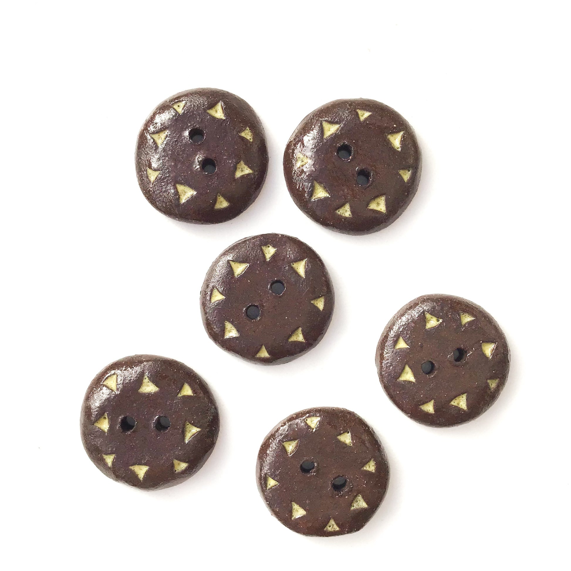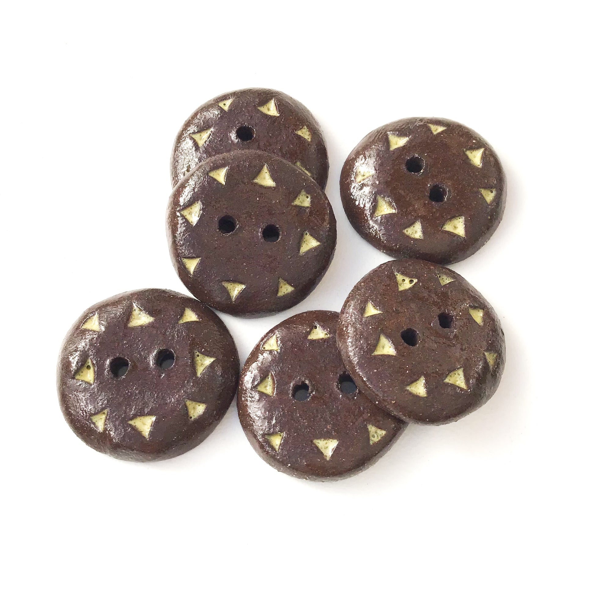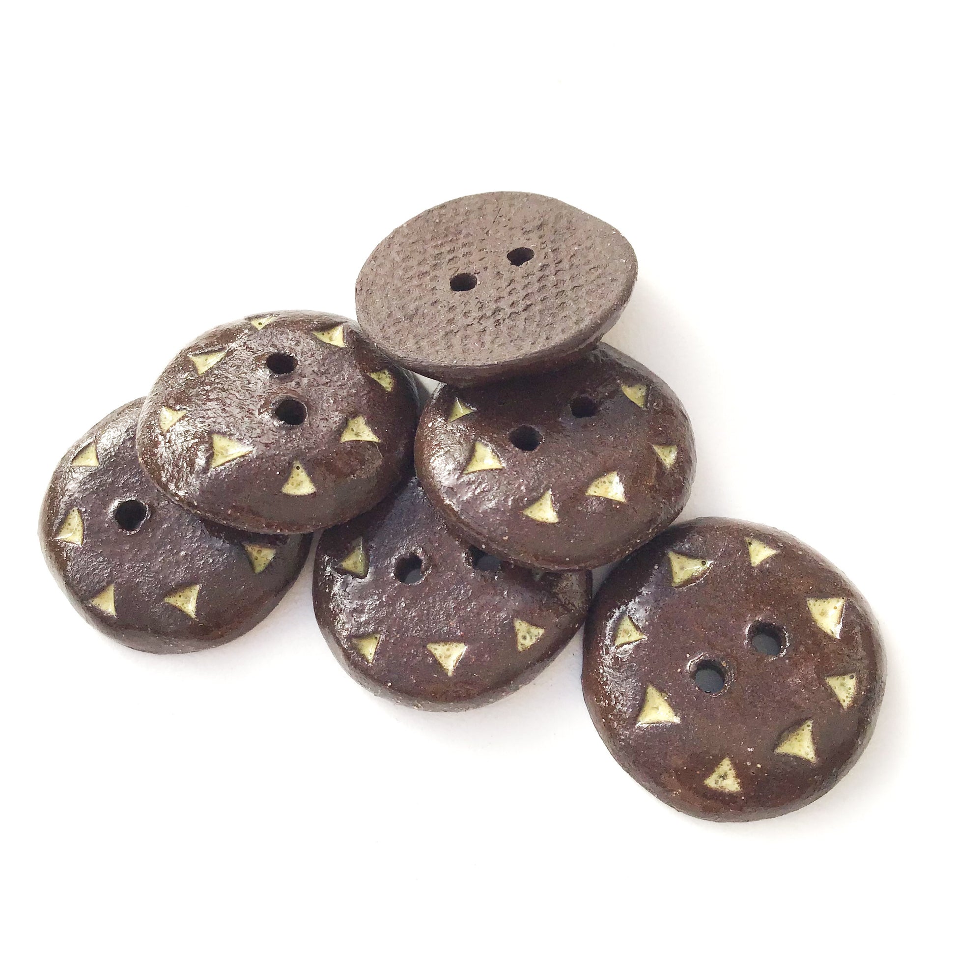These ceramic buttons are deeply colored and earthy. The dark clay body adds a rich touch. The sides are softly rounded for a hand-sculpted feel and the impressions are filled with warm glaze colors. They'd make a nice addition to your handwork!