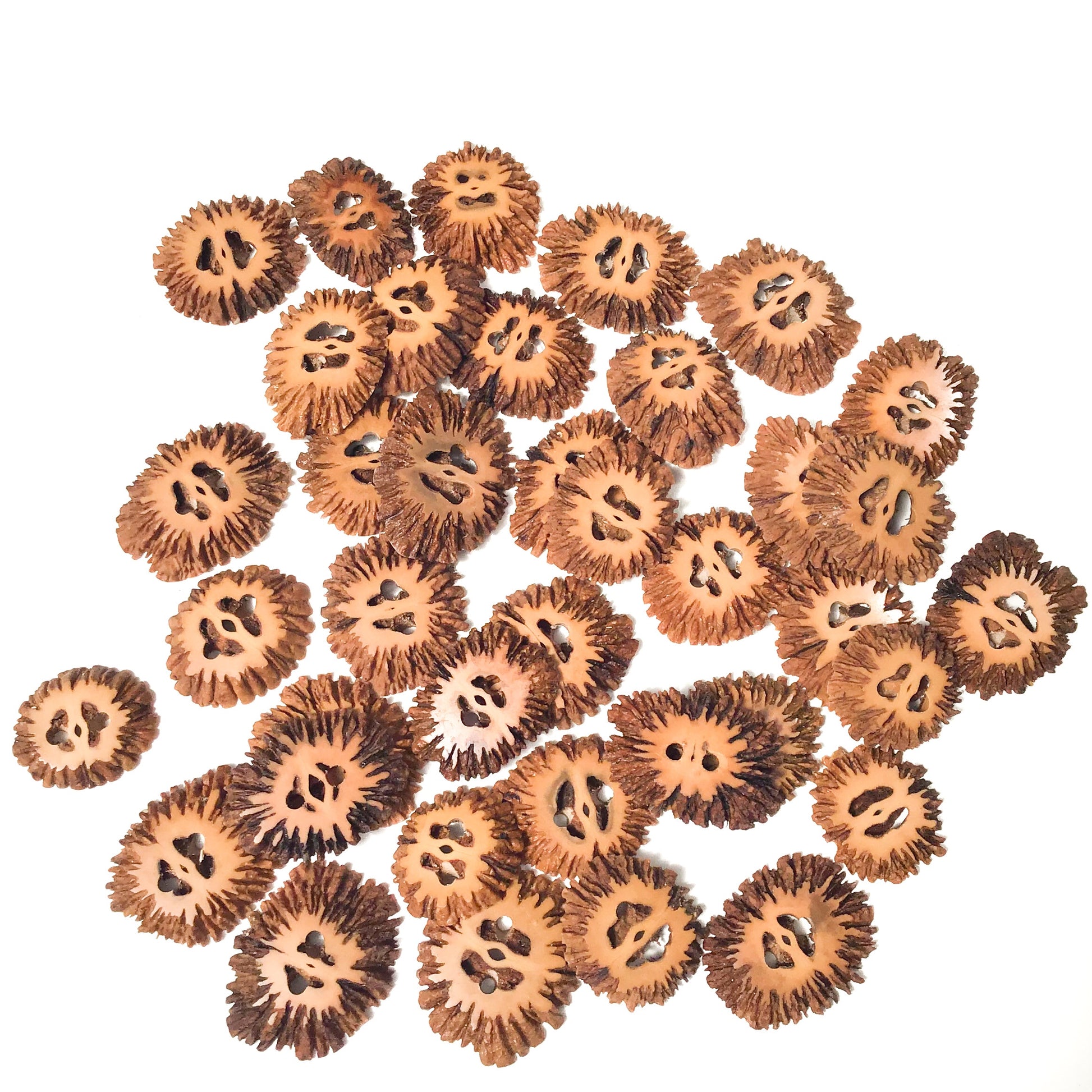 Each year the black walnut trees on our farm drop their giant lime green-colored balls containing their tasty nuts. Surrounding these nuts is a large, hard shell. Once these giant fruits are hulled, cleaned, and dried, we carefully slice them and remove the nutritious seed within. We then create these one-of-a-kind buttons by further cleaning, sanding, and coating in an all-natural oil and beeswax finish. The end product are these lovely, earthy buttons that will compliment any garment or accessory you put them to!