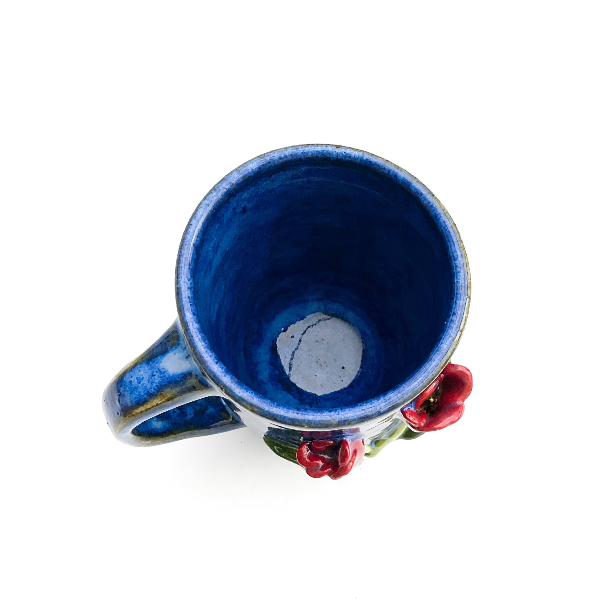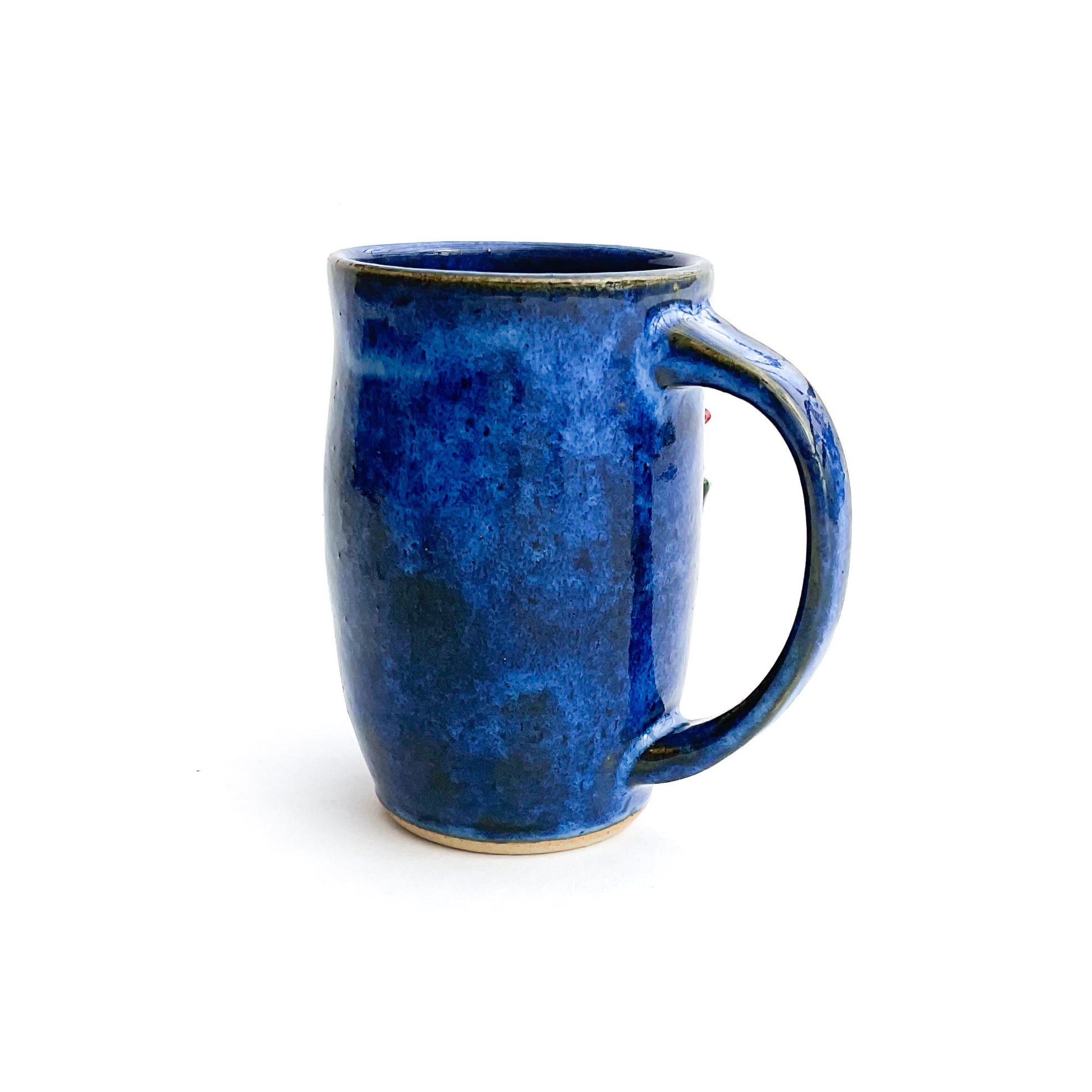 This unique hand sculpted flower mug, crafted by Hoof Print Pottery in southeast Ohio, is a one-of-a-kind masterpiece! Every detail of this original mug is skillfully made by hand, one petal, bud, and leaf at a time. After each small piece is sculpted it is adhered to the unfired mug using only clay and water. After the raw clay mug is thoroughly dried it is bisque fired in the kiln to 1,945°F. When the mug is cooled it is then hand painted and refired (glaze fired) to 2,300°F.