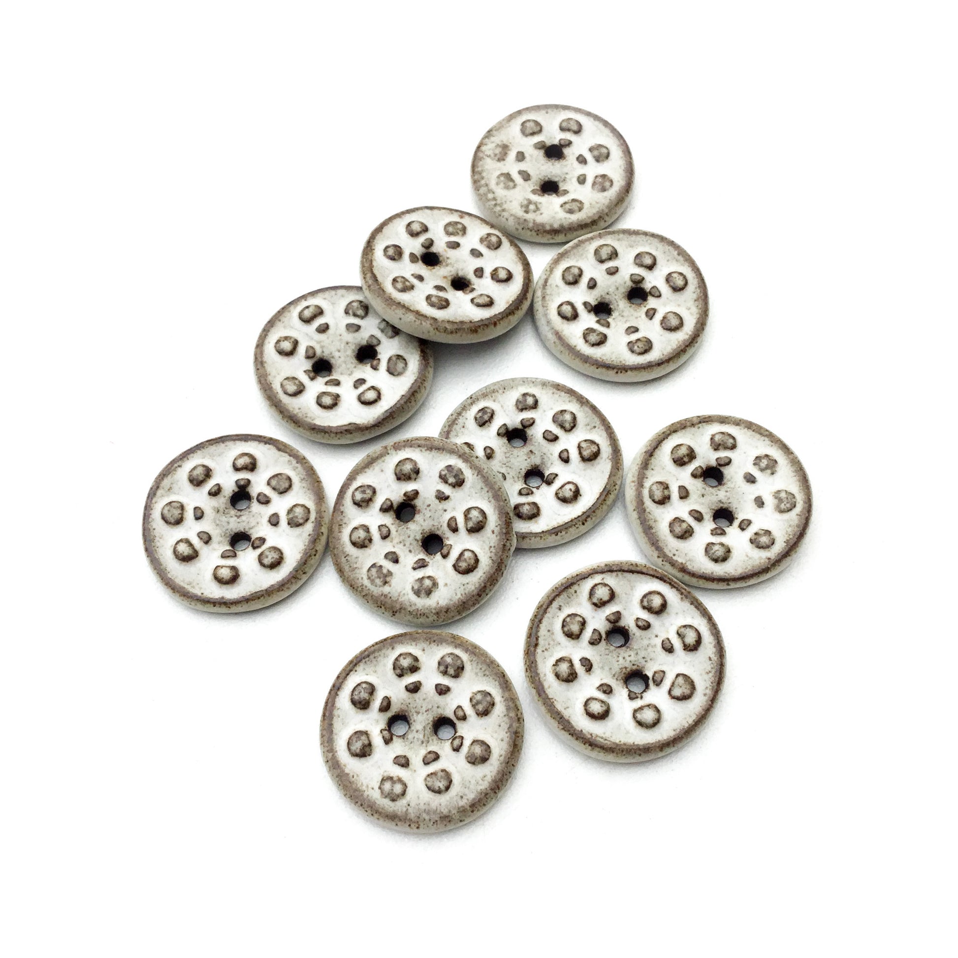 These uniquely hand stamped stoneware buttons on black clay have a rich, antiquated look. They'd add a lovely addition to any handcrafted project!
