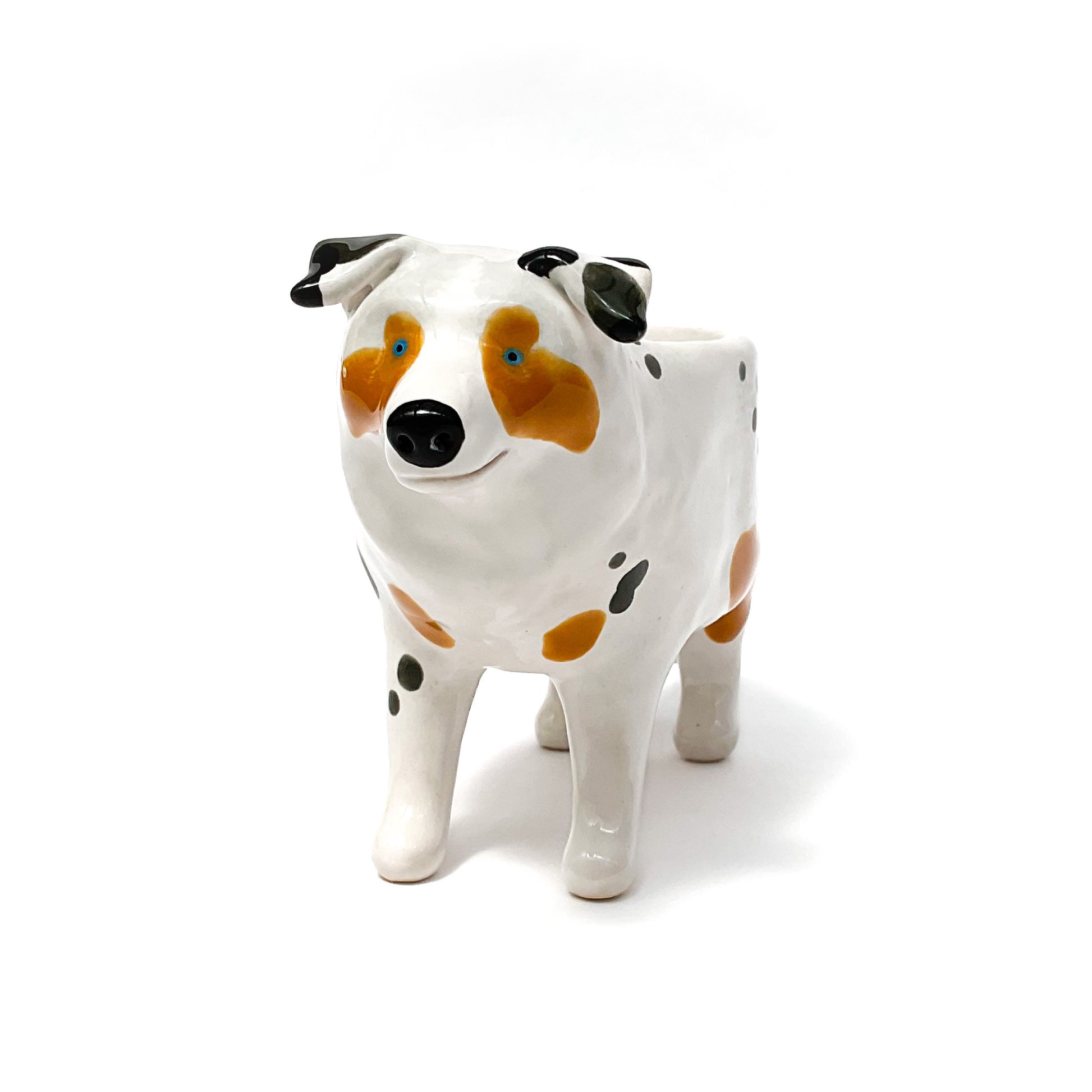 A ceramic Australian Shepard dog planter to pot up your favorite plant. This dog pot would also make a sweet candy or keepsake bowl.