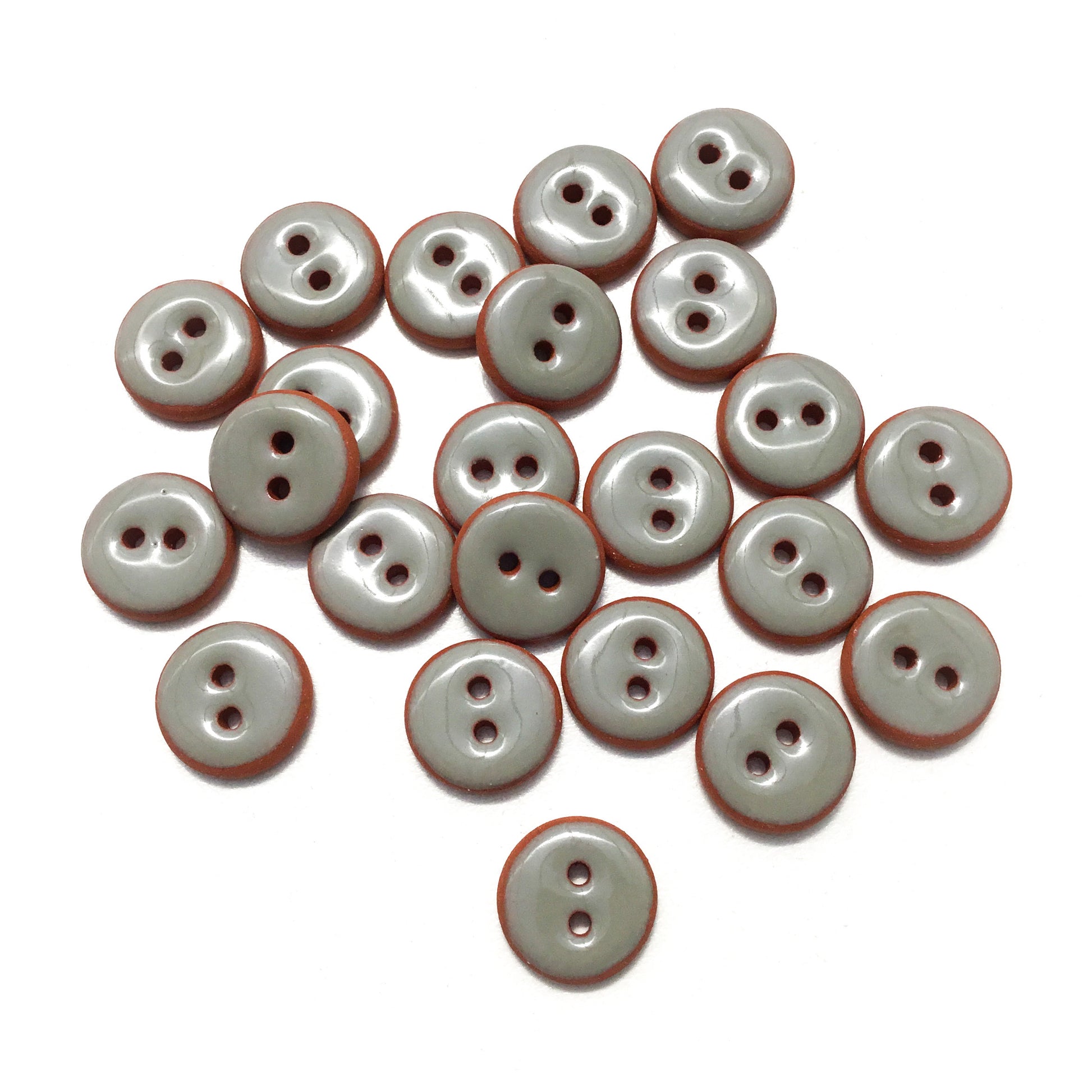 Round, gray ceramic buttons on red clay. The edges are softly rounded for a nice feel in the hand. The red clay provides a richly colored halo.