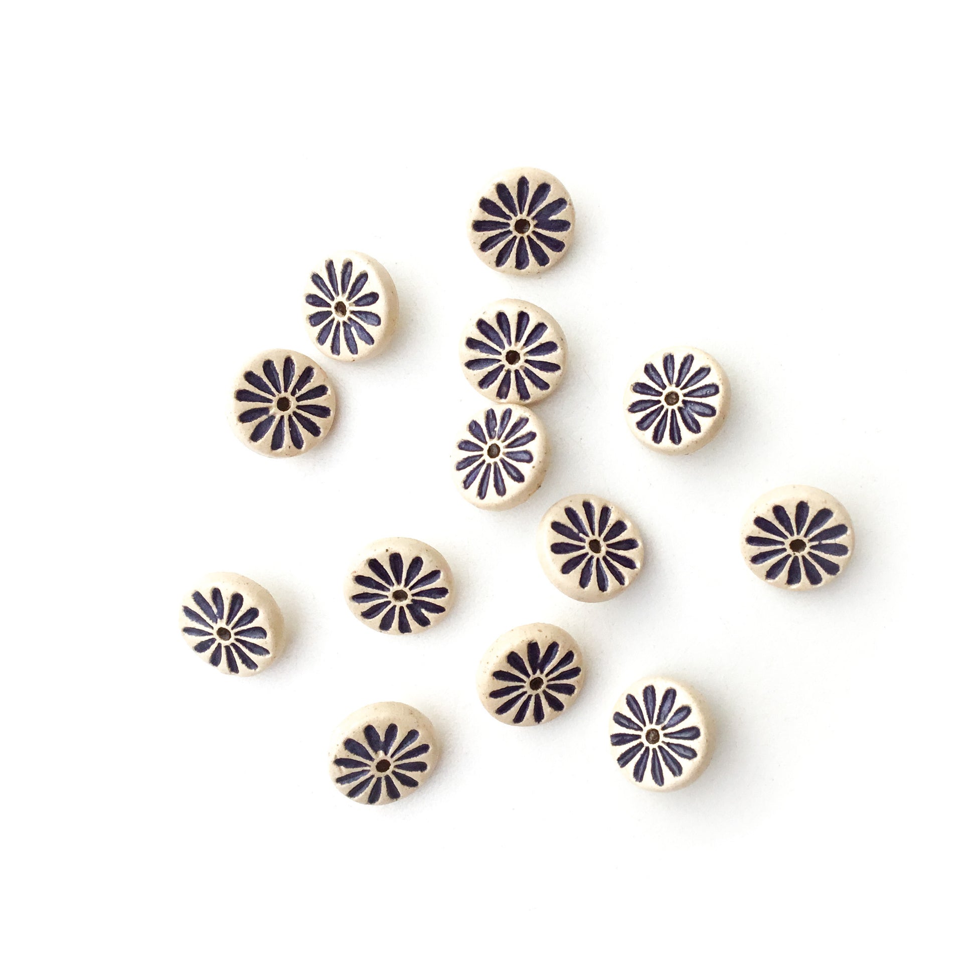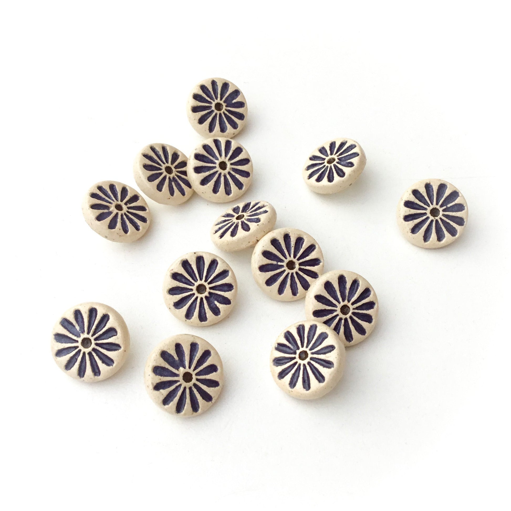 These ceramic buttons are each stamped with a sweet flower and filled with a glossy glaze. They'd make a beautiful addition to your handwork. The shank holes is small, fitting a standard threading needle.