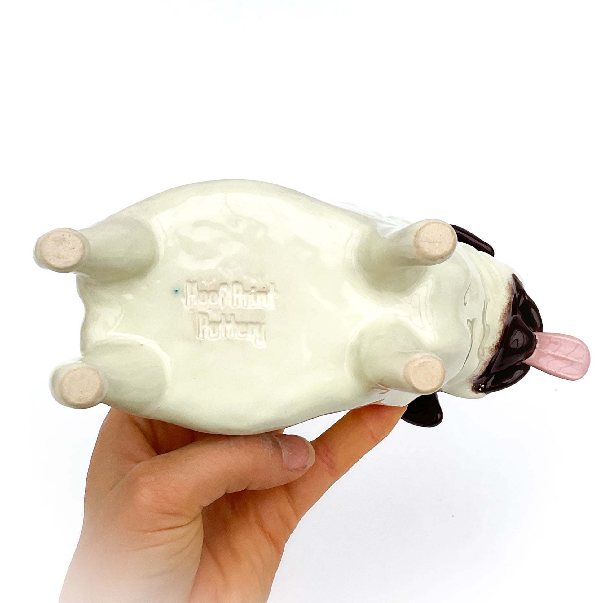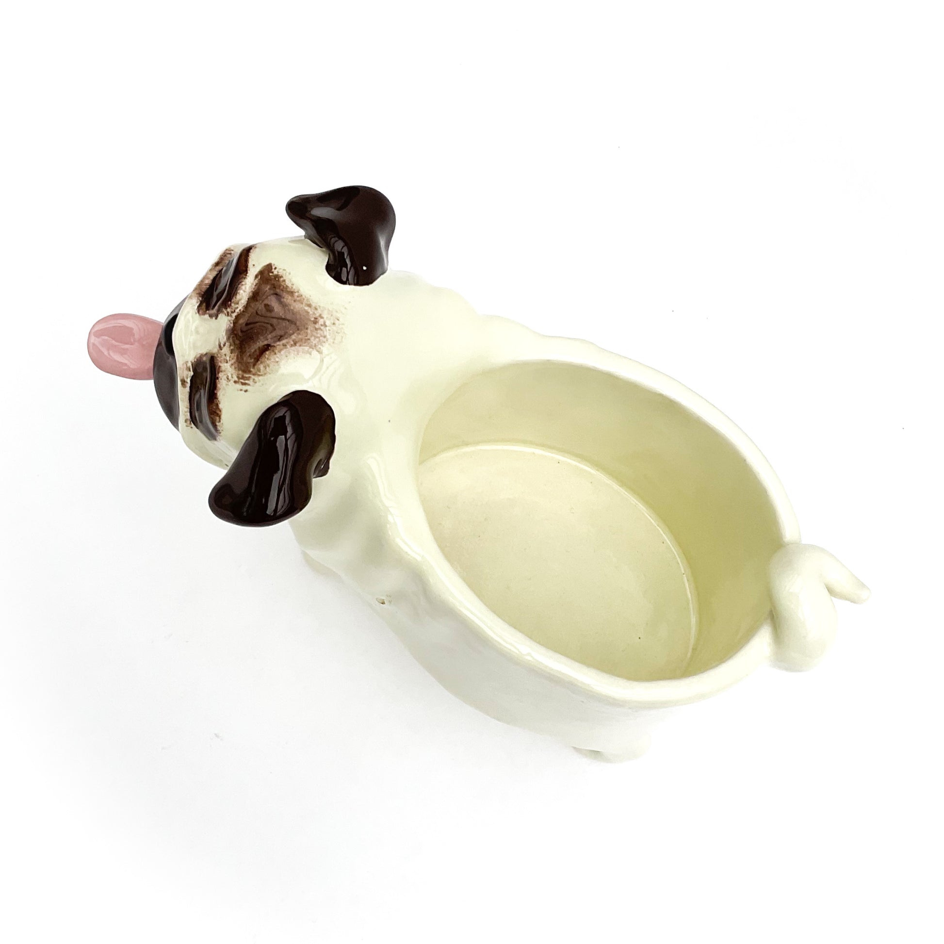 A ceramic Pug dog planter to pot up your favorite plant. This dog pot would also make a sweet candy or keepsake bowl.