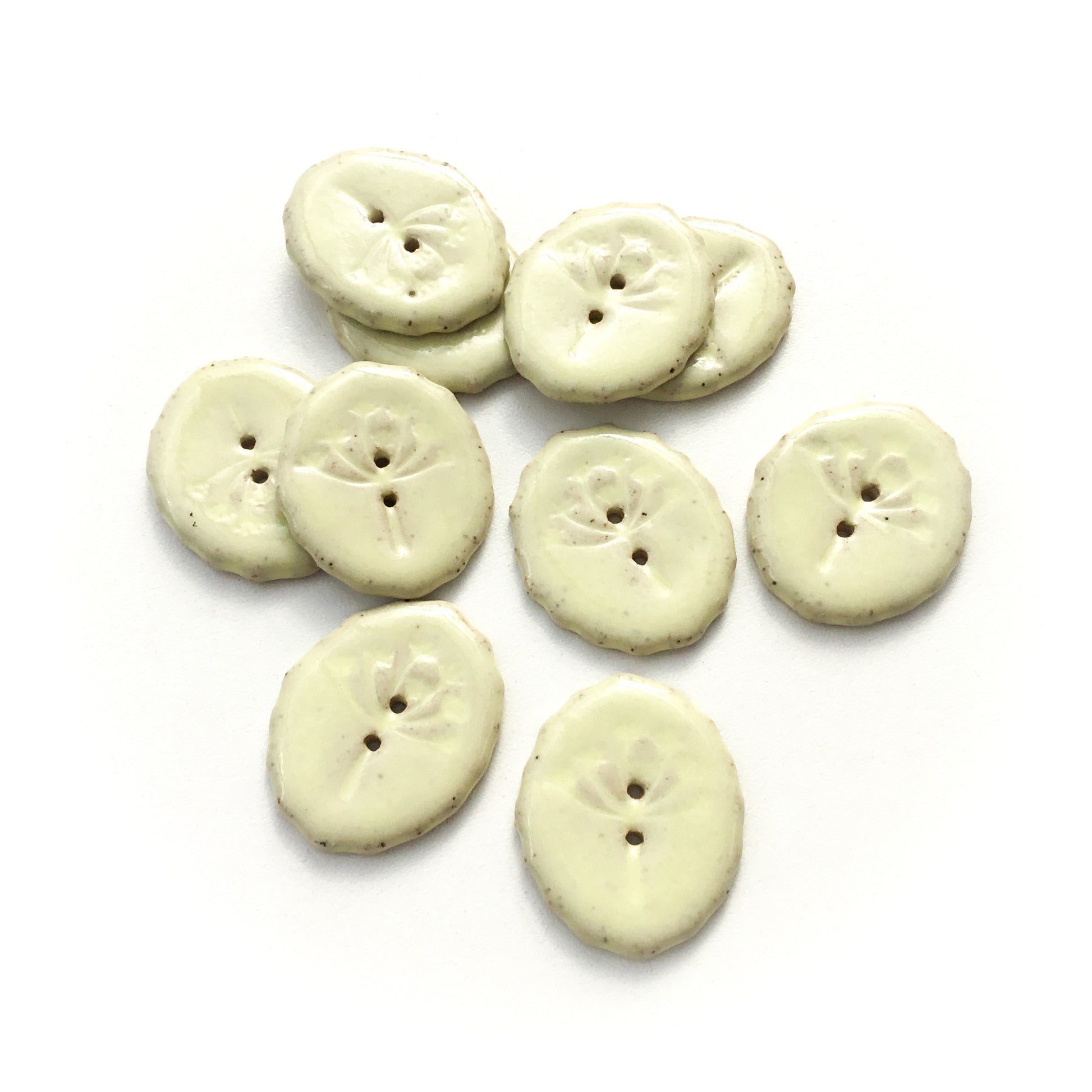 Add a handmade touch to your project with these lightly scalloped, hand stamped stoneware buttons. Each features a delicate umbel-shaped floral design, perfect for giving a unique look to any creation. *Please note that due to the opacity of this glaze, the stamp may appear obscure on the button.