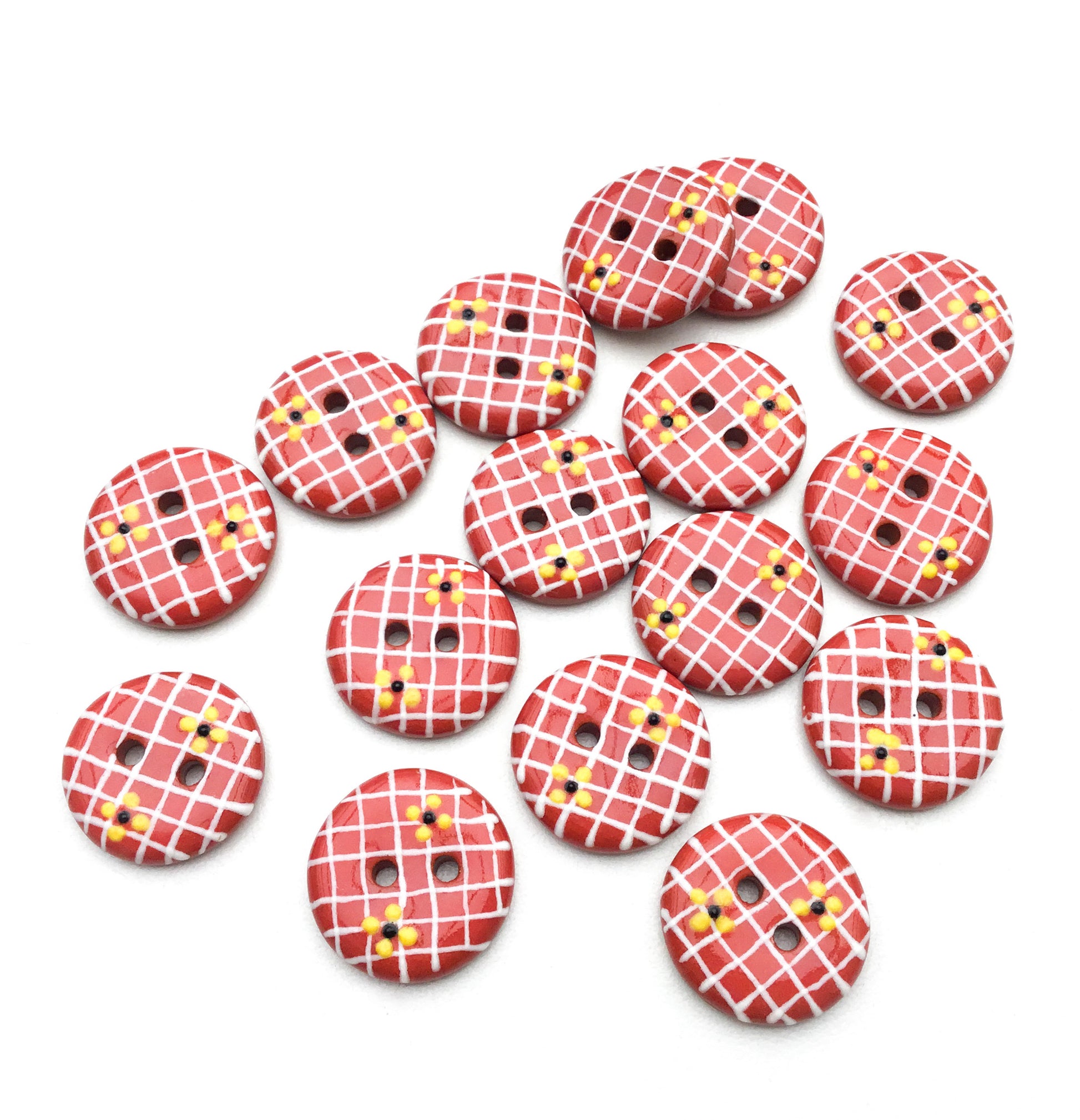 Enhance your handwork with these 3/4" decorative buttons, featuring a trellis design with little yellow flowers. The edges are softly rounded for a nice feel in the hand.