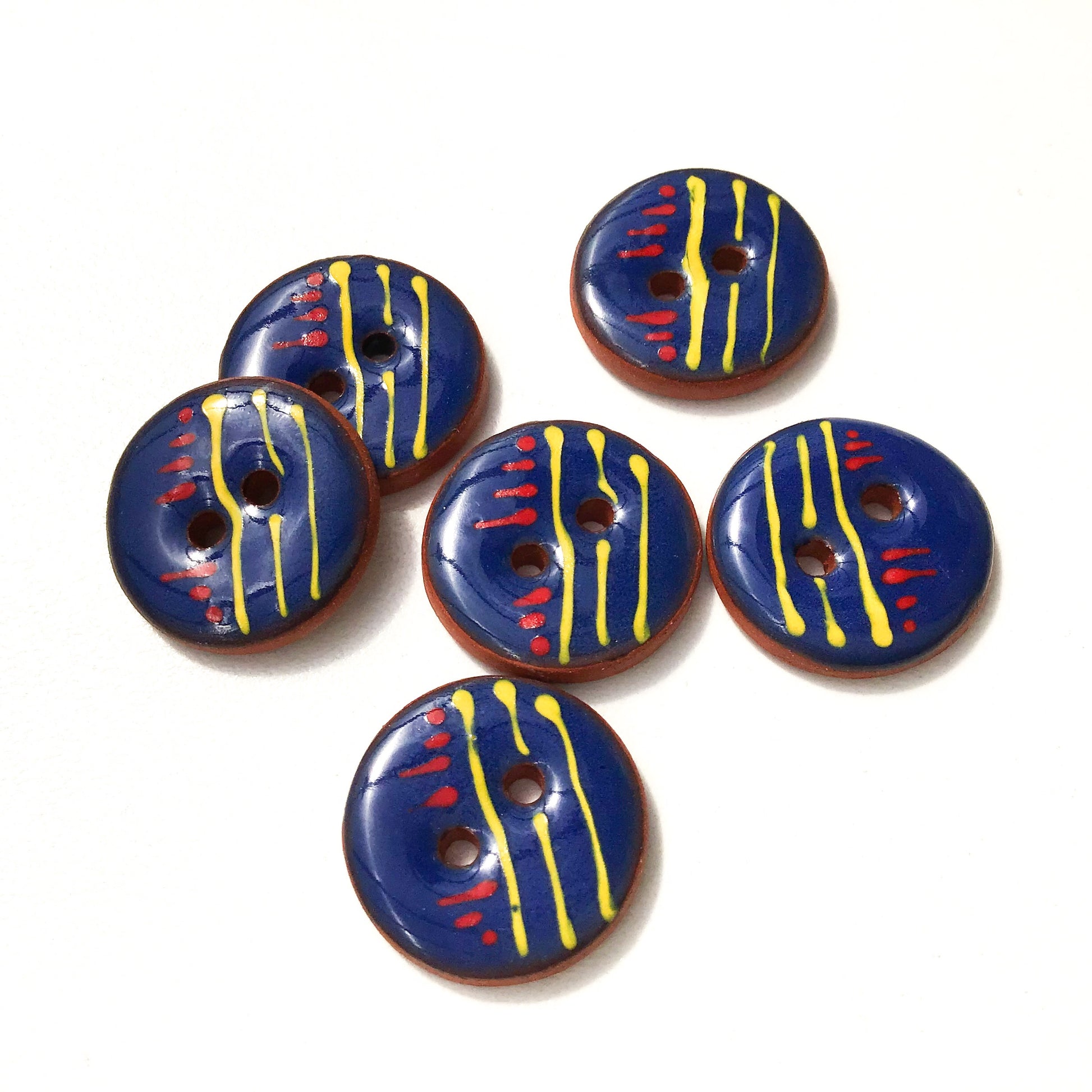 Deep Blue 'Line & Dash' Ceramic Buttons on Red Clay - Round Ceramic Buttons - 3/4" - 6 Pack