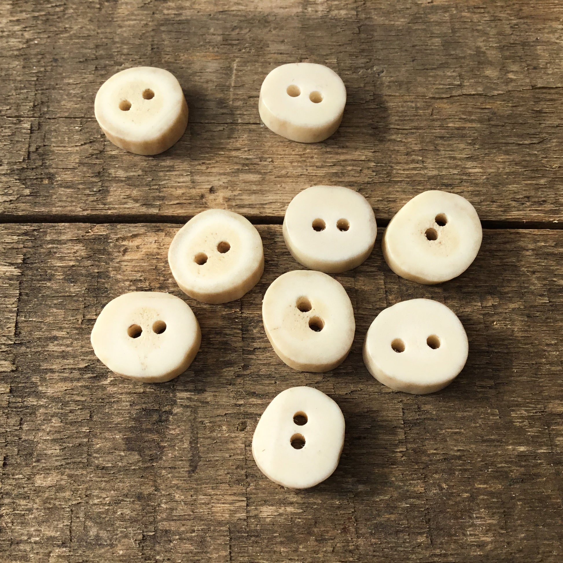 These deer antler shed buttons add a beautiful, natural touch to any garment. Made from antler sheds found, usually by our canine friends, in the field and forest on and around our farm. We sand each one to a silky smooth finish and coat in an all-natural oil and beeswax finish. These buttons are strong, durable, and will last a lifetime!