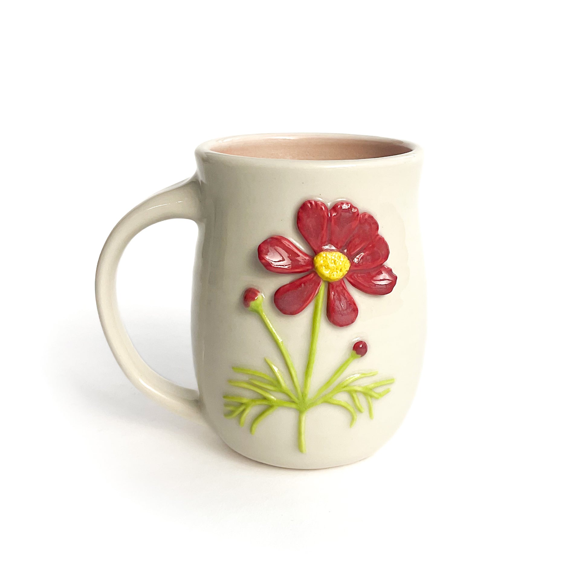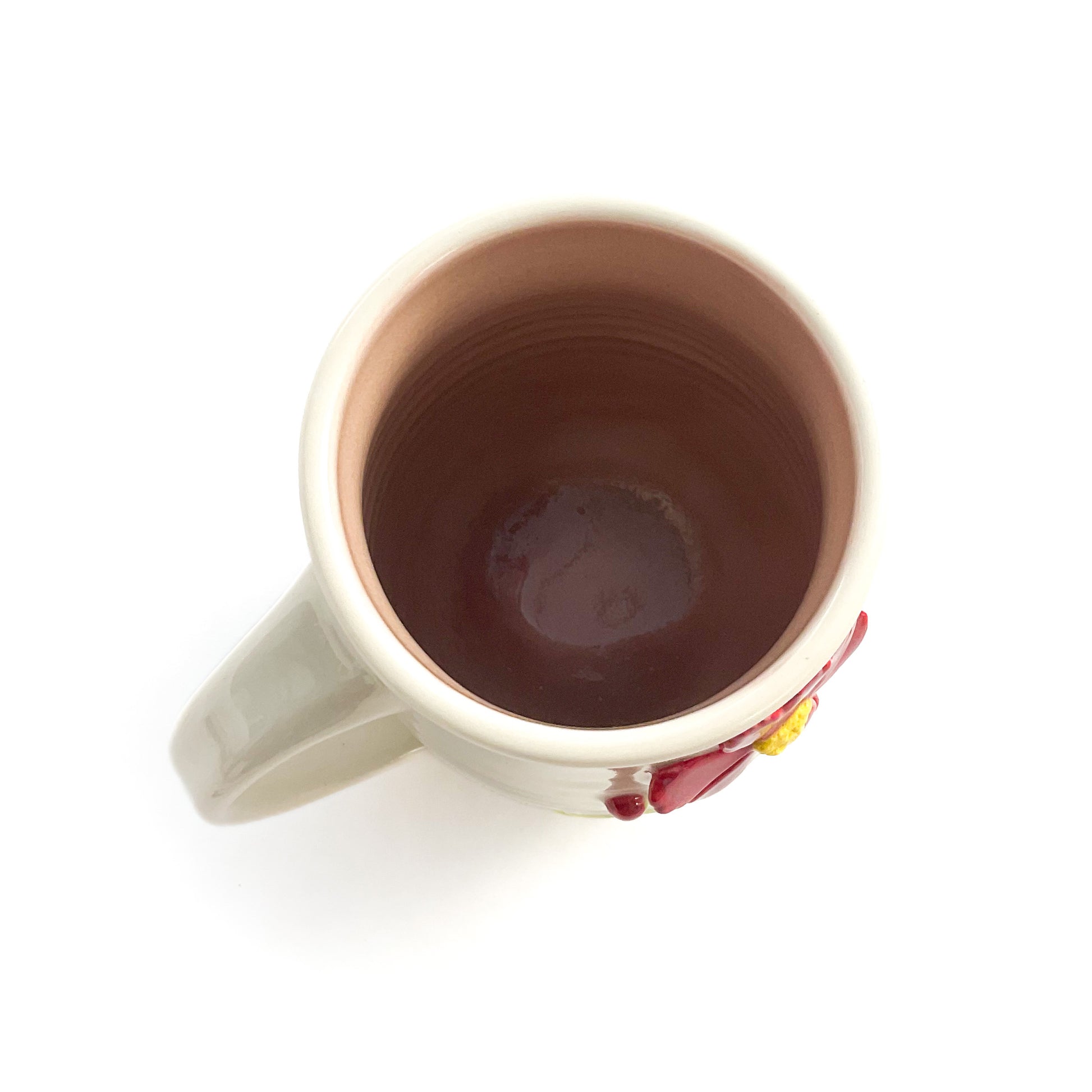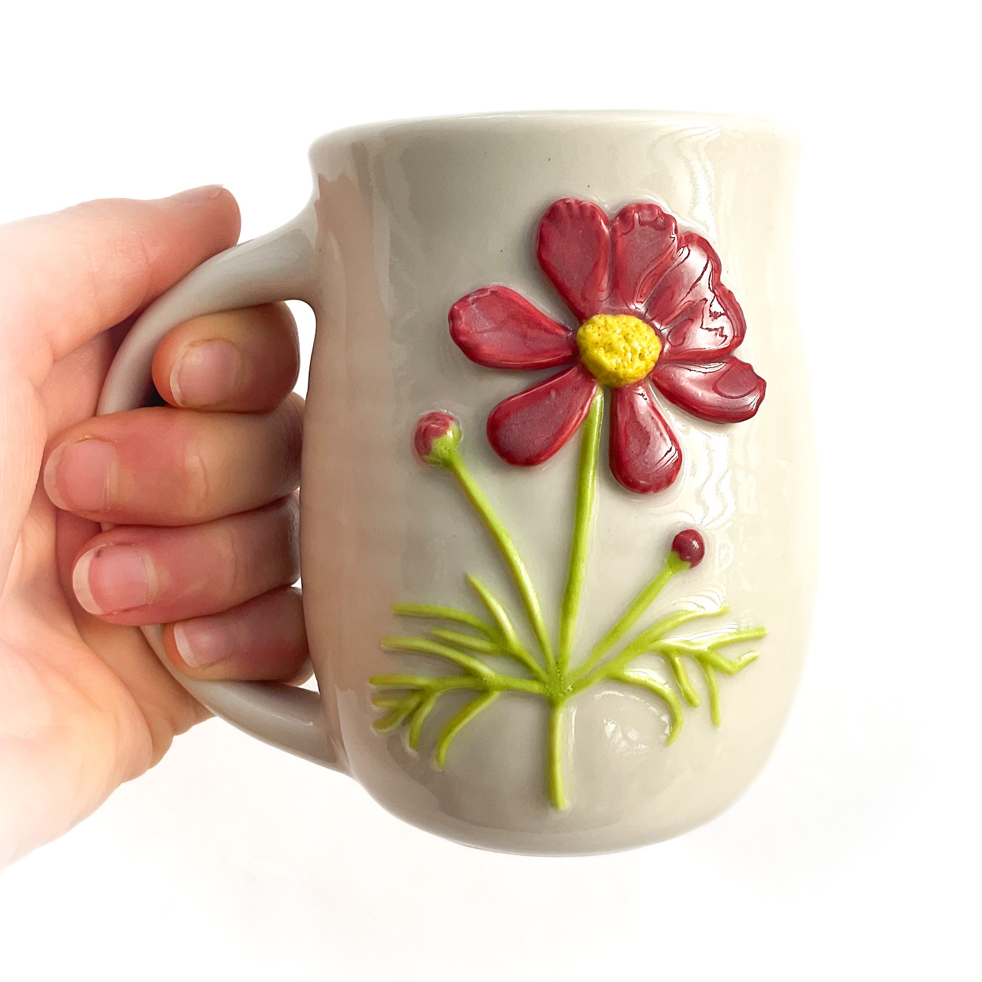 This unique hand sculpted flower mug, crafted by Hoof Print Pottery in southeast Ohio, is a one-of-a-kind masterpiece! Every detail of this original mug is skillfully made by hand, one petal, bud, and leaf at a time. After each small piece is sculpted it is adhered to the unfired mug using only clay and water. After the raw clay mug is thoroughly dried it is bisque fired in the kiln to 1,945°F. When the mug is cooled it is then hand painted and refired (glaze fired) to 2,300°F.