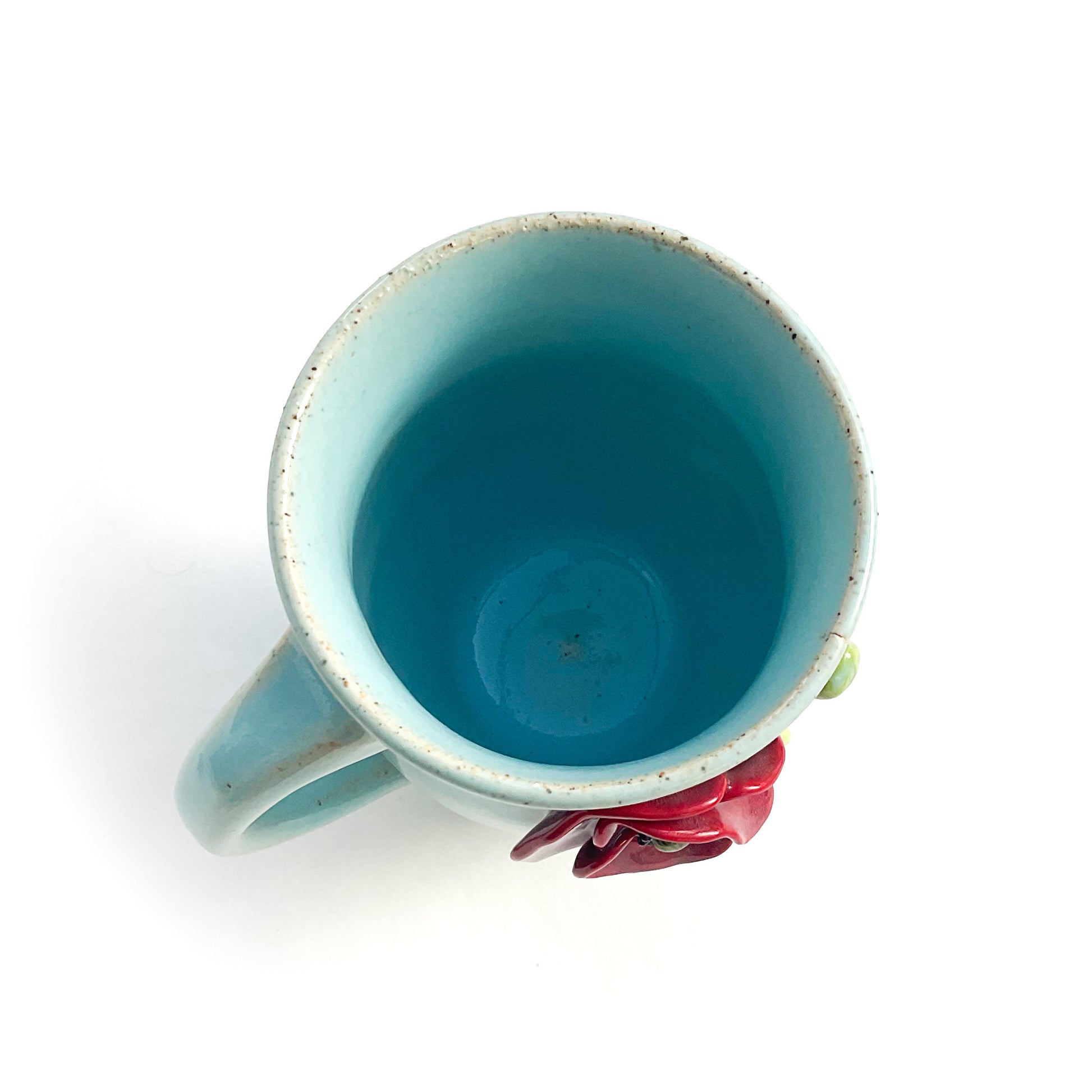 This unique hand sculpted flower mug, crafted by Hoof Print Pottery in southeast Ohio, is a one-of-a-kind masterpiece! Every detail of this original mug is skillfully made by hand, one petal, bud, and leaf at a time. After each small piece is sculpted it is adhered to the unfired mug using only clay and water. After the raw clay mug is thoroughly dried it is bisque fired in the kiln to 1,945°F. When the mug is cooled it is then hand painted and refired (glaze fired) to 2,300°F.