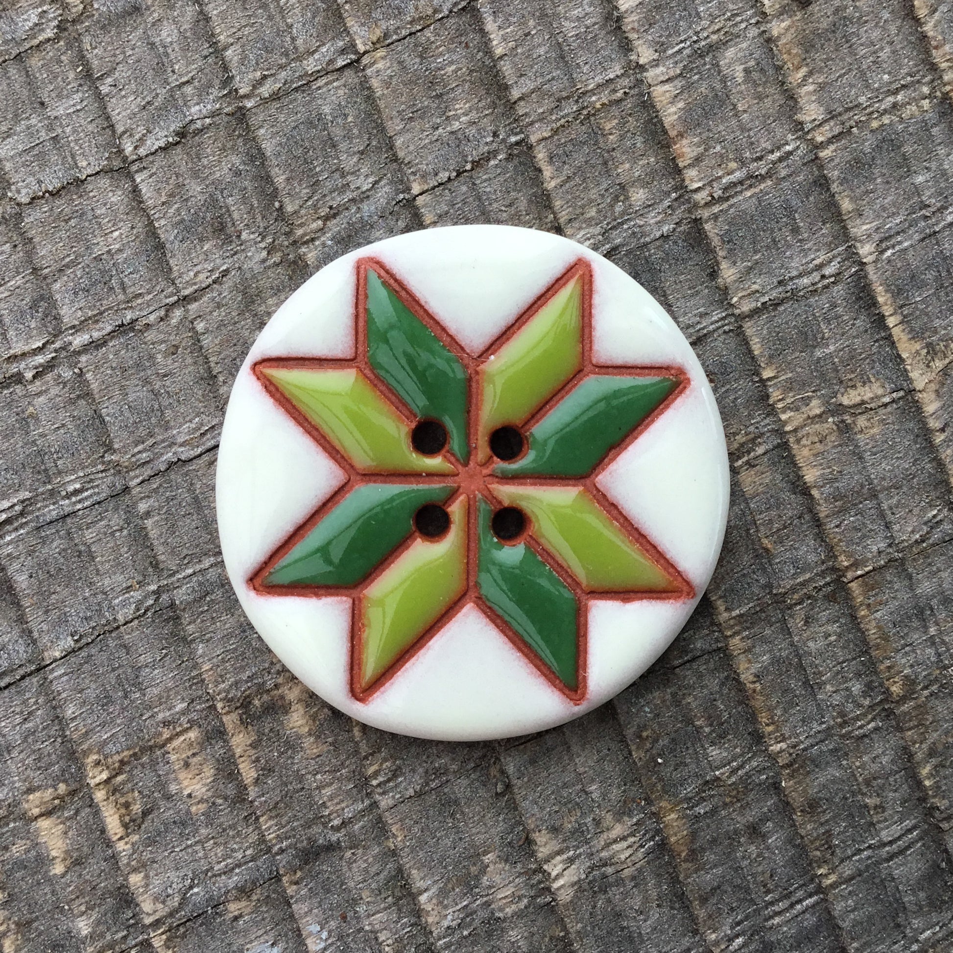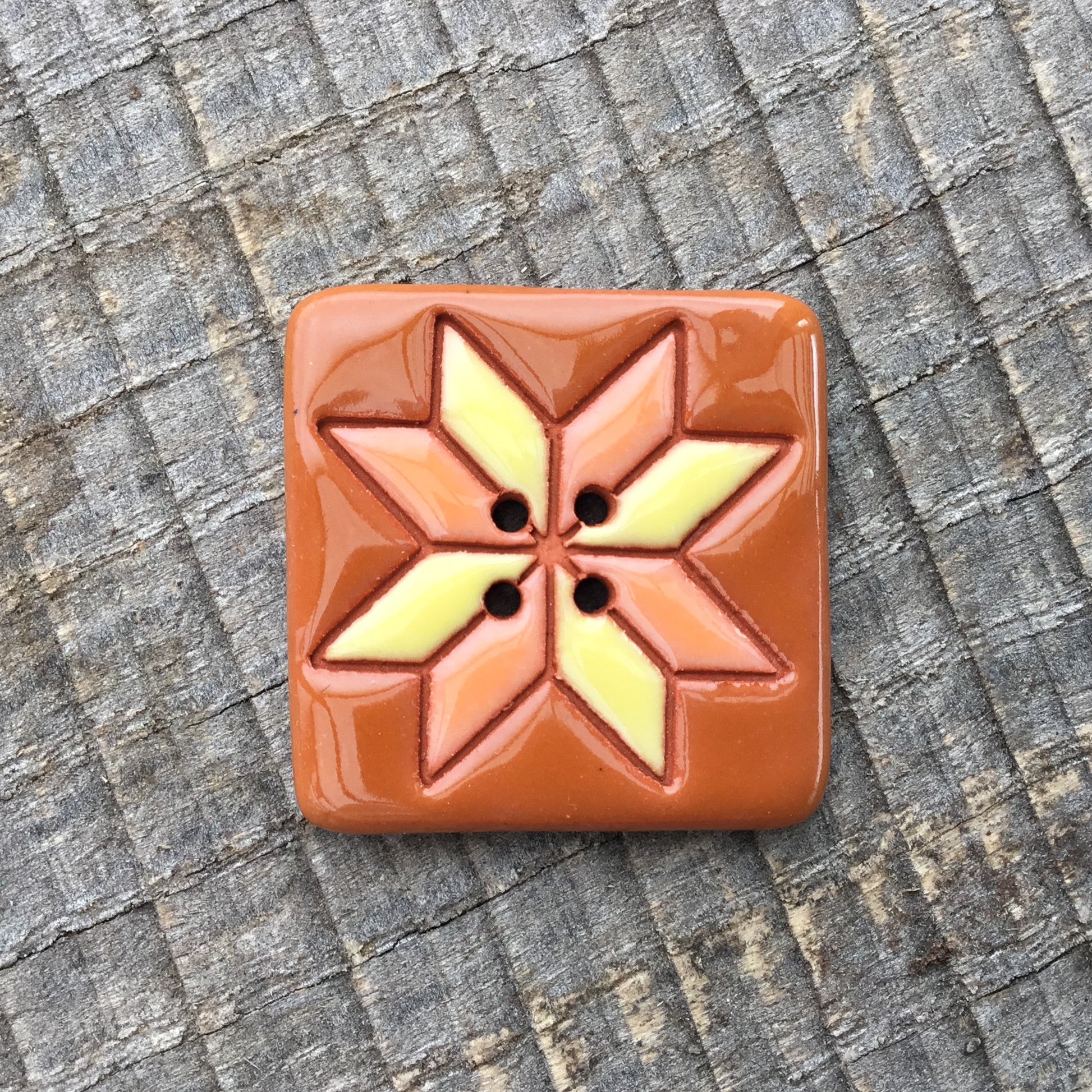 These original quilt block buttons are made using red earthenware clay. Carefully hand painted with complimentary colors, they’ll add a fun and unique touch to any project!
