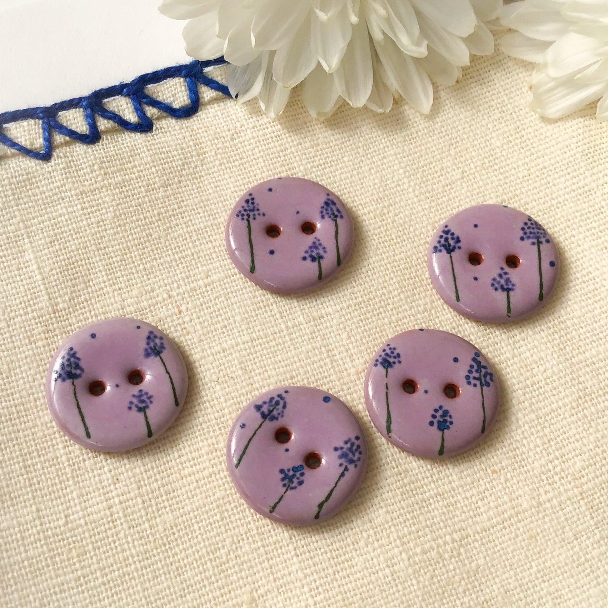 These light purple buttons display small green sprigs topped with blue buds. They'd add a unique and sweet touch to your handwork.