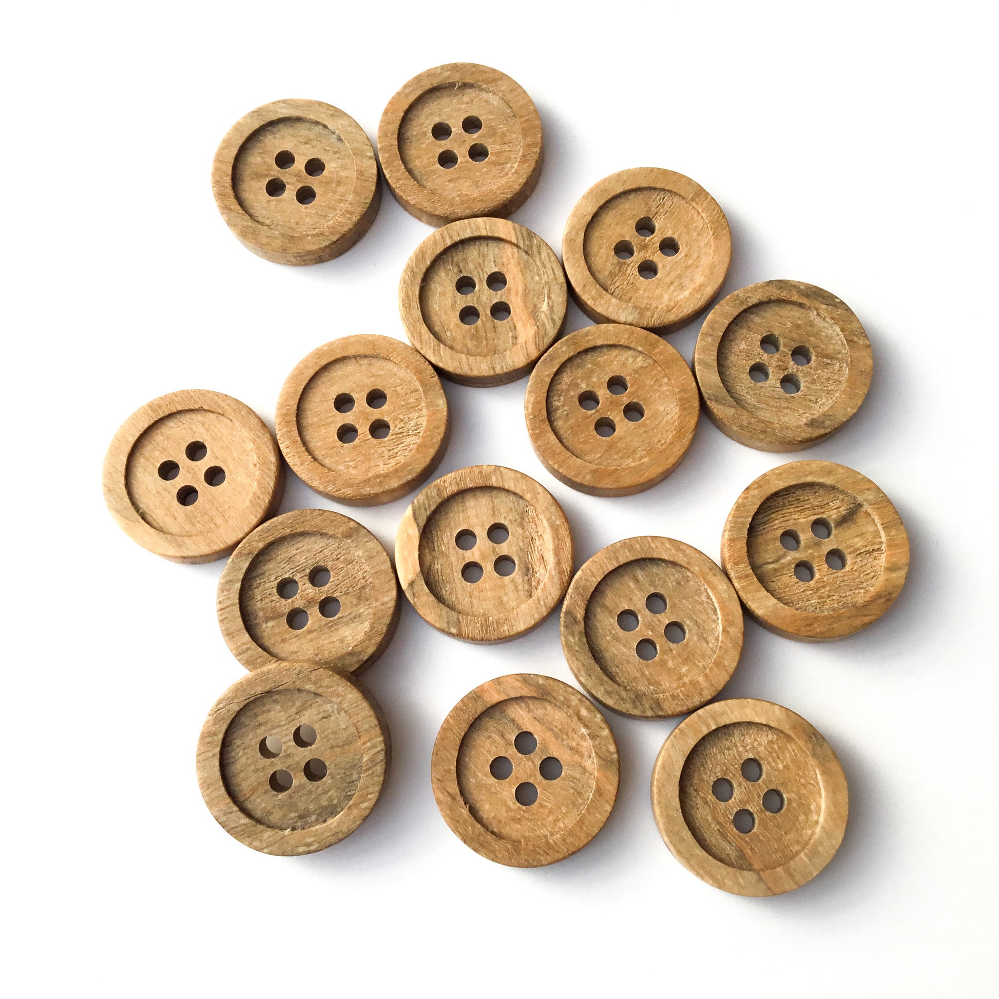 These natural wood buttons are made using fallen or damaged trees we harvest from our farm's woodlot. Each is hand sanded for a smooth finish and sealed in an all-natural oil and beeswax finish.