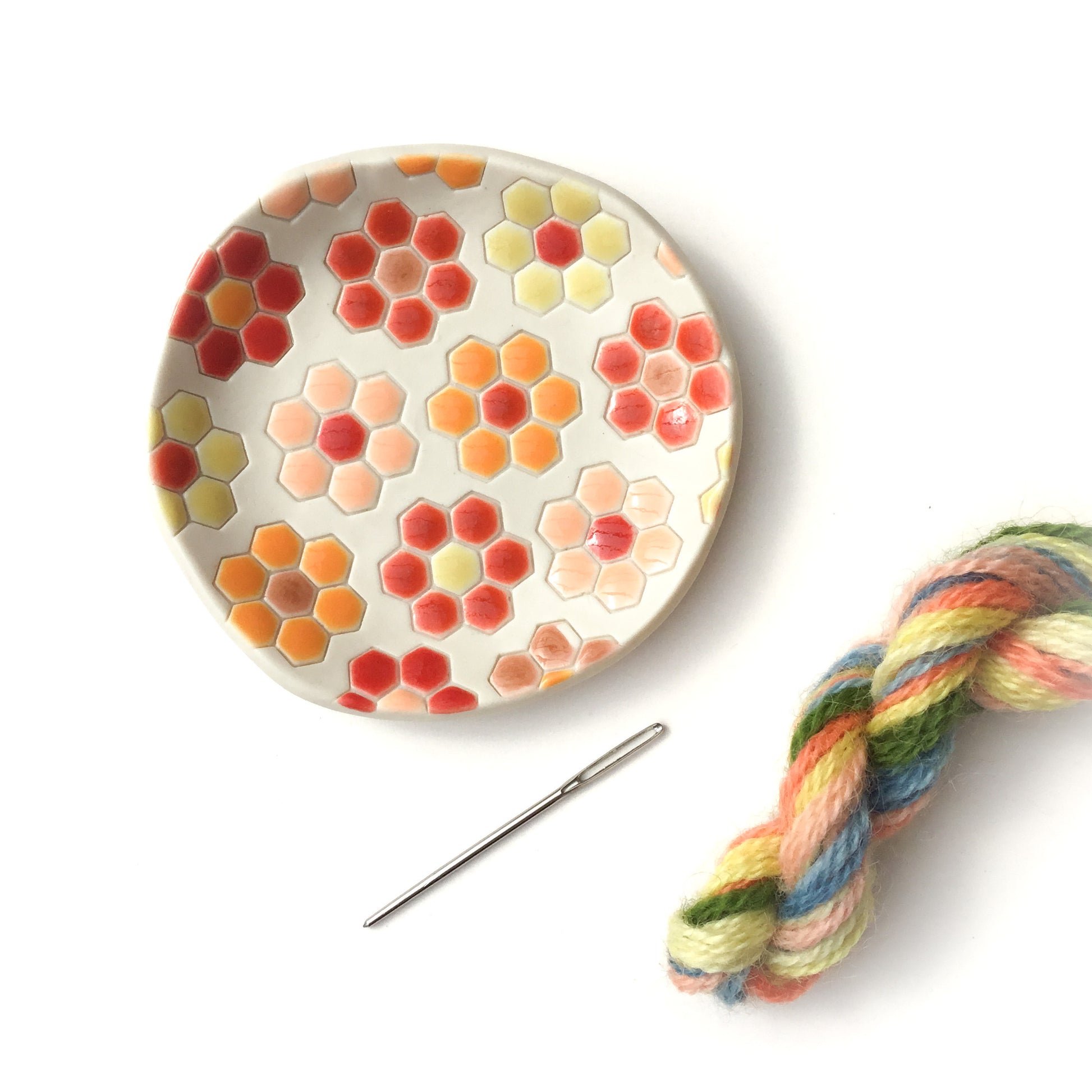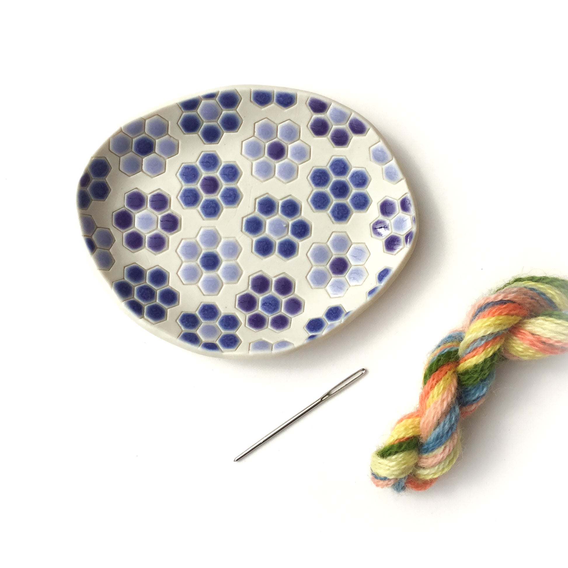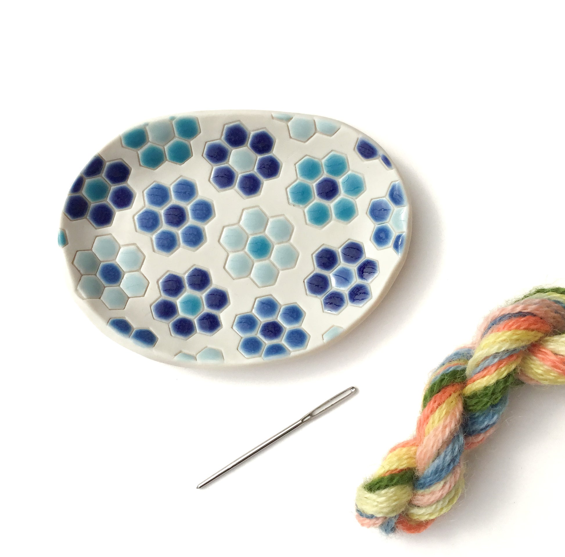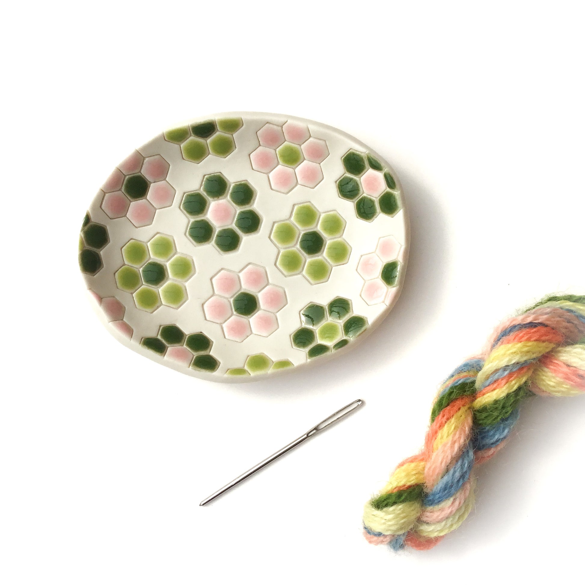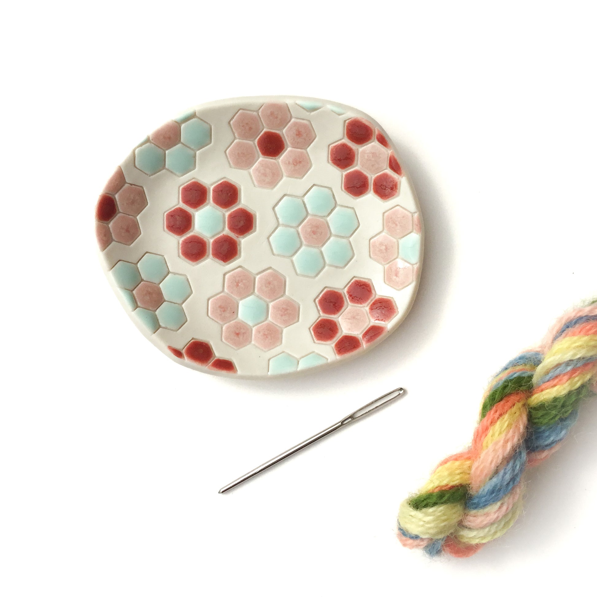 Add a sweet touch to your knitting space with these one-of-a-kind porcelain notion dishes. Hand stamped and painted in fun and colorful pattern combinations. These also make a nice dish for holding your rings and other everyday jewelry.