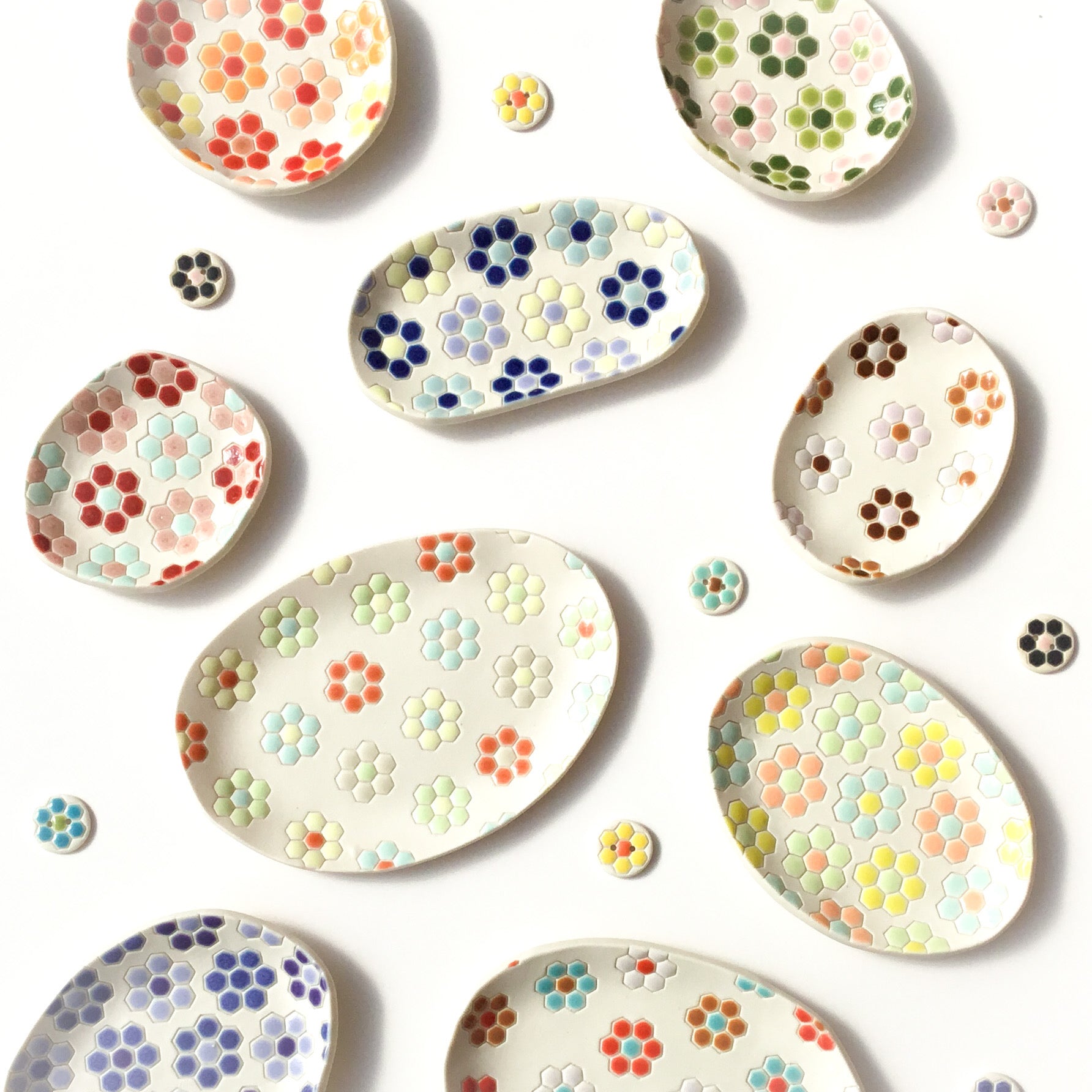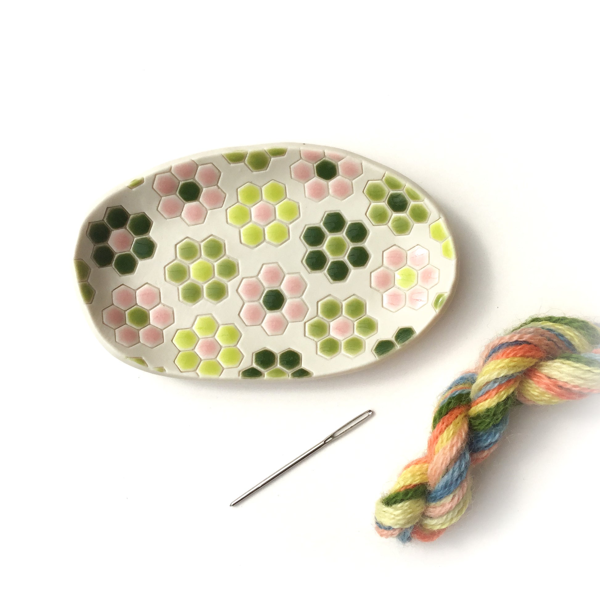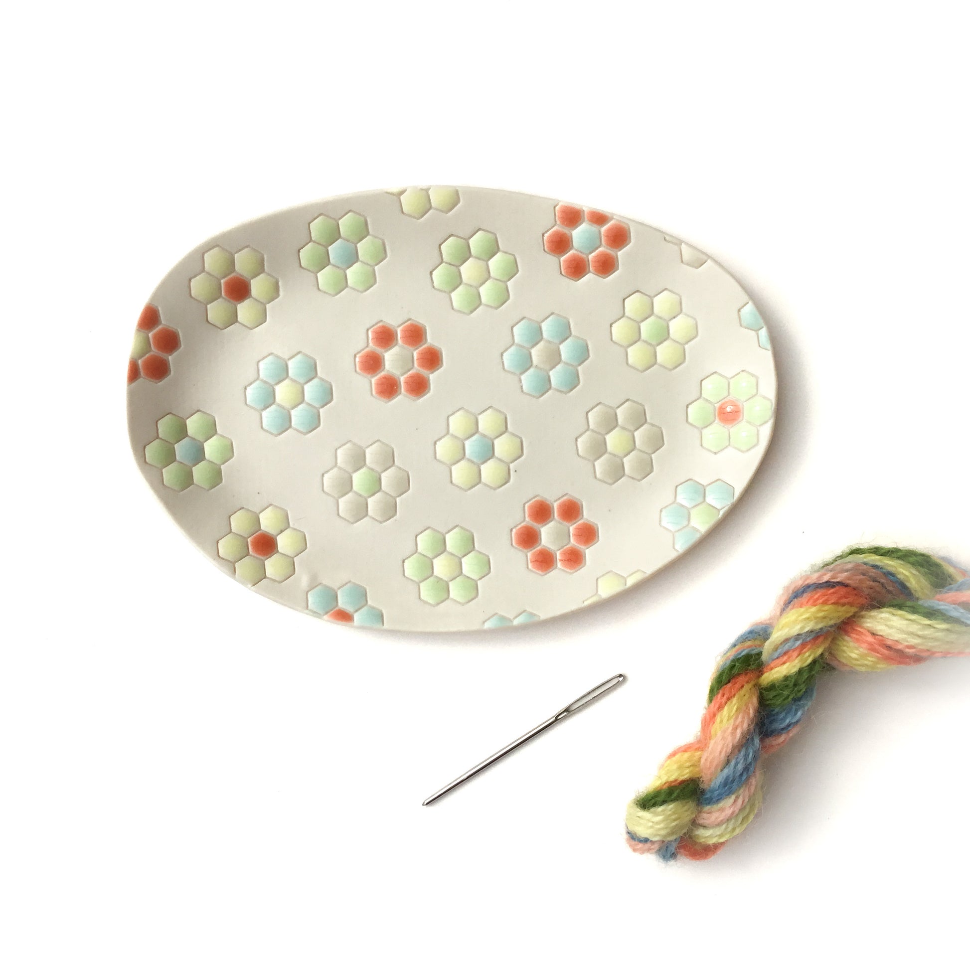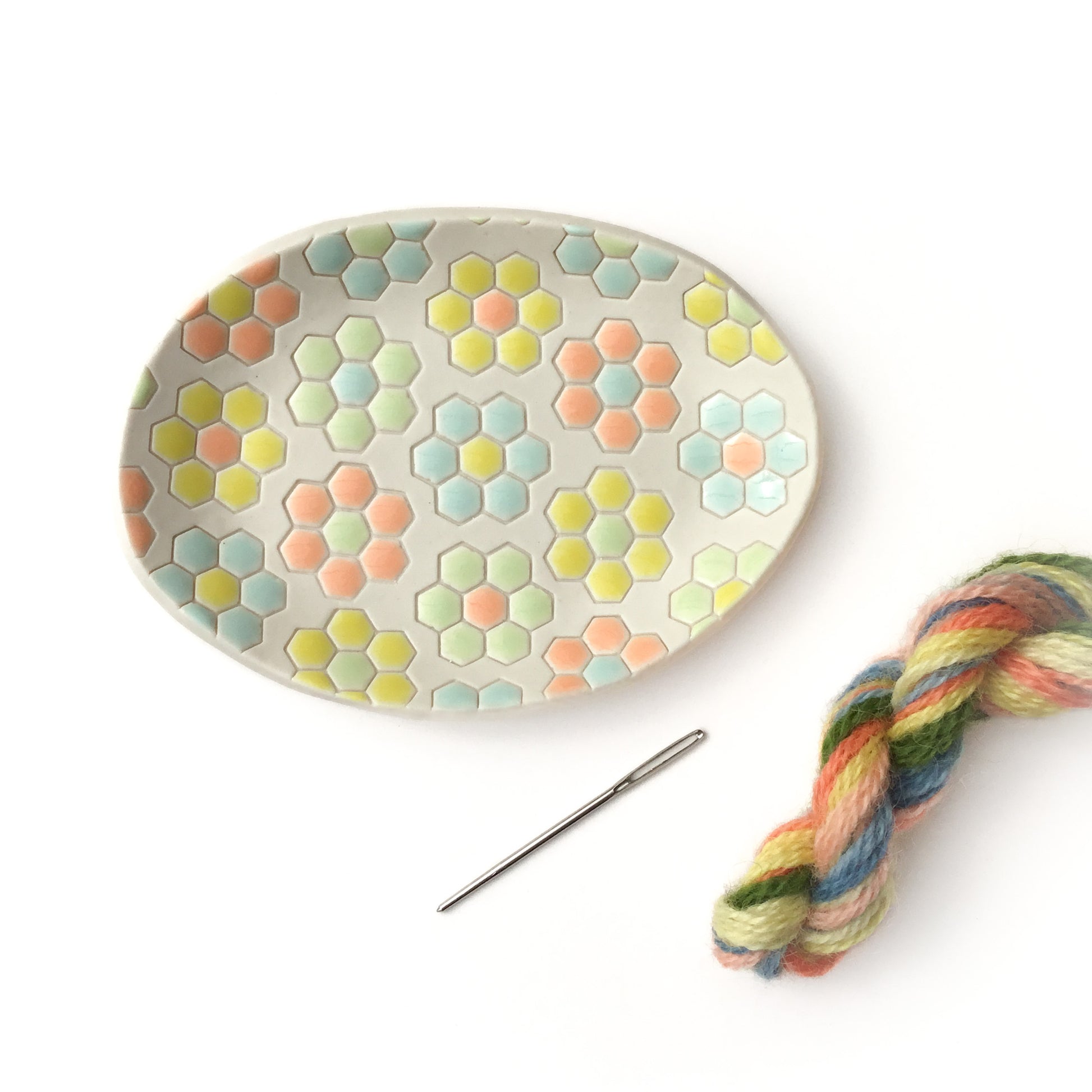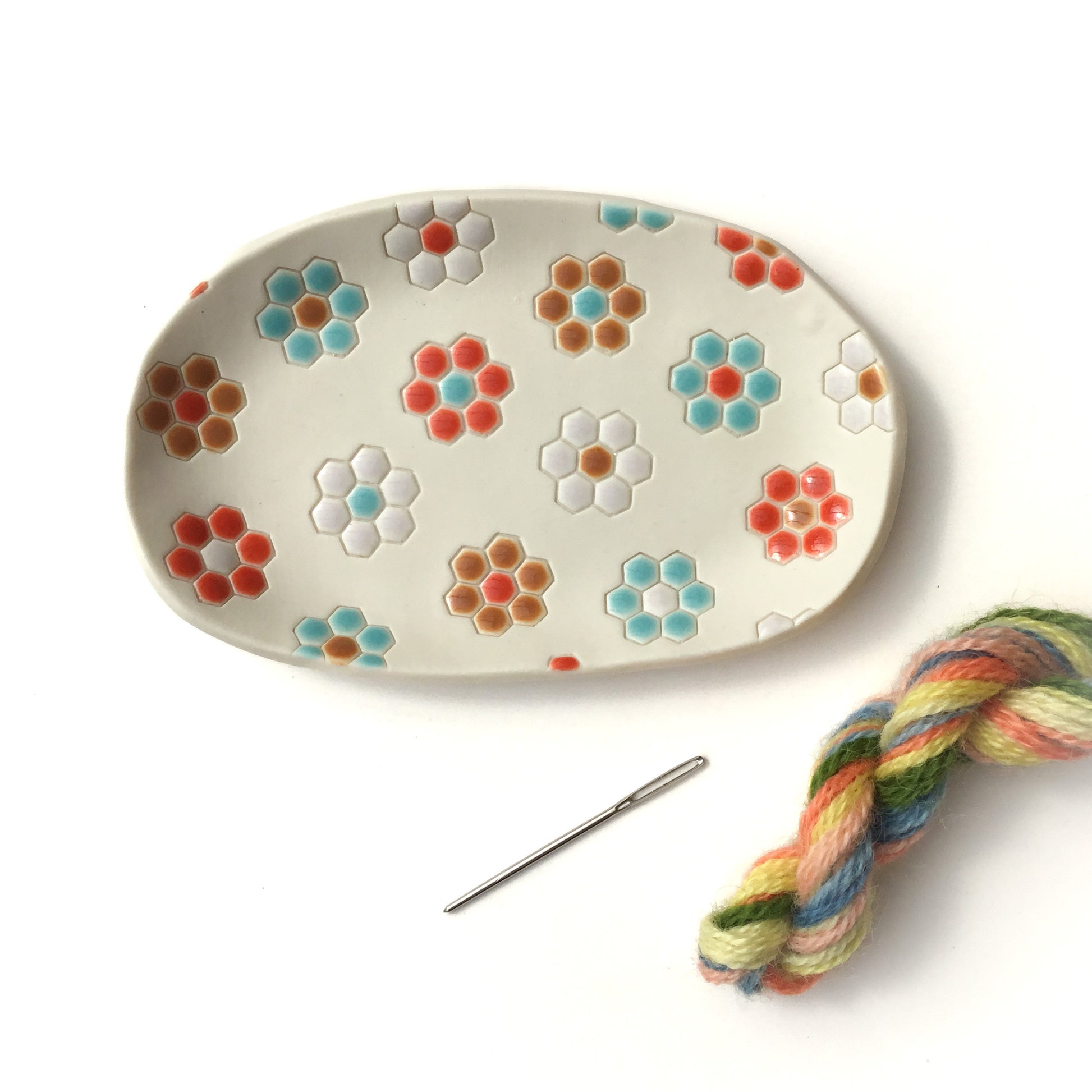 Add a sweet touch to your knitting space with these one-of-a-kind porcelain notion dishes. Hand stamped and painted in fun and colorful pattern combinations. These also make a nice dish for holding your rings and other everyday jewelry.