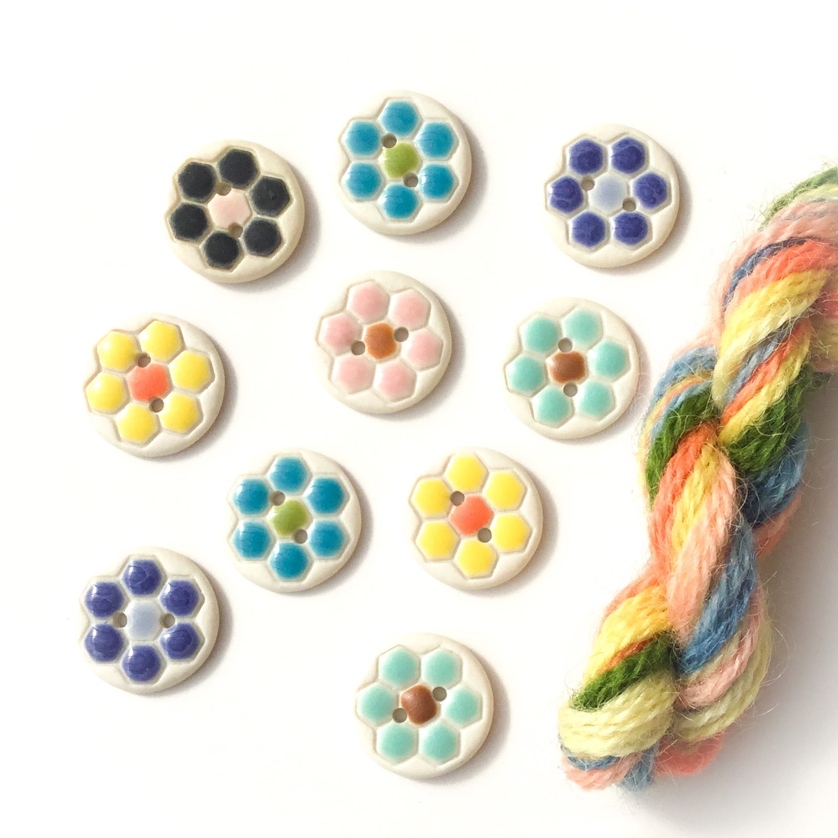 These original Grandma's Garden quilt block buttons are made from porcelain clay. Carefully hand painted in fun and vibrant colors, they’ll add a fun and cheery touch to any project!