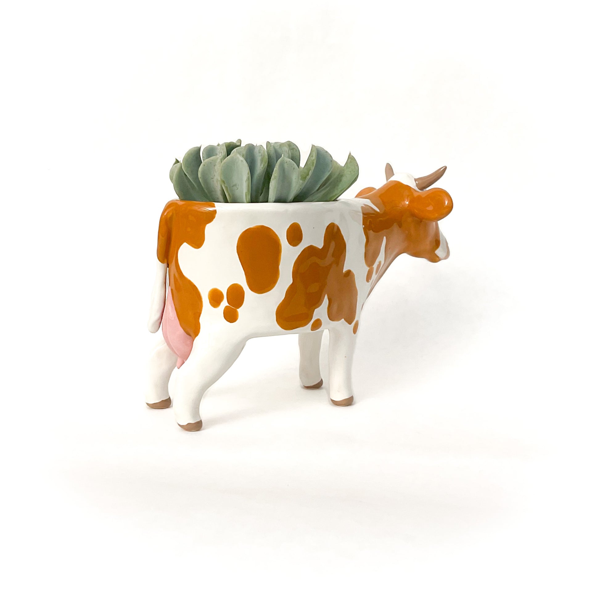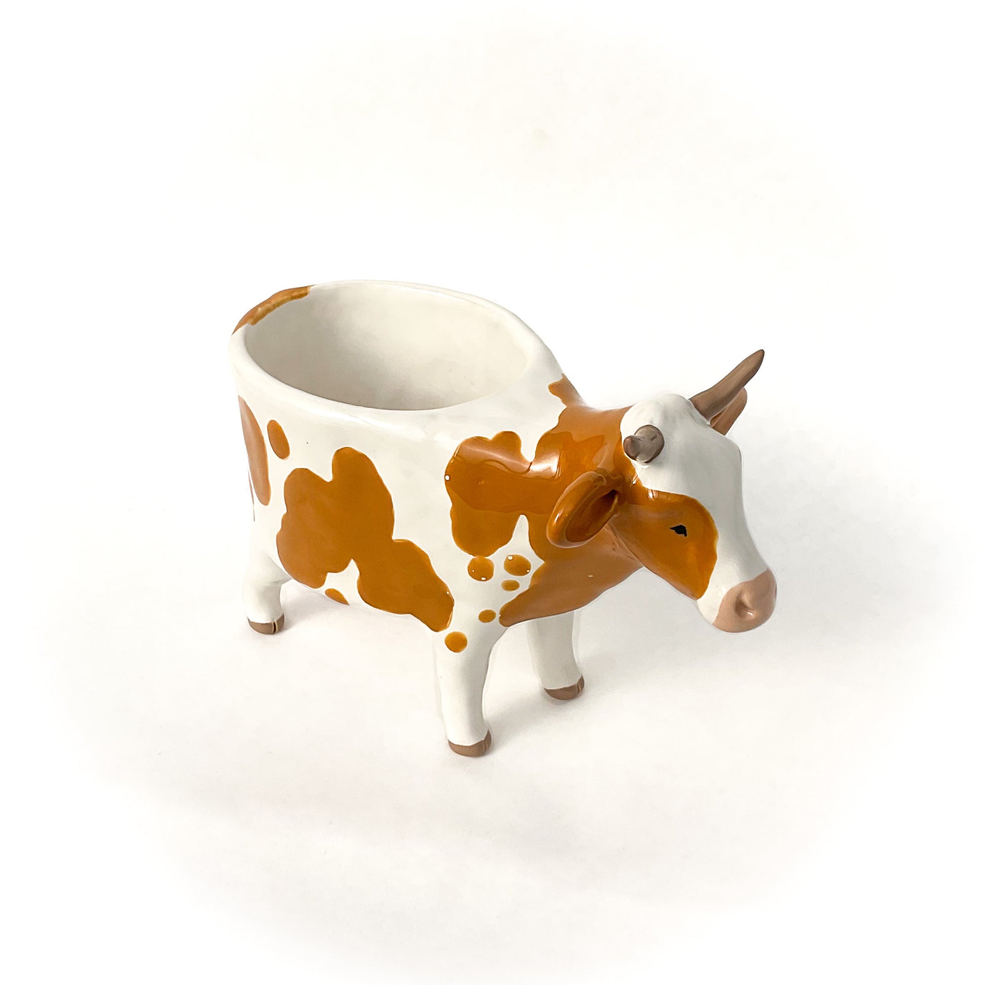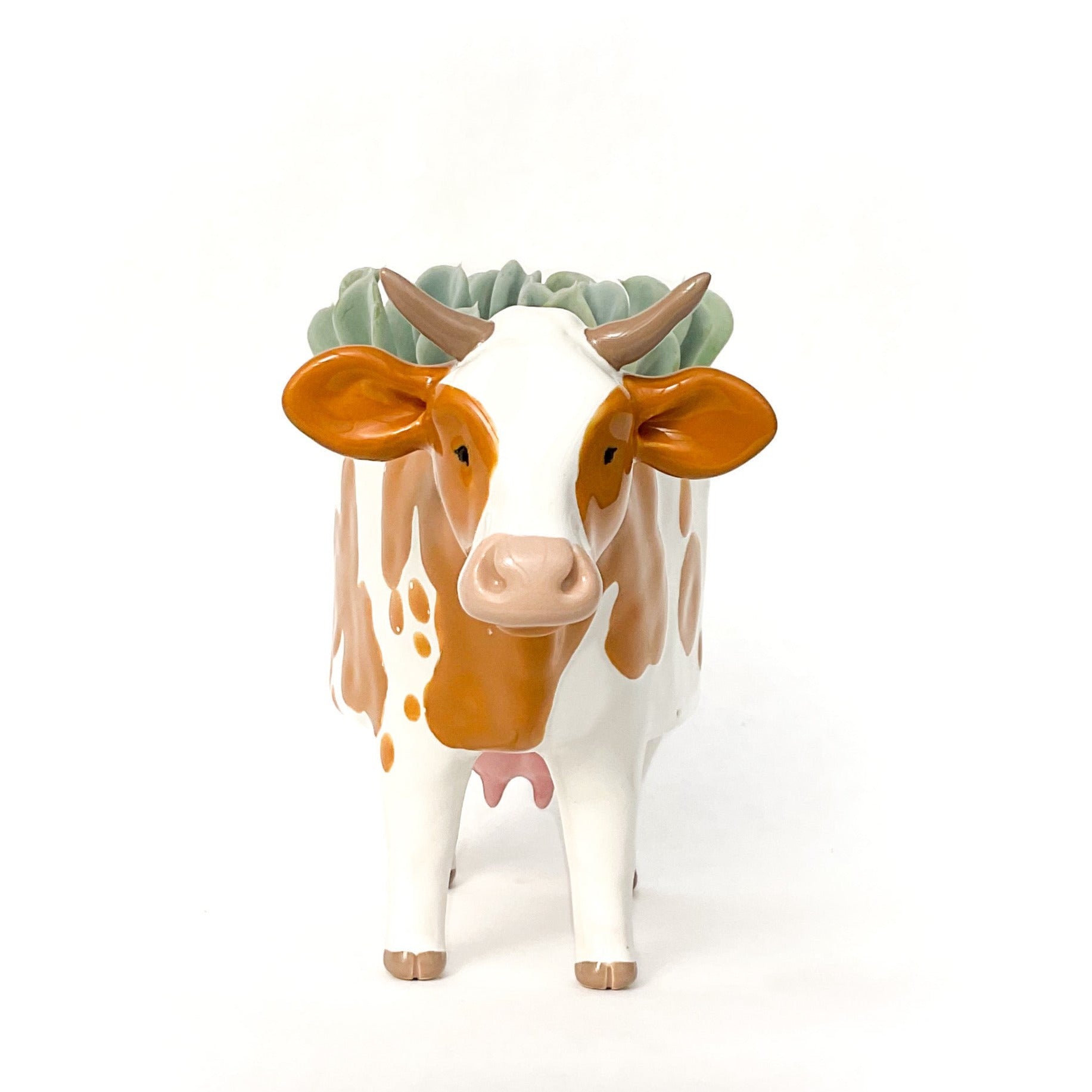 A ceramic Guernsey cow planter to pot up your favorite succulent or use as a dish.
