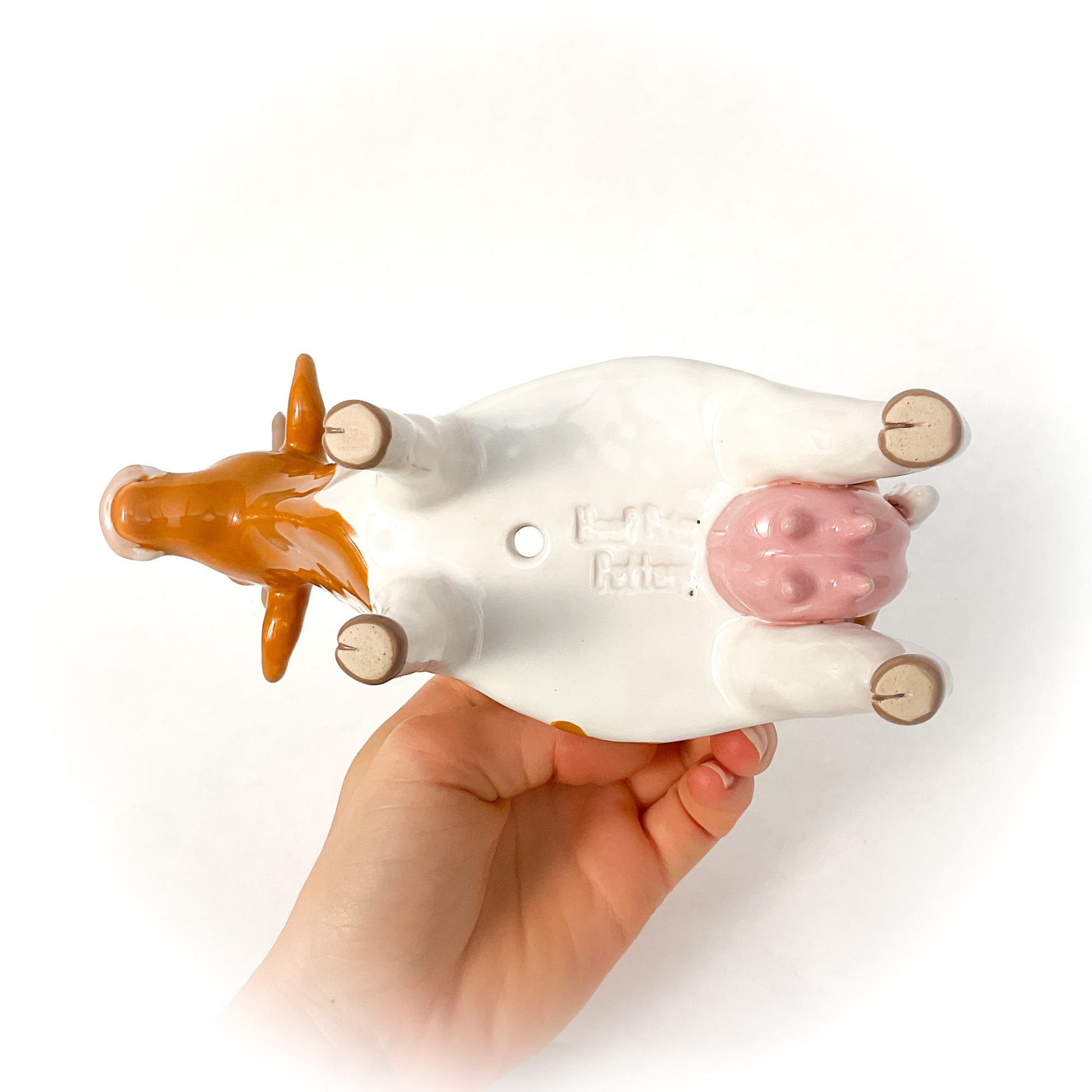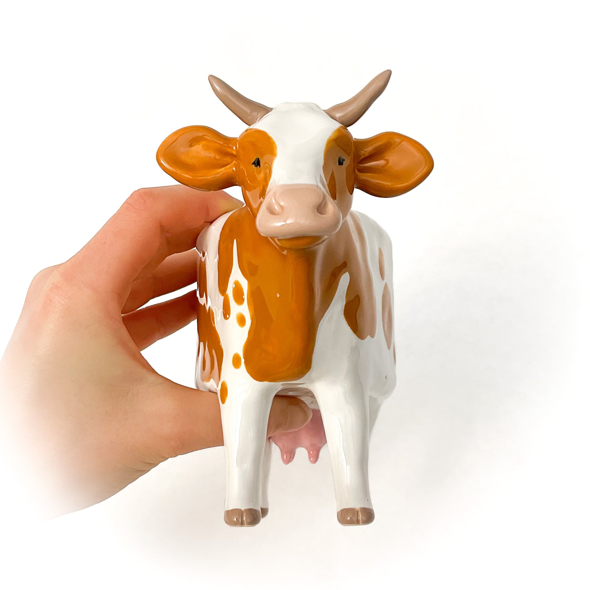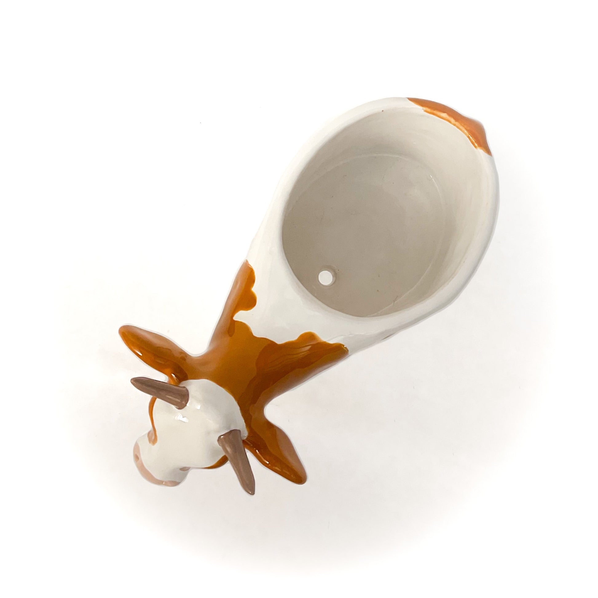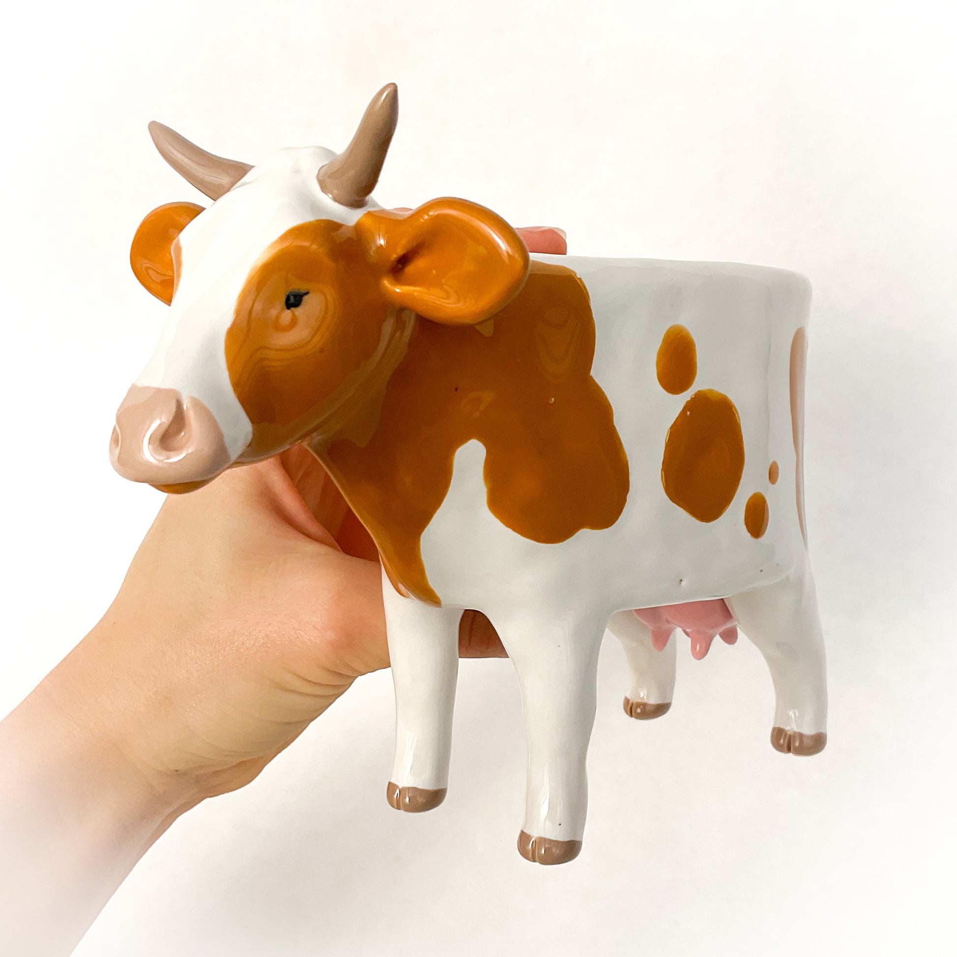 A ceramic Guernsey cow planter to pot up your favorite succulent or use as a dish.
