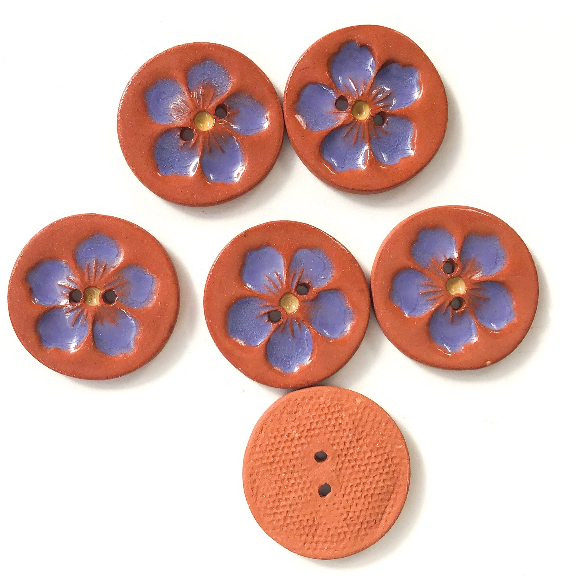 These ceramic buttons are each stamped with a sweet flower and filled with a glossy glaze. They'd make a beautiful addition to your handwork!