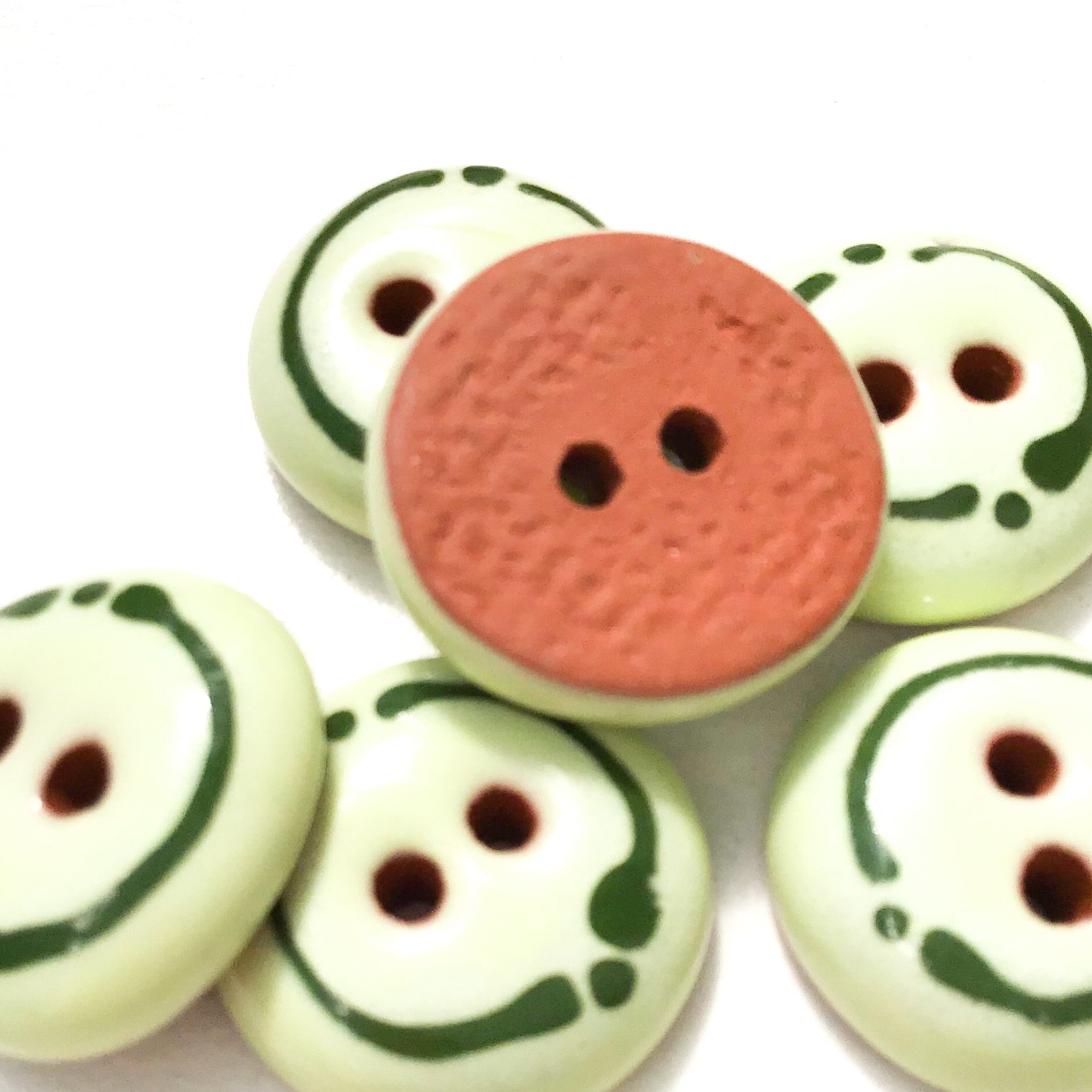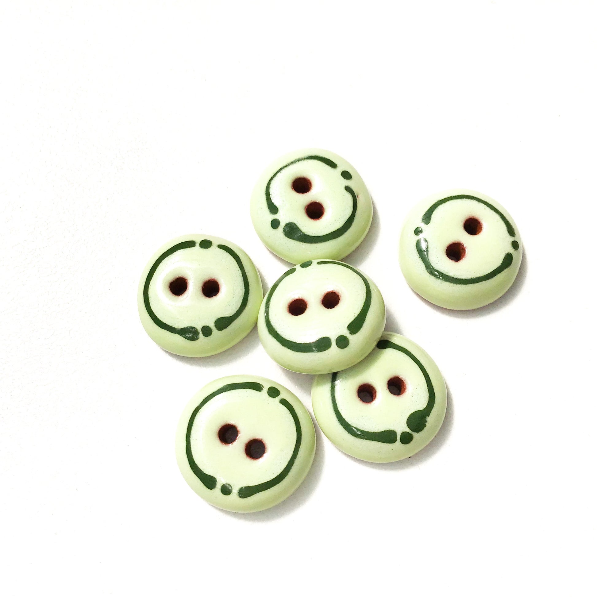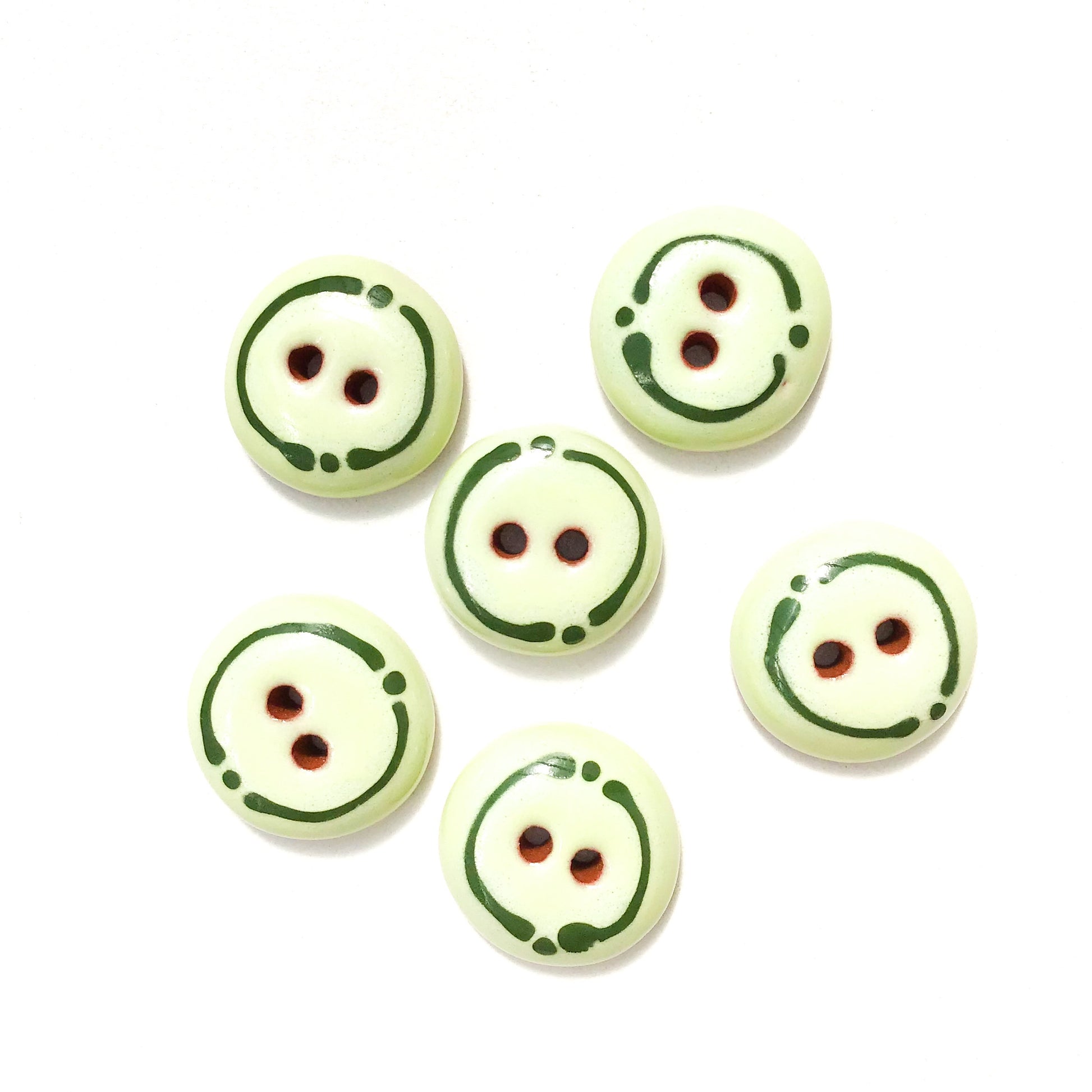 Rounded ceramic buttons in a lovely shade of honeydew green with a cute border on a body of red clay. Softly rounded and glassy smooth, these buttons feel great in your hand and will look beautiful on your handwork!