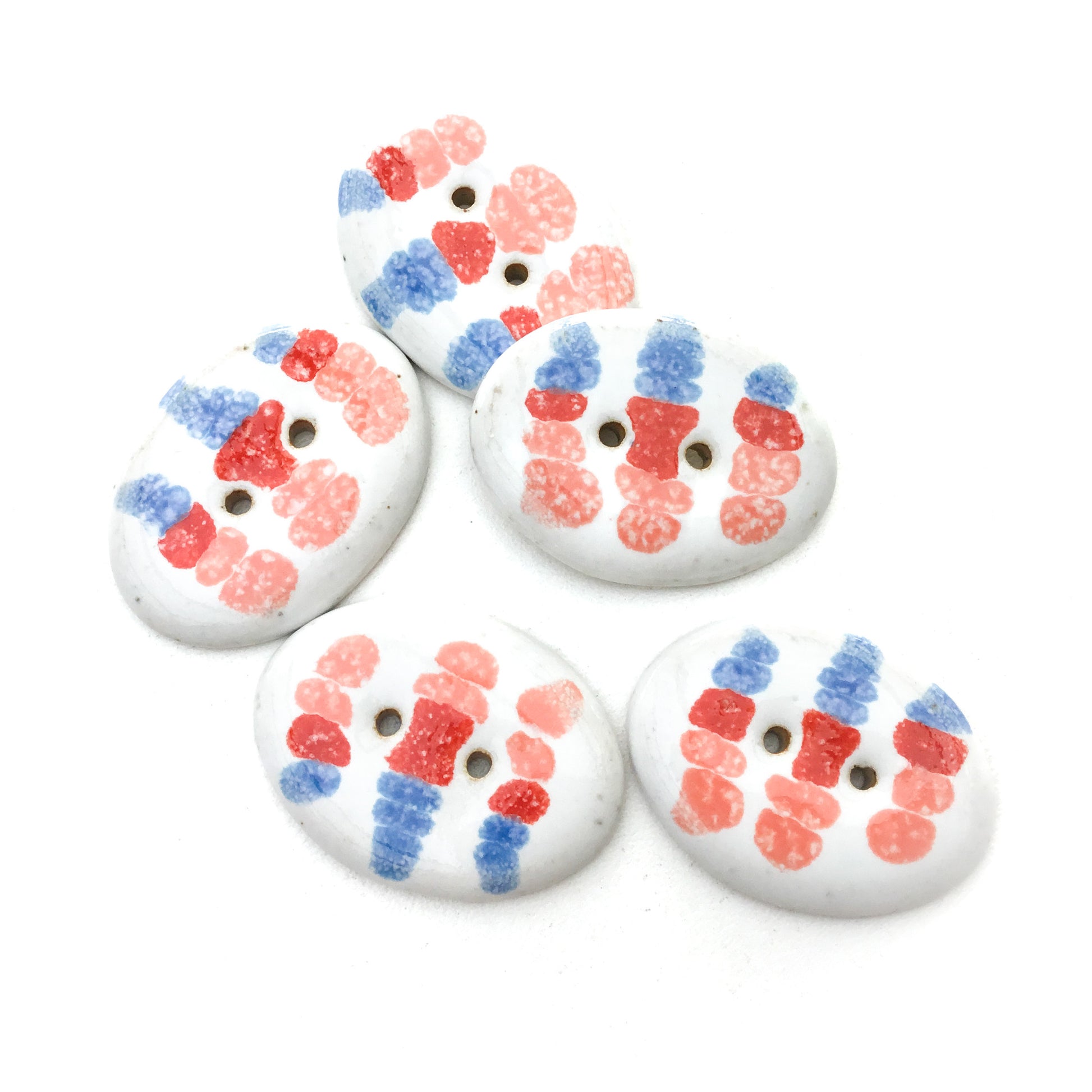 Each button and/or set is individually painted and one-of-a-kind. We sand all non-glazed edges for a smooth, snag-free surface.