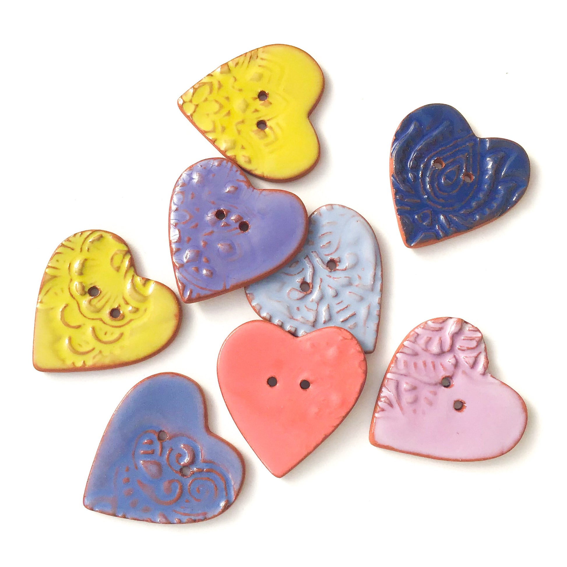 Large Stamped Heart Buttons - Soft Tones Ceramic Heart Buttons - 1 3/8"