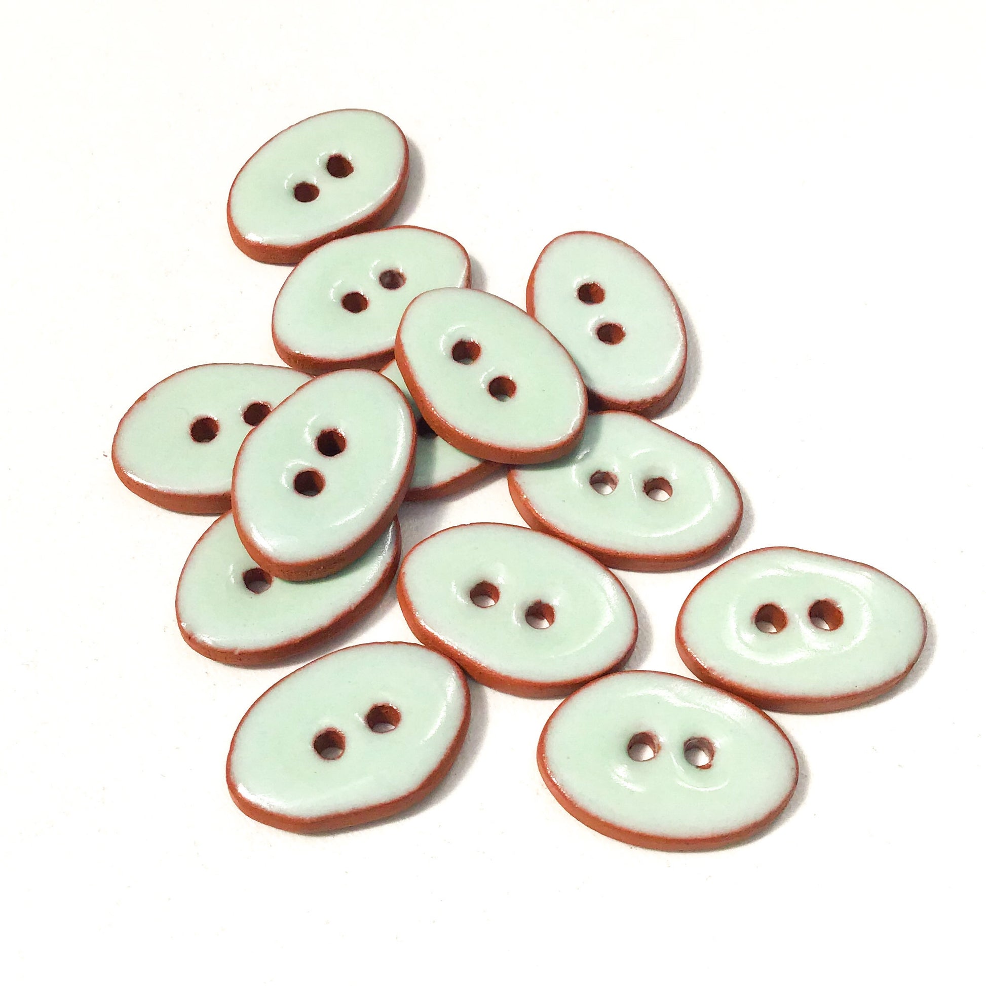 These oval ceramic buttons are lovely with their soft aqua color and the bright halo from the underlying red clay body tops them off. They'll add a darling touch to your handwork!