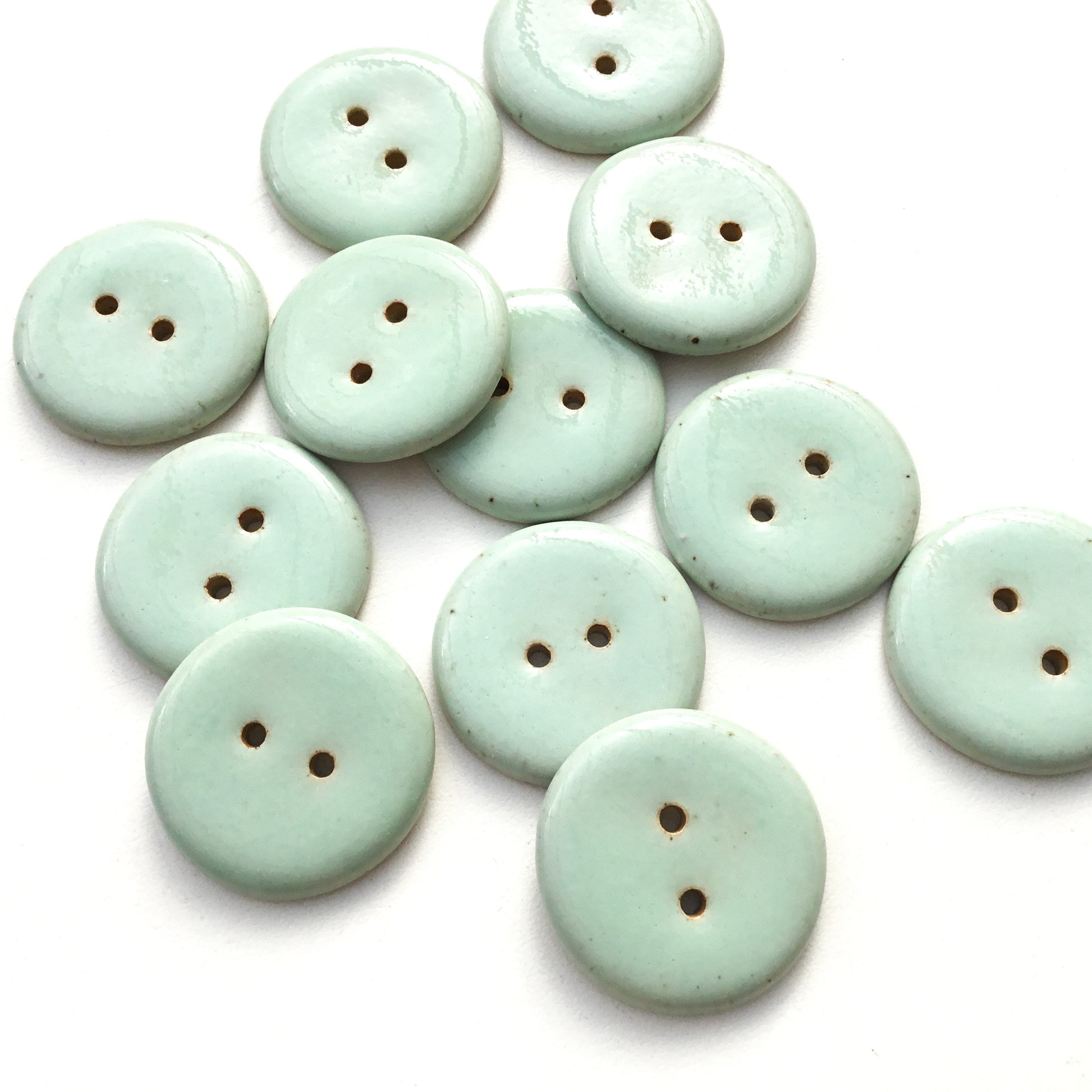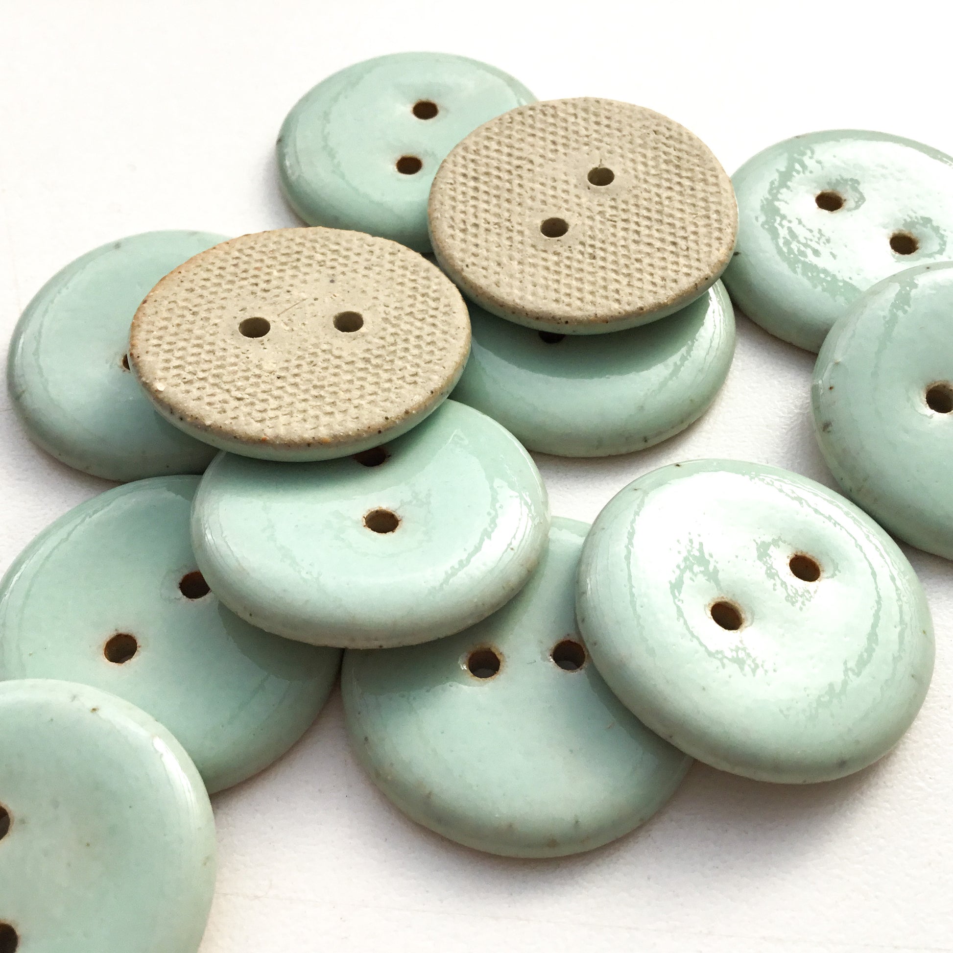 These glossy stoneware buttons in a light shade of aqua have softly rounded edges. They're perfect for an outer wear garment such as a heavy wool jacket or trench coat. They're strong and a bit heavier than most our buttons, weighing around 4 grams each. They'd make a lovely addition to your handwork!