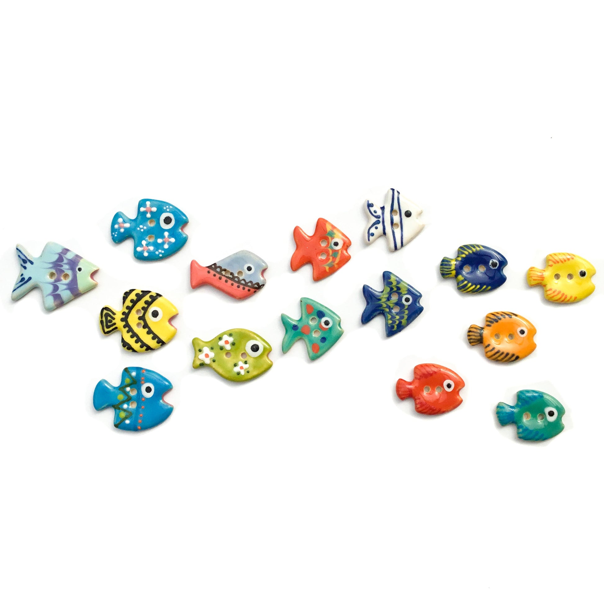 Our Limited Edition School of Fish Button Collection is made up of unique, colorful fish! Each button is hand cut and skillfully hand painted. These sweet and fun buttons will add a big bang of character to any project. They may persuade the pickiest of little dressers to wear those cherished hand knits that were made just for them, too!