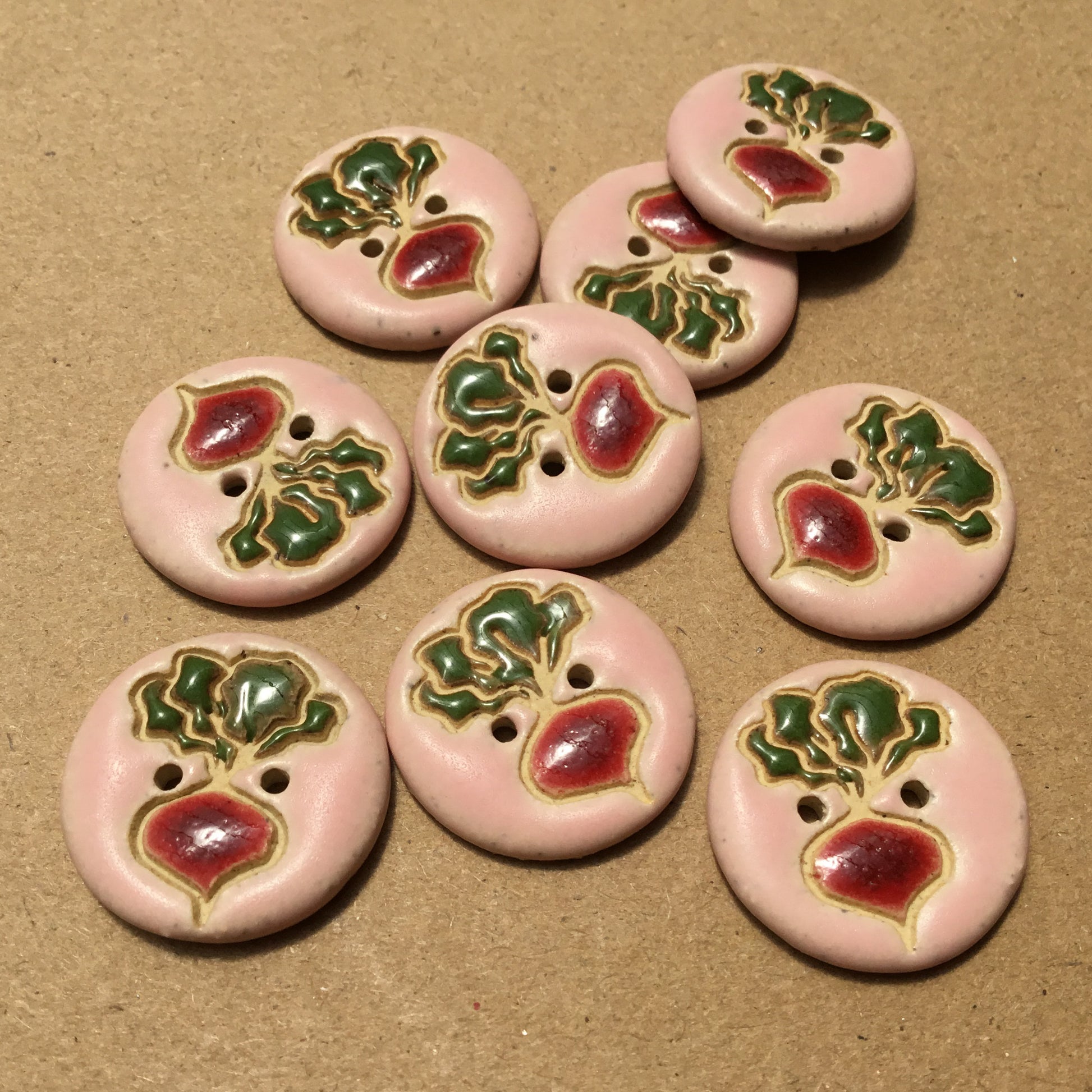 These Garden Beet Buttons are perfect for adding a unique, rustic touch to handmade clothing. Made from stoneware with a matte finish, they'll provide an earthy charm to your creations.