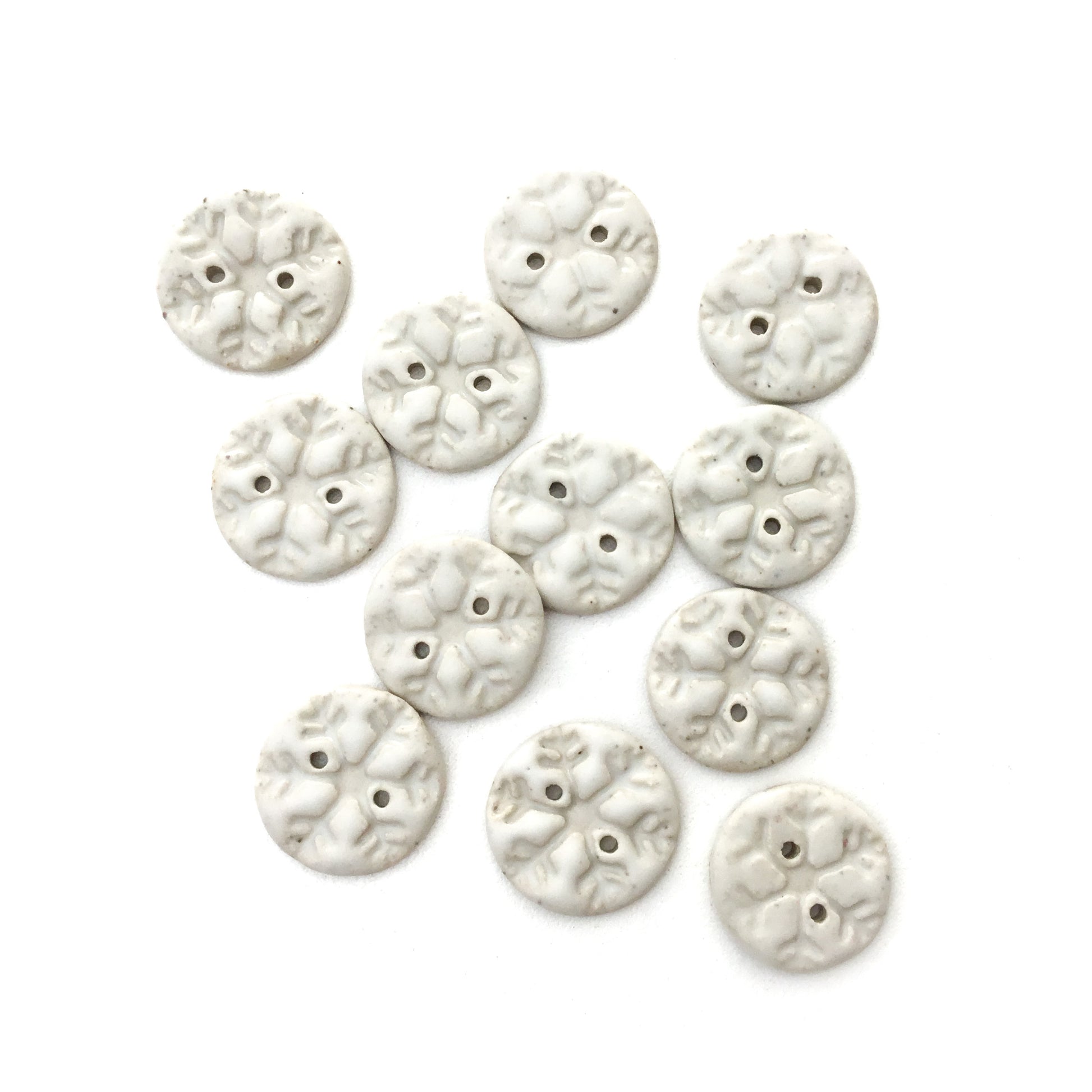 These unique hand stamped stoneware buttons have been painted with a satiny smooth matte white glaze. They'd add a lovely addition to your wintery project!