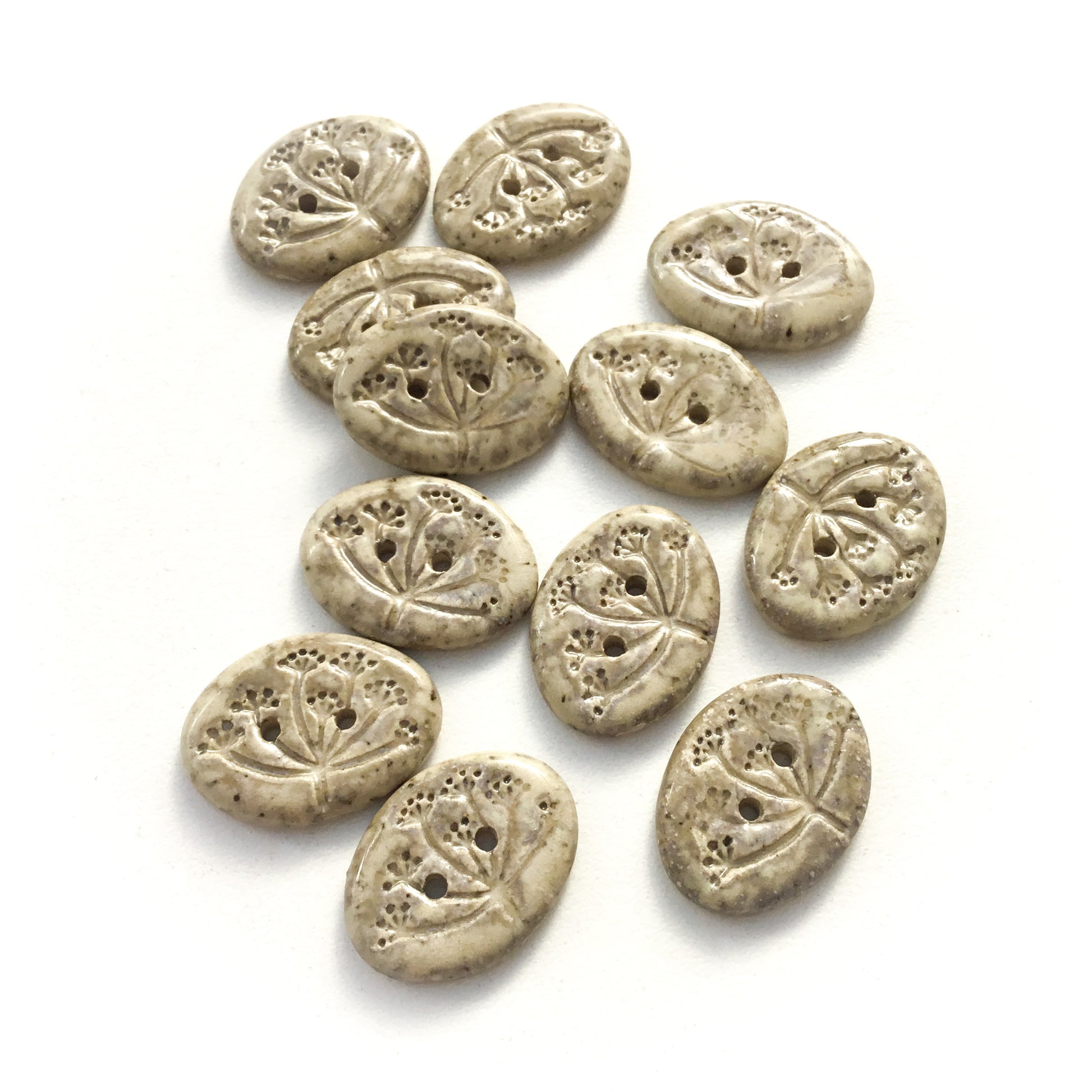 Add a handmade touch to your project with these sweet hand stamped stoneware buttons. Each features a delicate umbel-shaped floral design, perfect for giving a unique look to any creation.