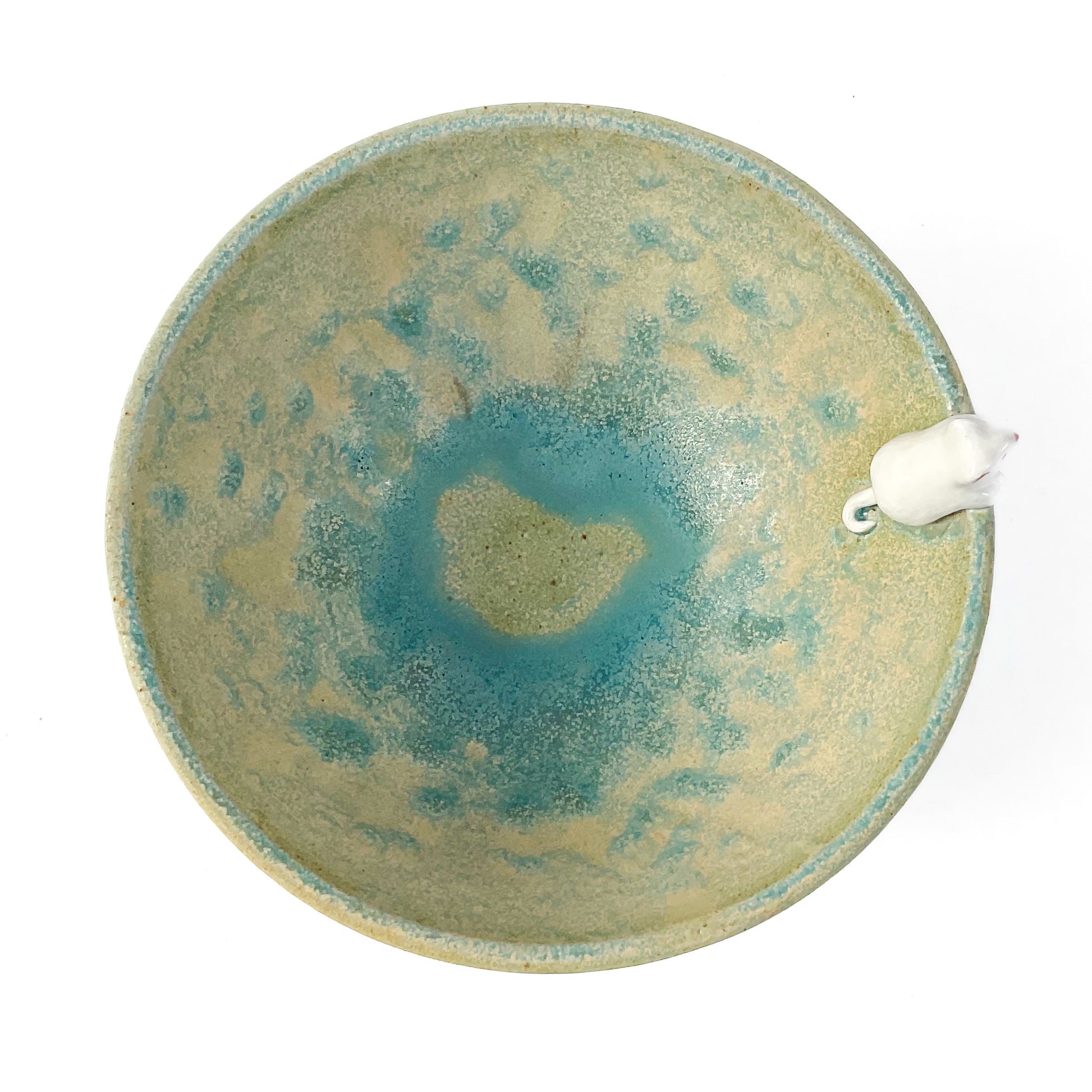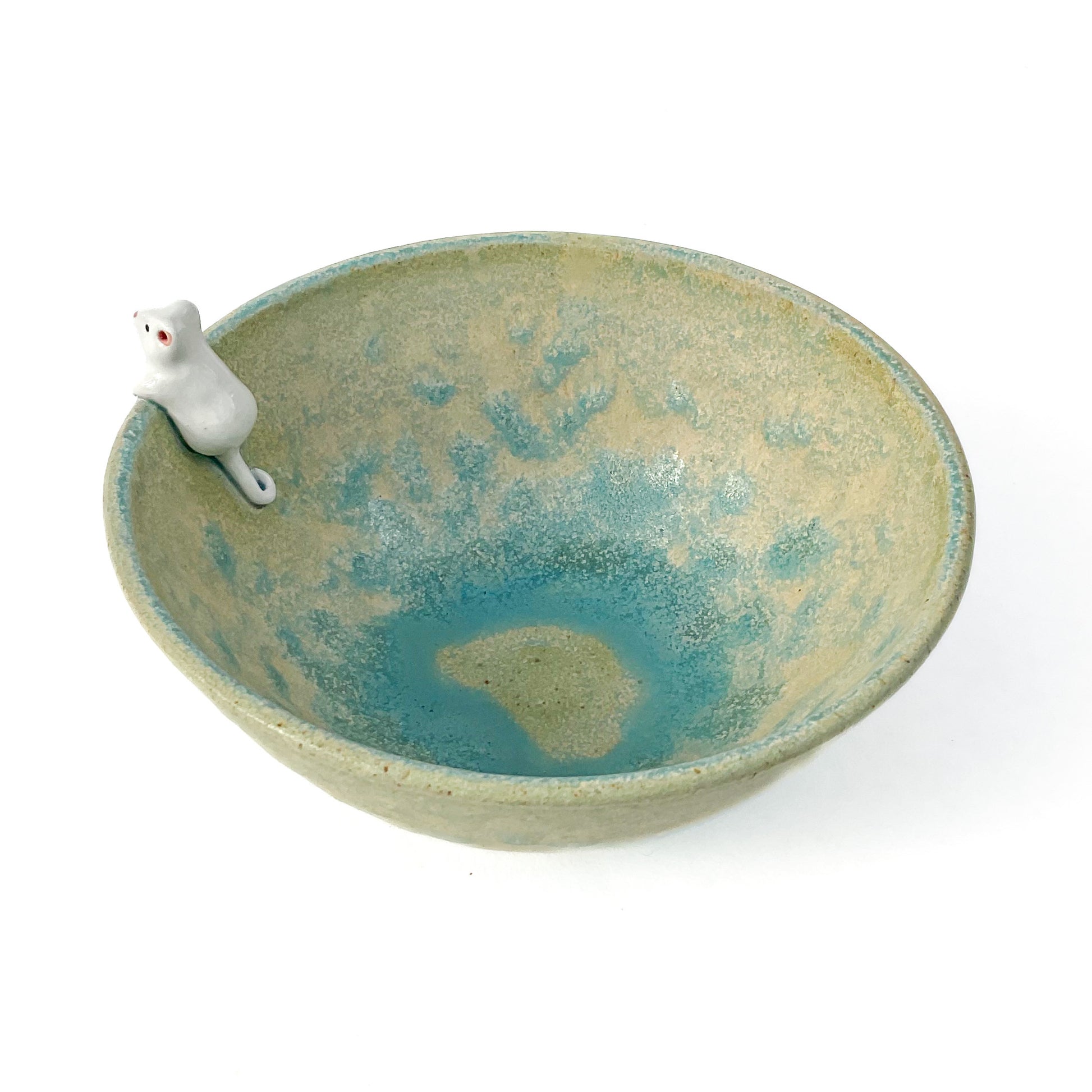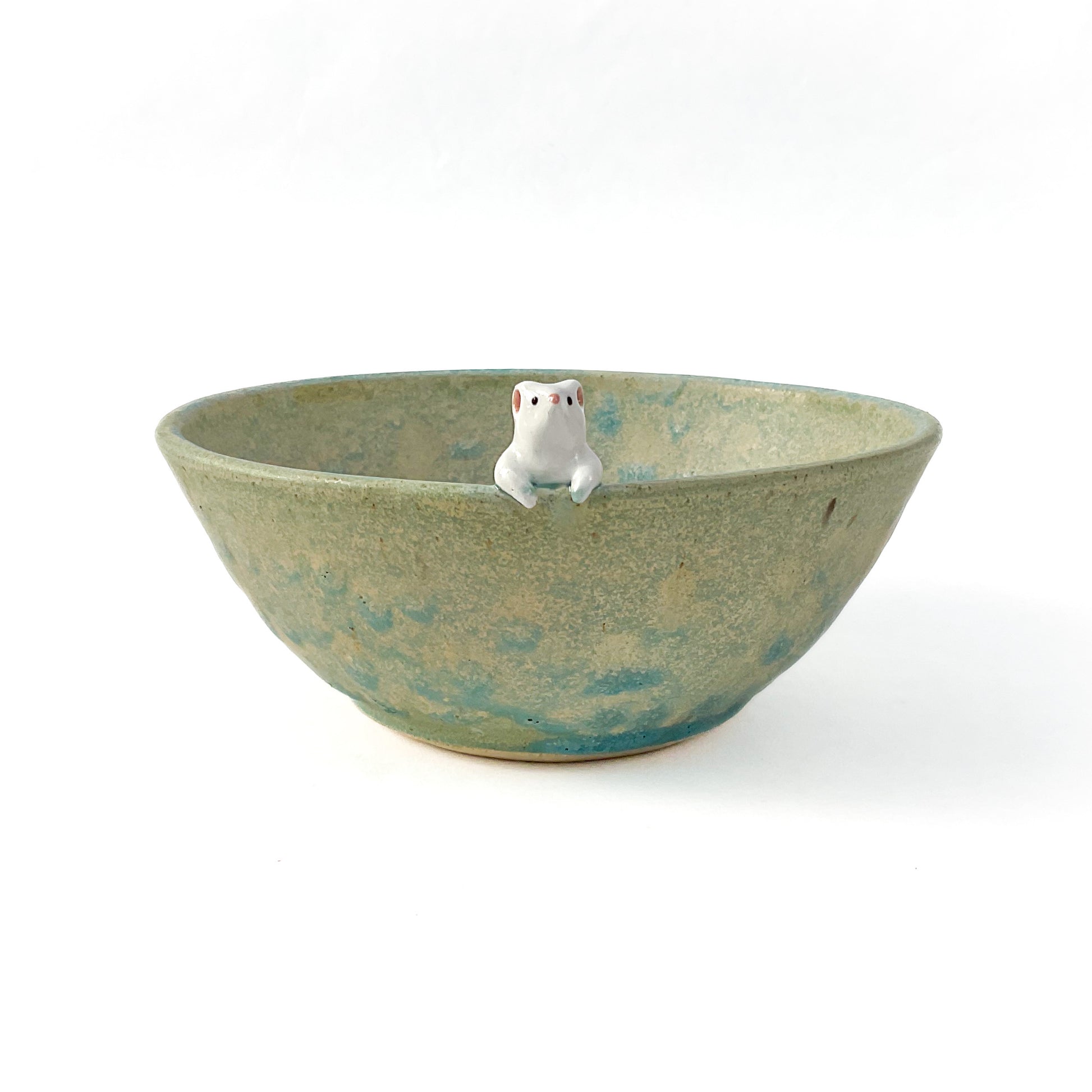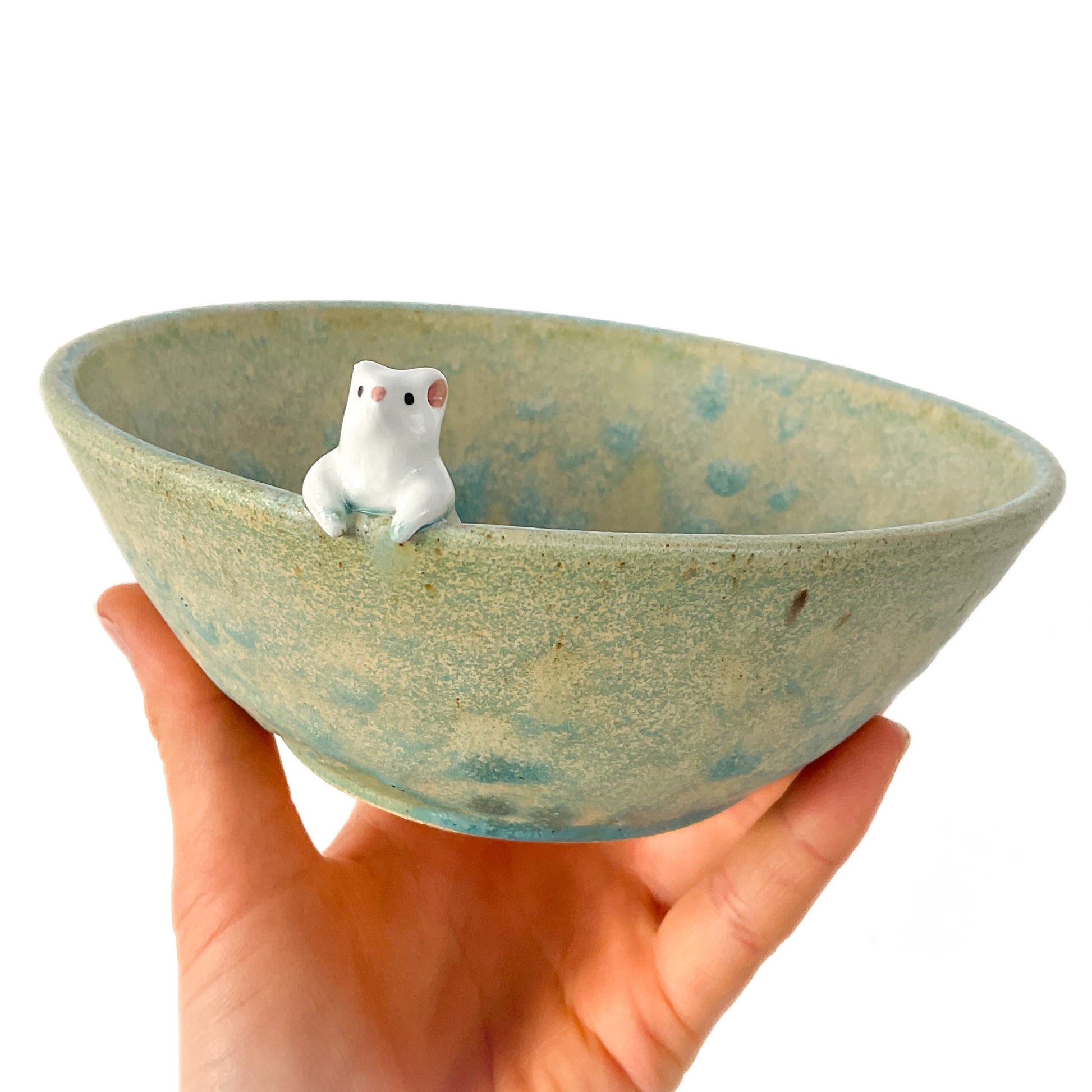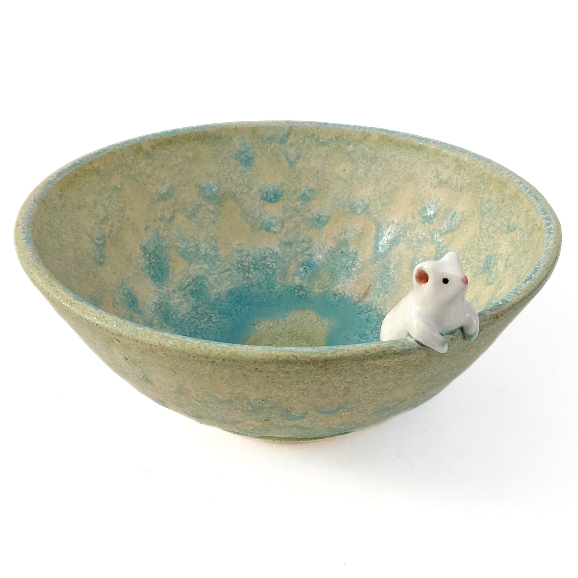 A unique, hand thrown ceramic bowl with a fun little sculpted mouse.