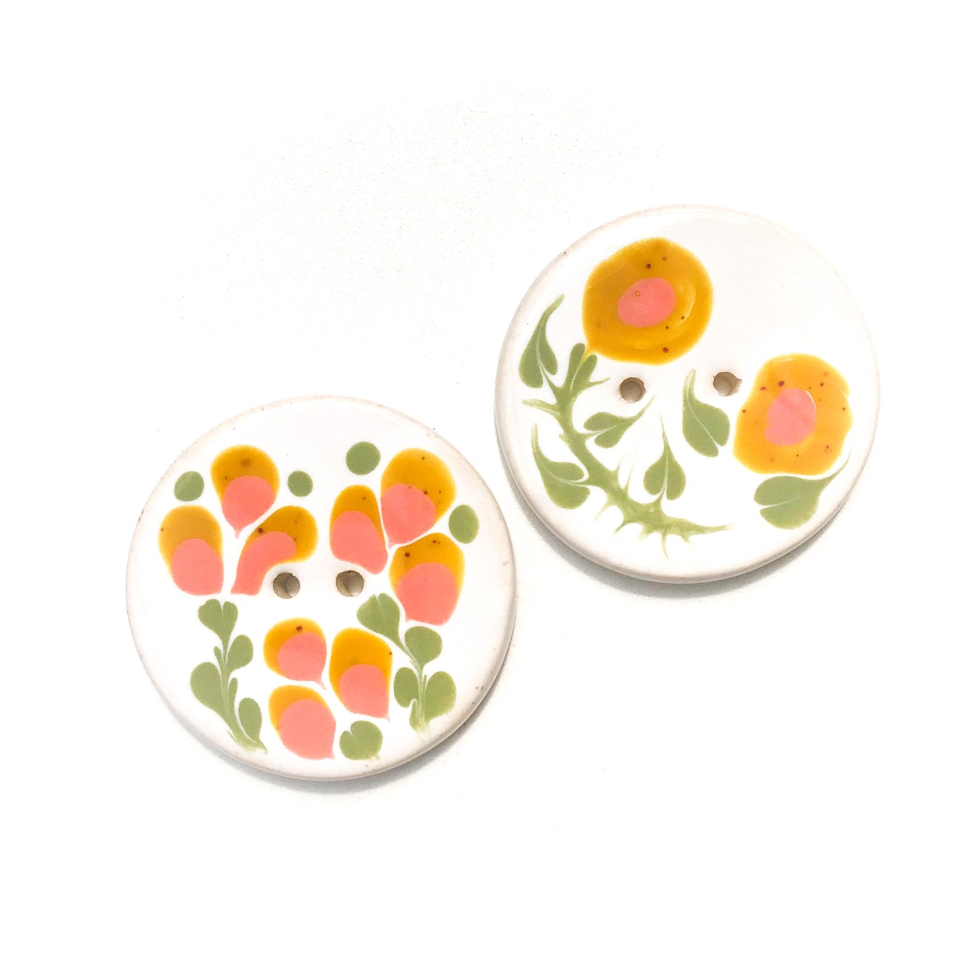 Mustard & Coral Floral Button - Large Ceramic Button - 1 7/16"