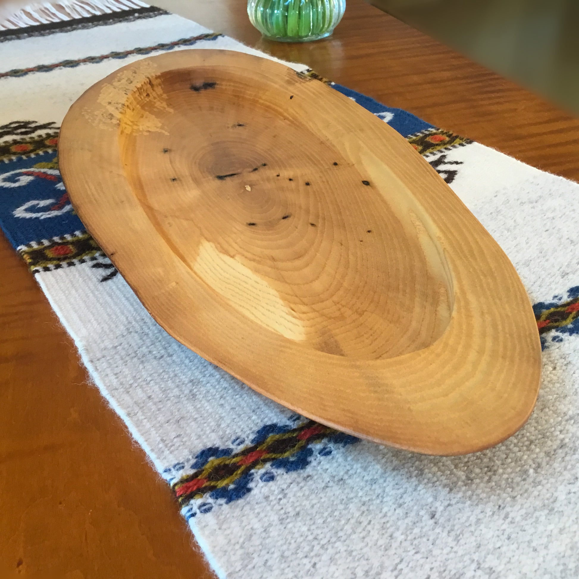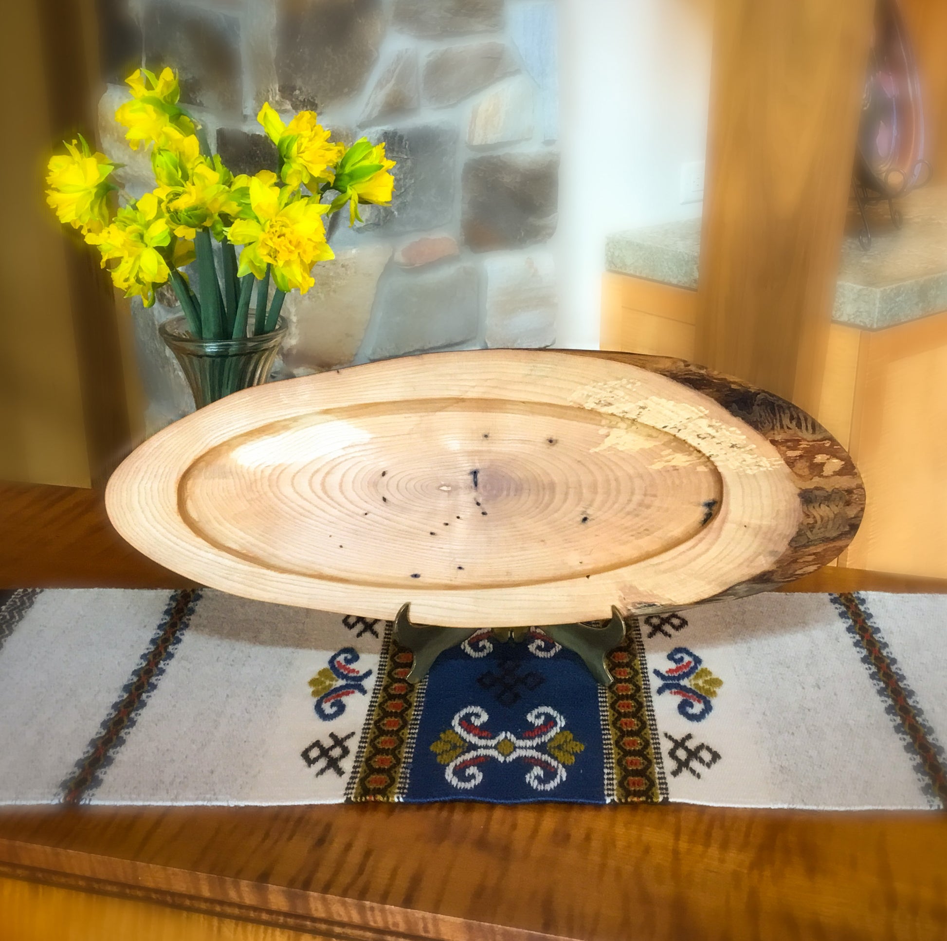 This 19" long serving tray is crafted from natural ash wood, showcasing the beauty of its organic shape and live edge. Add a unique display to your next meal gathering with this one-of-a-kind piece.