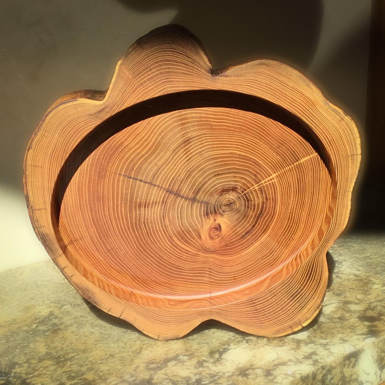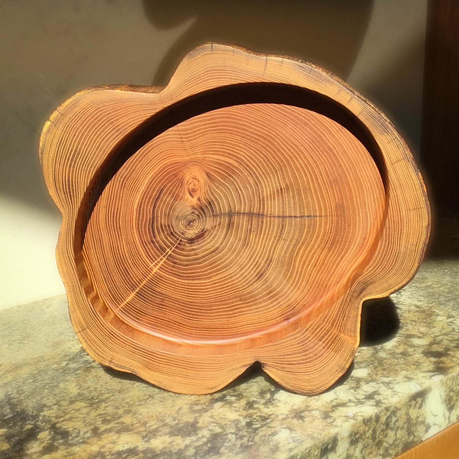 This 16" diameter bowl is crafted from natural black locust wood, showcasing the beauty of its organic shape and live edge. Add a unique, organic centerpiece to your décor with this one-of-a-kind piece.