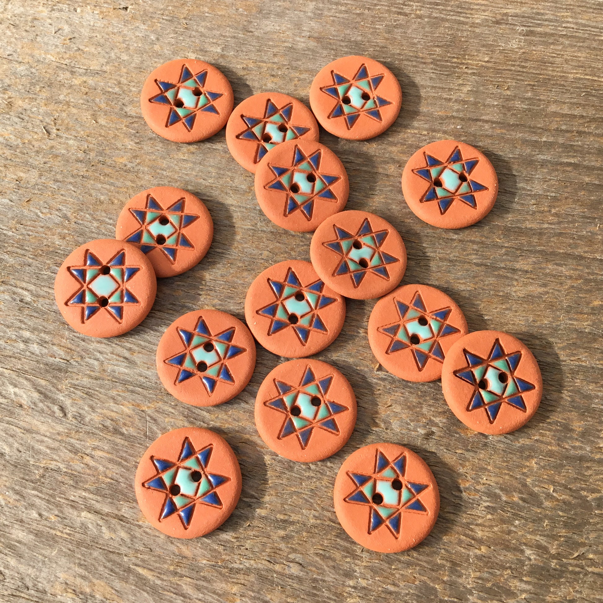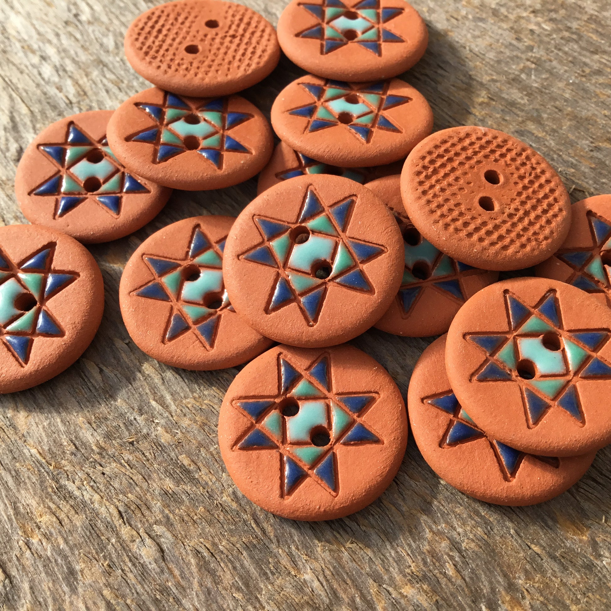 These original quilt block buttons are made using red earthenware clay. Carefully hand painted in blue tones, they’ll add a fun and unique touch to any project!