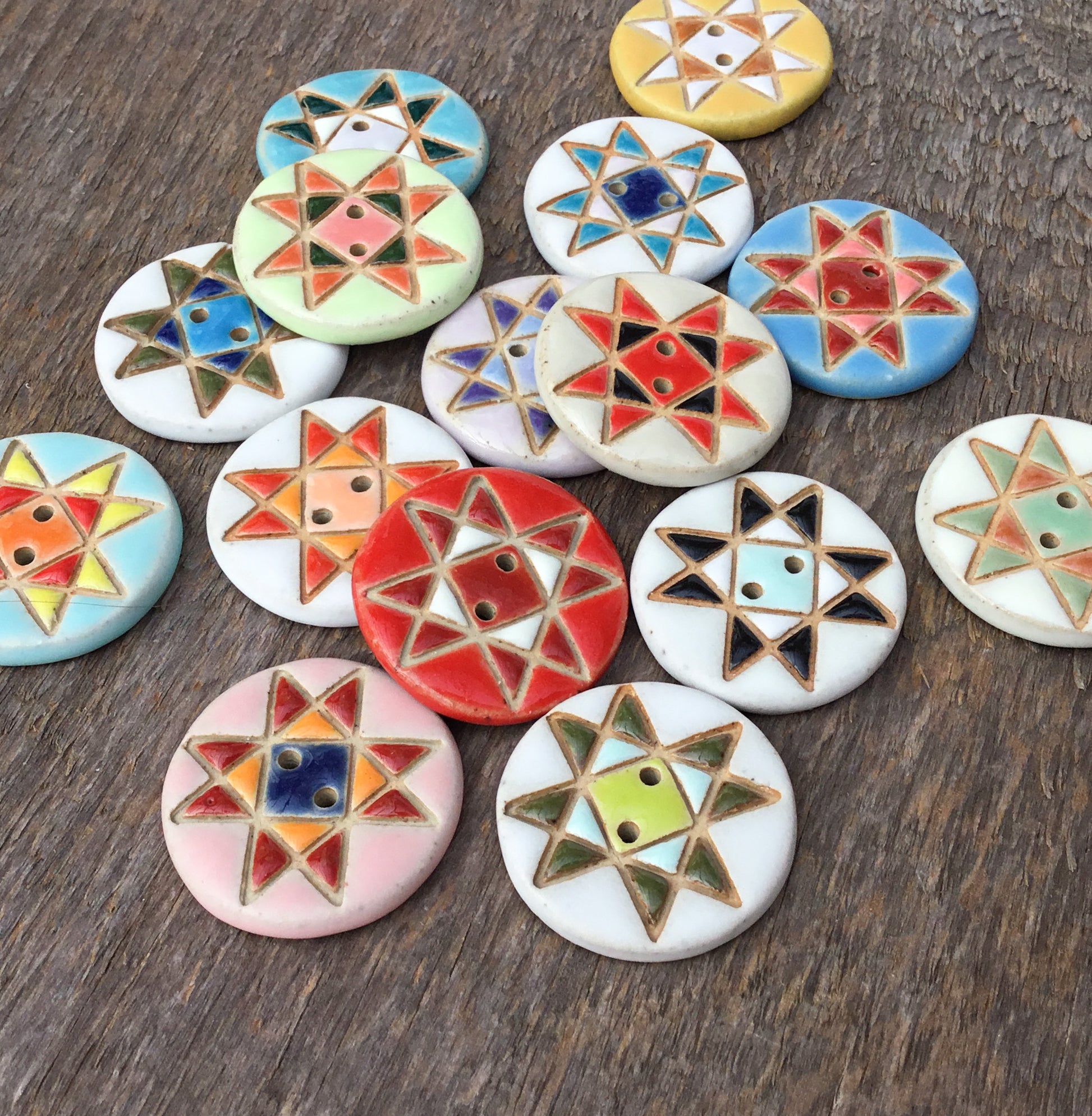 These original quilt block buttons are made using stoneware clay. Carefully hand painted with complimentary colors, they’ll add a fun and unique touch to any project!