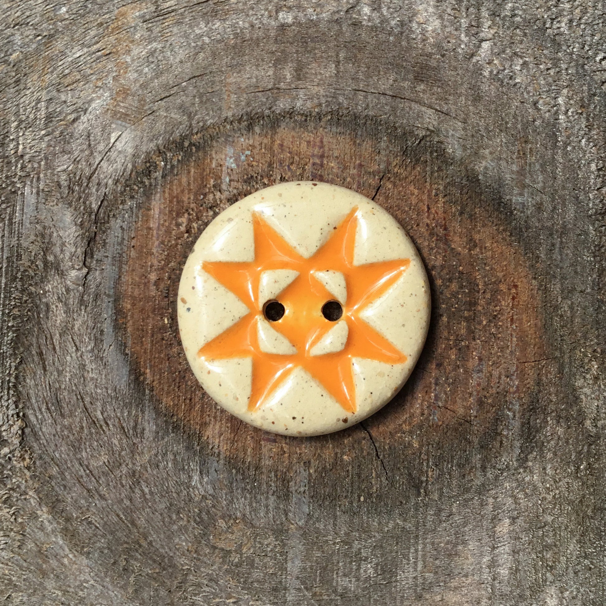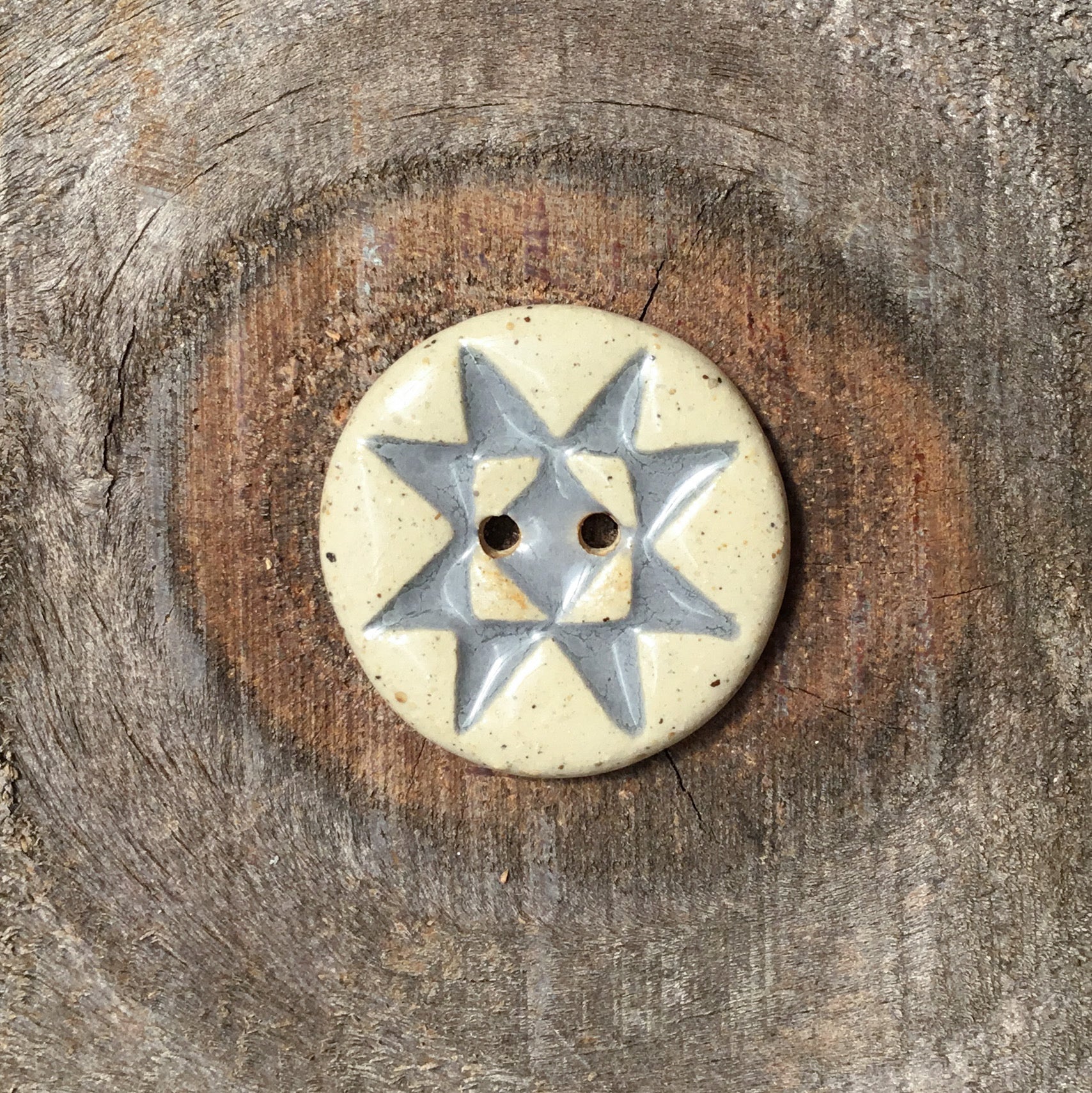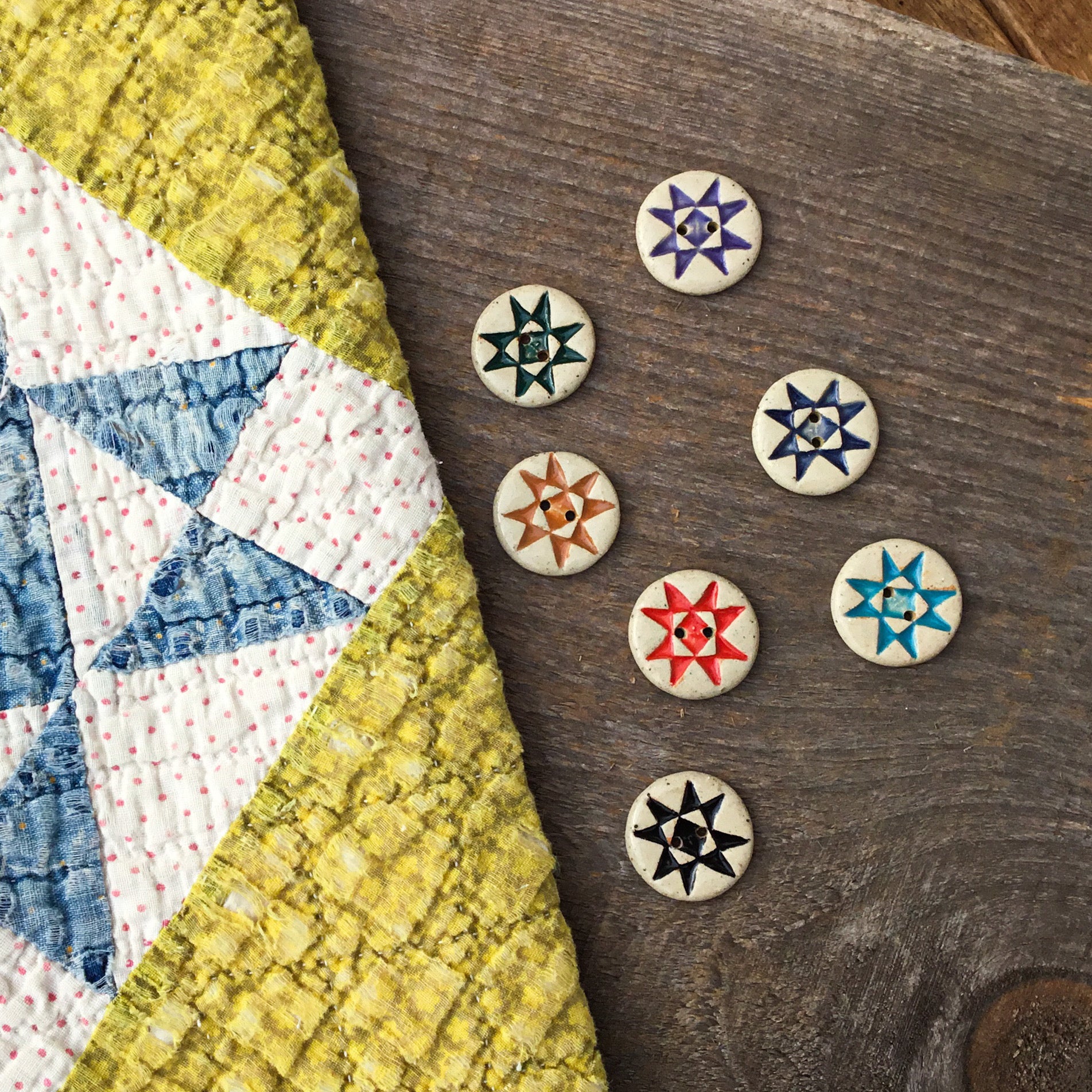 These unique quilt buttons are made by stamping raw stoneware clay with a hand-carved stamp. The stamped portion is then filled with colored glaze, wiped clean, and the background clear-coated to display the pretty flecks in the clay. Softly rounded edges and a glossy surface give these buttons a nice feel in the hand while the handmade imperfections lend a simple and rustic charm.