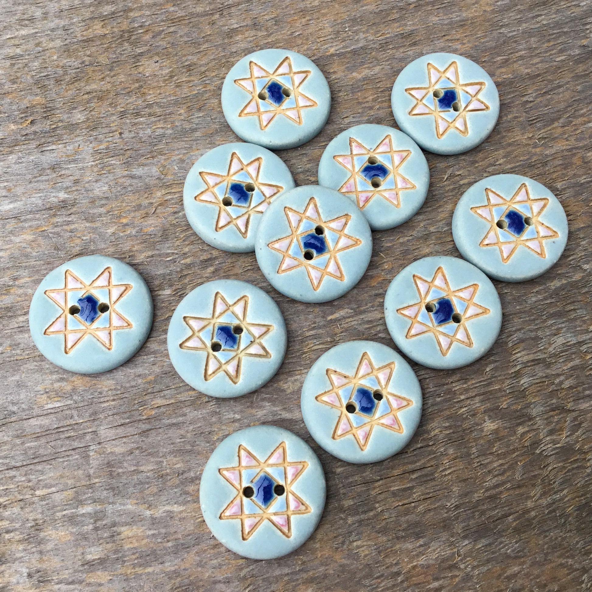 These original quilt block buttons are made using stoneware clay. Carefully hand painted in soft, wintery tones. They’ll add a fun and unique touch to any project!