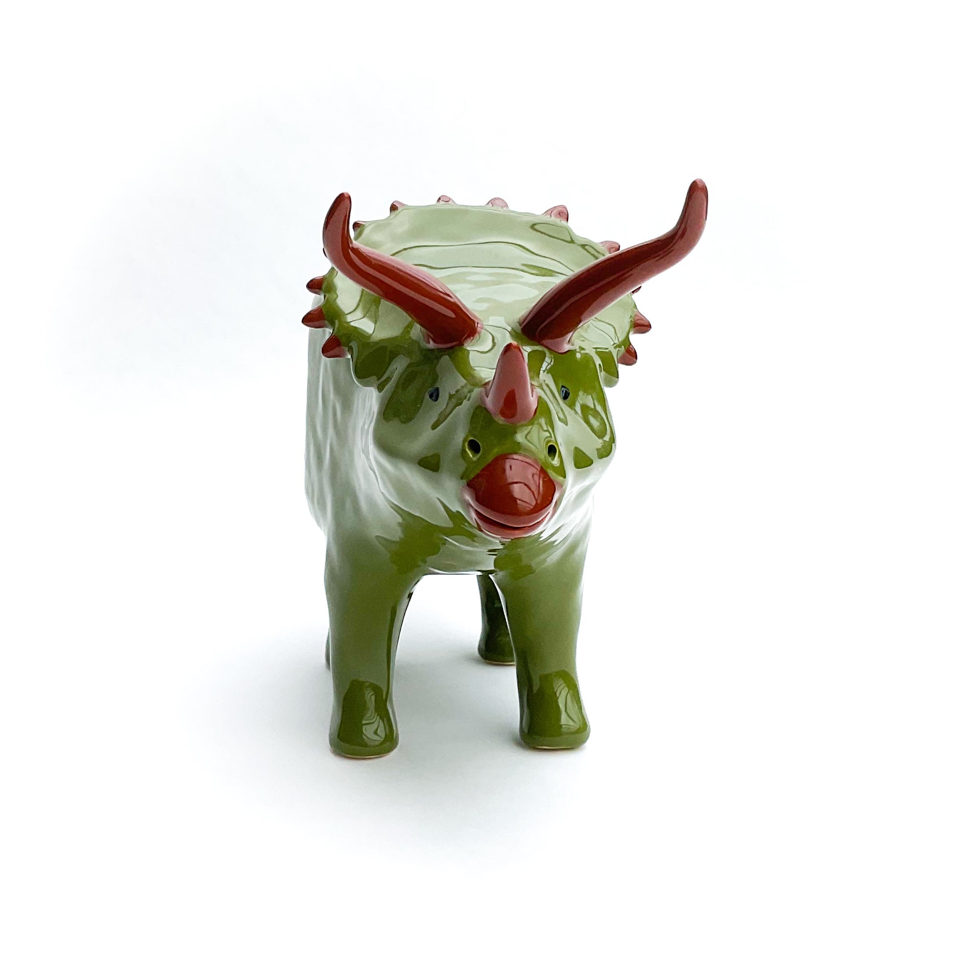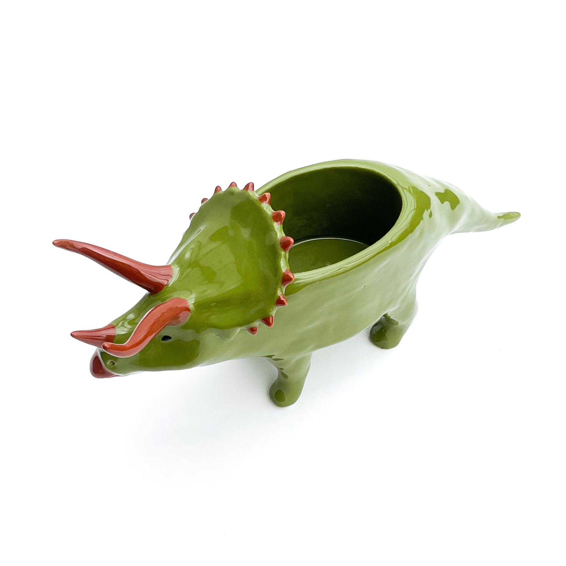 A ceramic triceratops planter, with some fierce dino horns, to pot up your favorite plant or use as a dish for candy and more.
