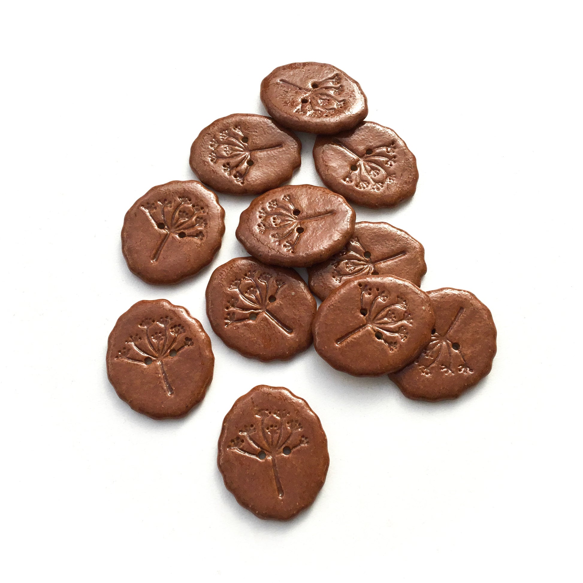 Add a handmade touch to your project with these lightly scalloped, hand stamped stoneware buttons. Each features a delicate umbel-shaped floral design, perfect for giving a unique look to any creation.