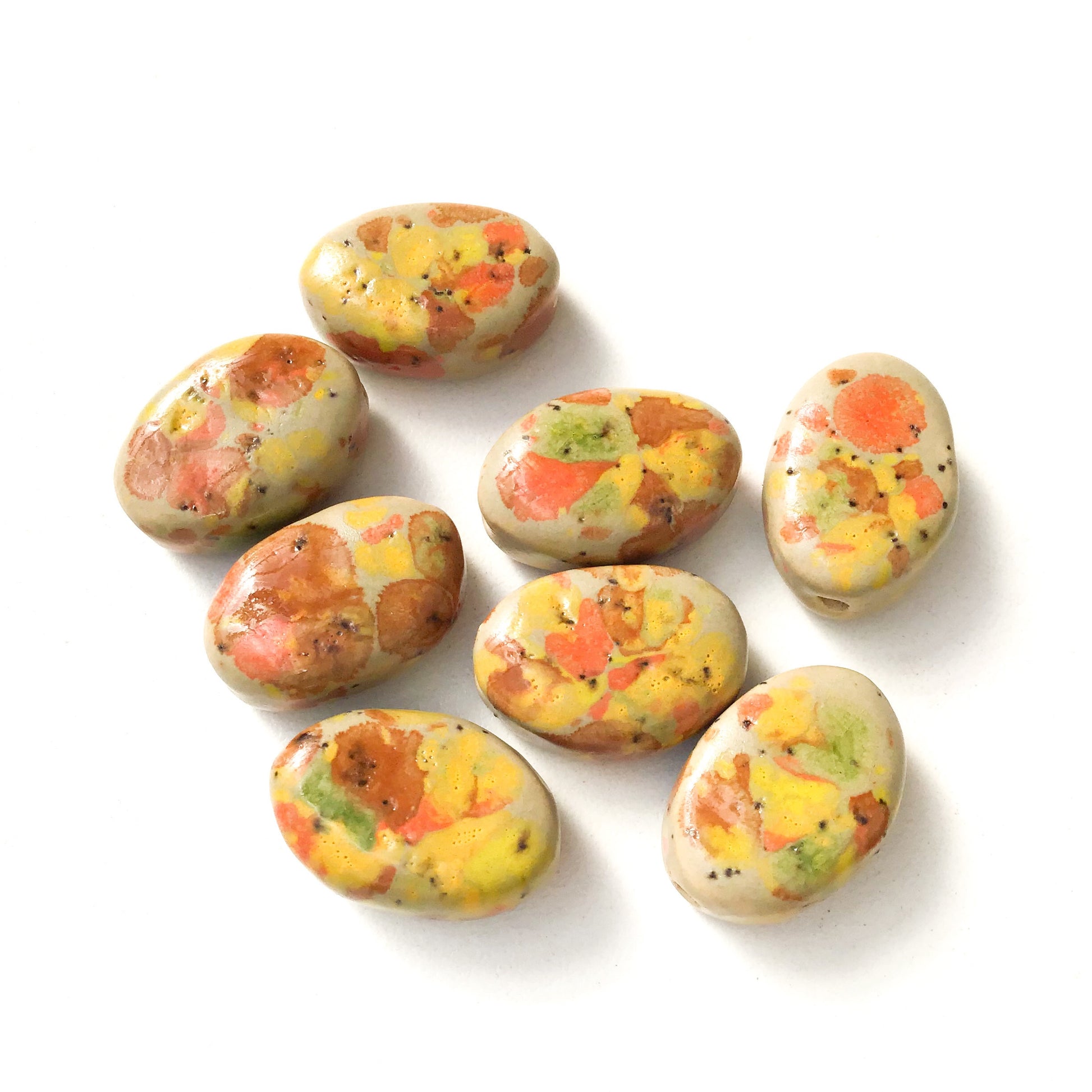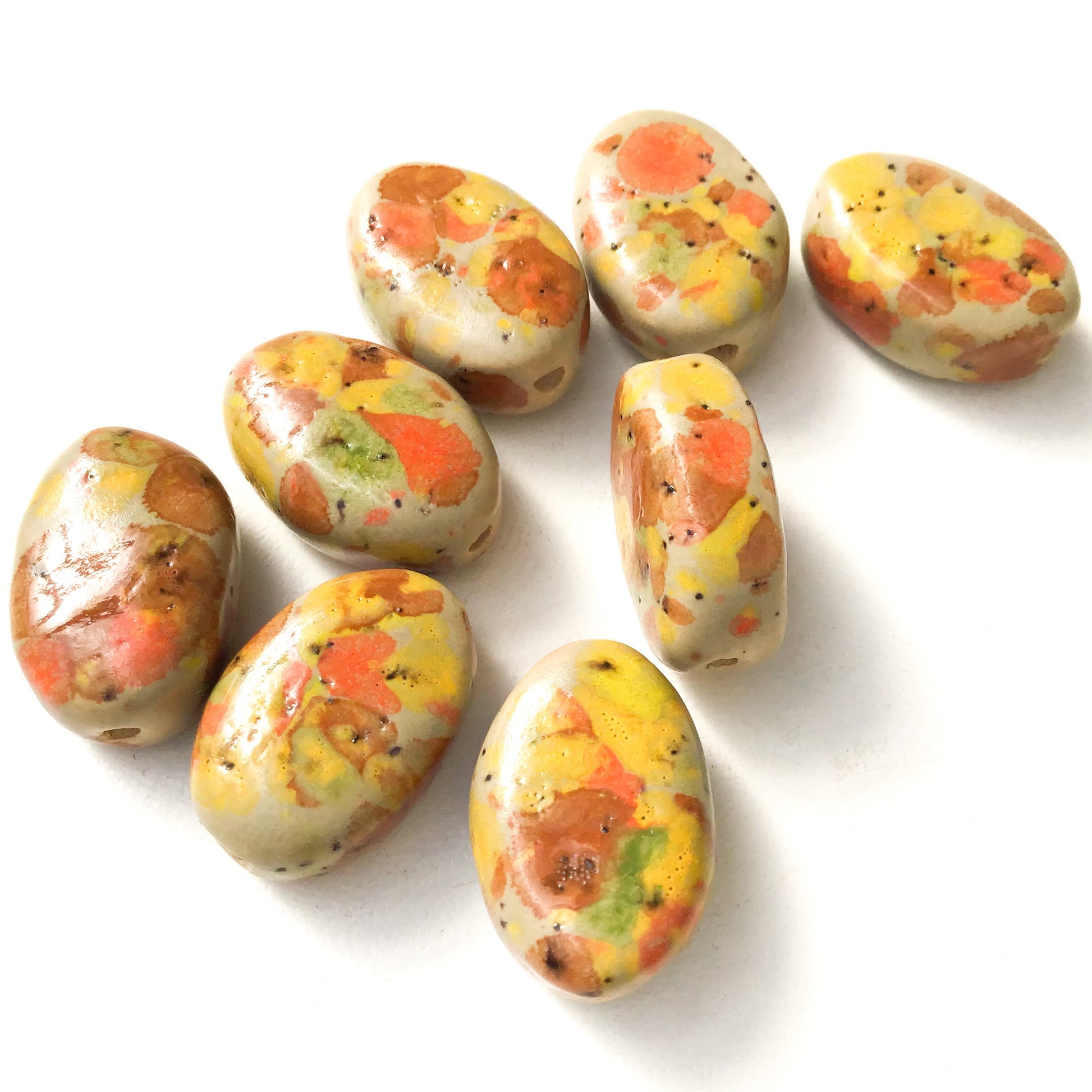 Oval Handmade Beads - Ceramic Beads in Sage Green, Orange, & Yellow - 13/16" x 1/2"