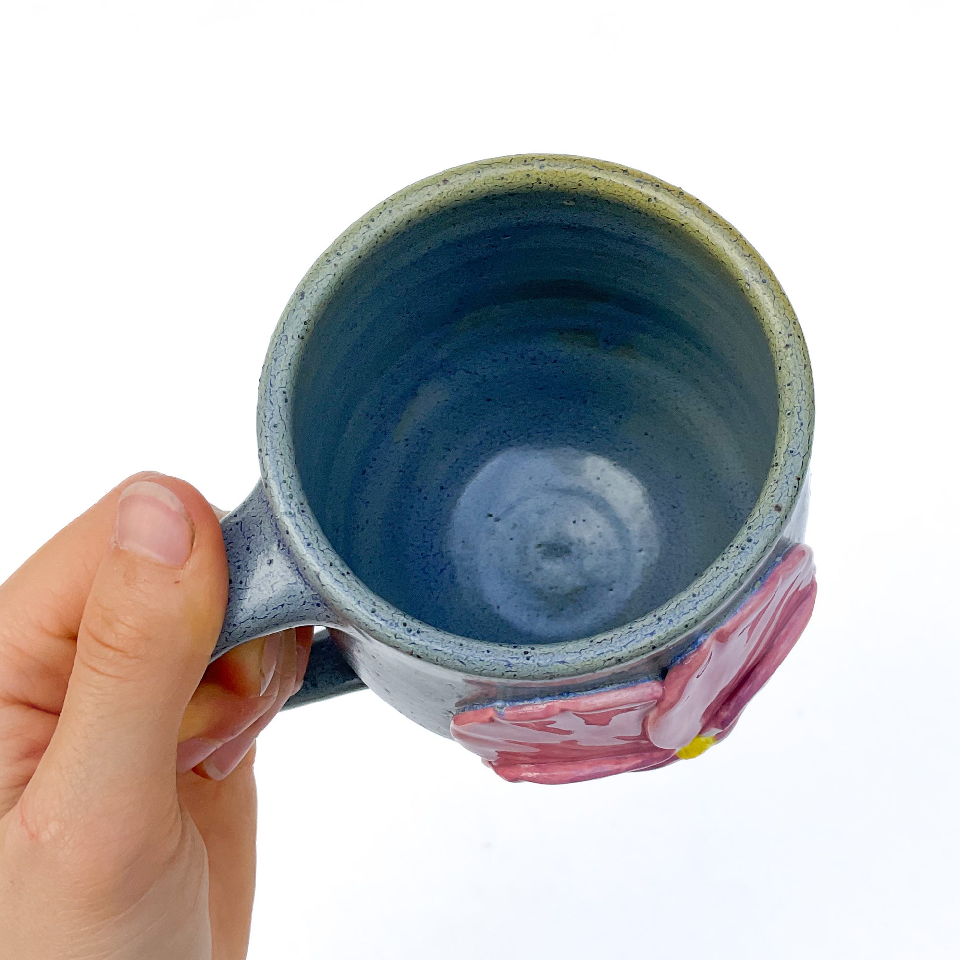 This unique hand sculpted flower mug, crafted by Hoof Print Pottery in southeast Ohio, is a one-of-a-kind masterpiece! Every detail of this original mug is skillfully made by hand, one petal, bud, and leaf at a time. After each small piece is sculpted it is adhered to the unfired mug using only clay and water. After the raw clay mug is thoroughly dried it is bisque fired in the kiln to 1,945°F. When the mug is cooled it is then hand painted and refired (glaze fired) to 2,300°F.