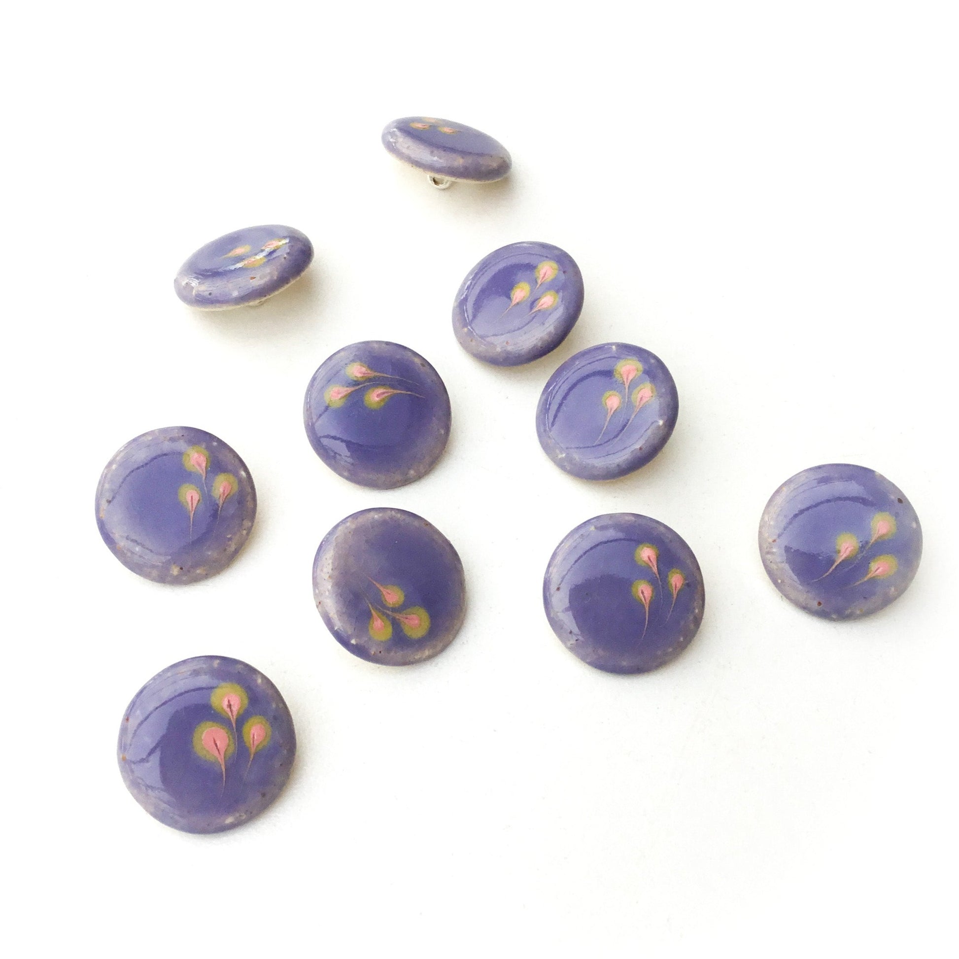 Each button and/or set is individually painted and one-of-a-kind. We sand all non-glazed edges for a smooth, snag-free surface.